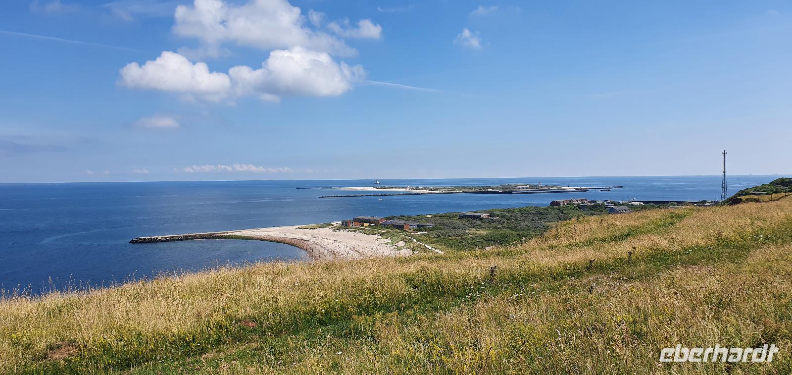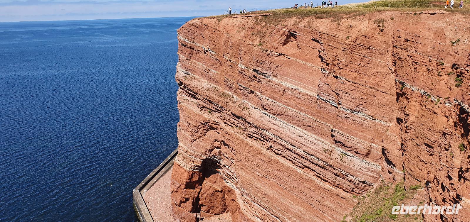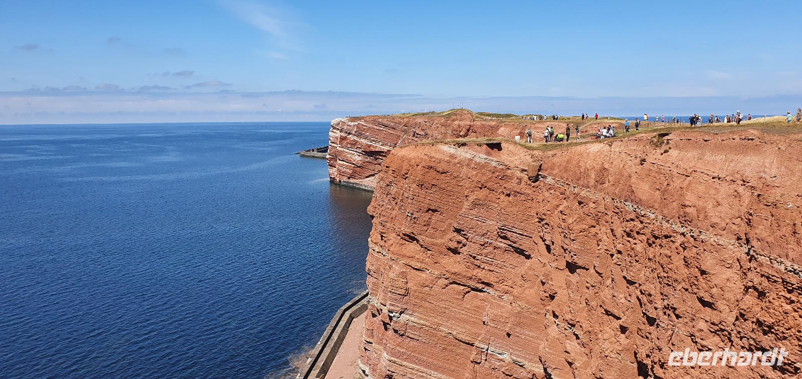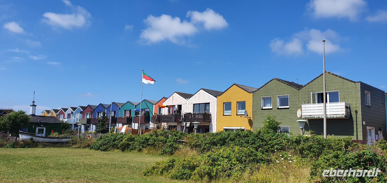 Hier können wir bereits die berühmten Hummerbuden sehen, ehemalige Materiallager und Schuppen der Fischer, heute liebevoll restauriert und farbenfroh gestaltet. Da es derzeit keine geführten Wanderungen gibt spazieren viele den Klippenrandweg entlang. Zunächst geht es hinauf zum Oberland. Hier können wir an den Klippen entlang laufen und erreichen den Lummenfelsen. Trottellummen und