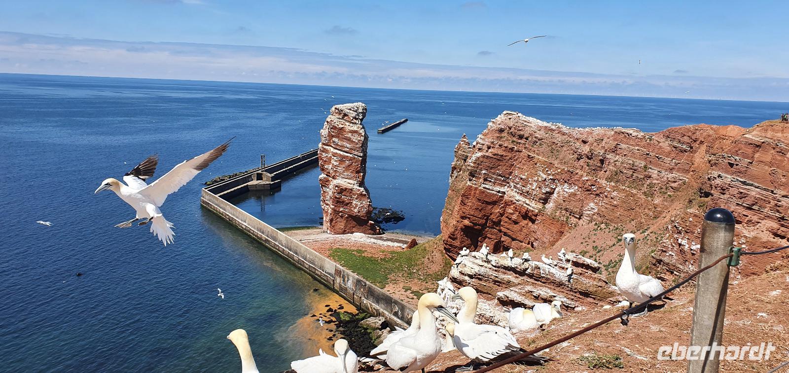 brüten hier. Ganz nah kann man herangehen und den Basstölpeln zusehen, wie sie majestätisch gleiten oder dicht an dicht ihre Jungen behüten. Ihre Flügelspannweite kann bis zu 1,73 Metern betragen- absolut imposant. Dann kommt der Blick auf die