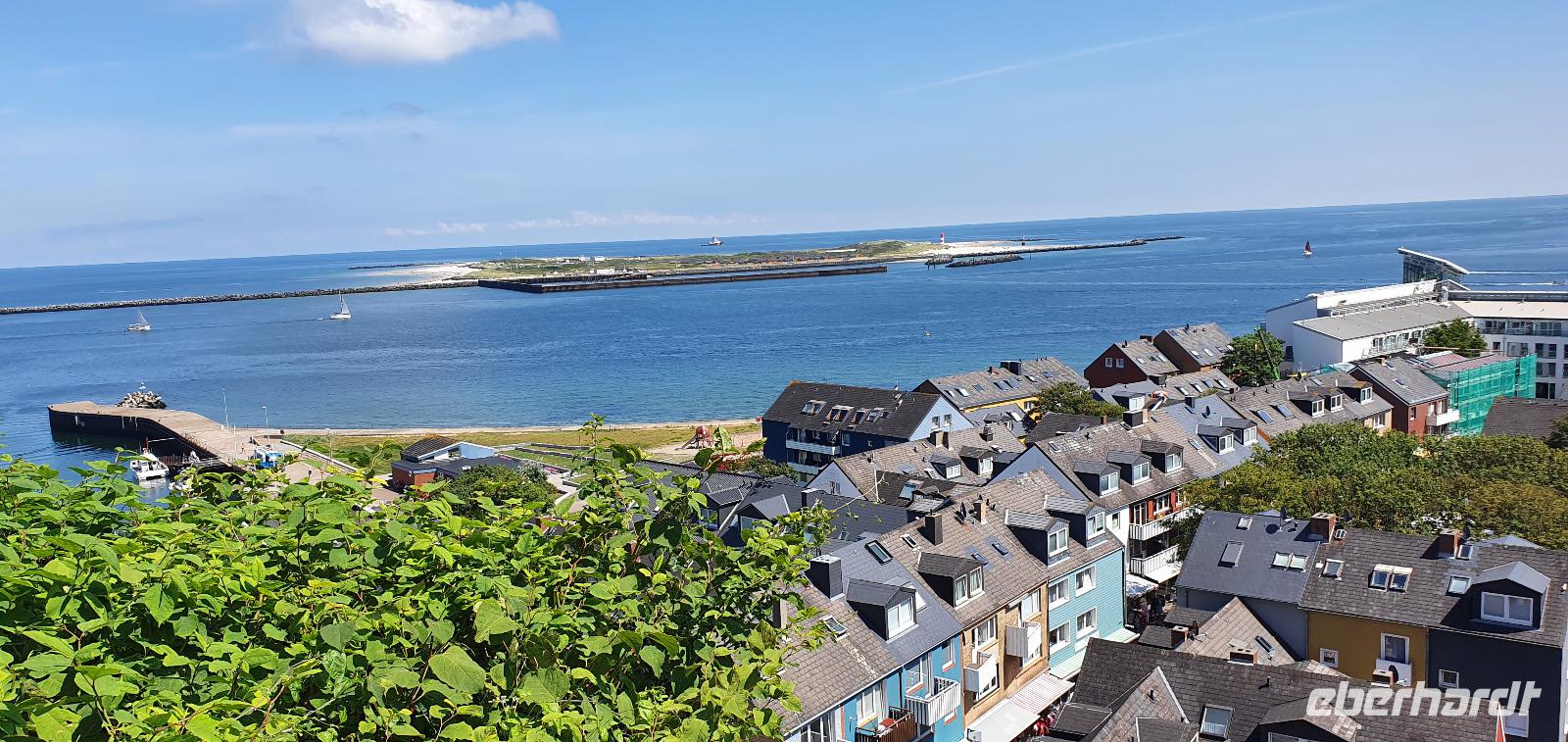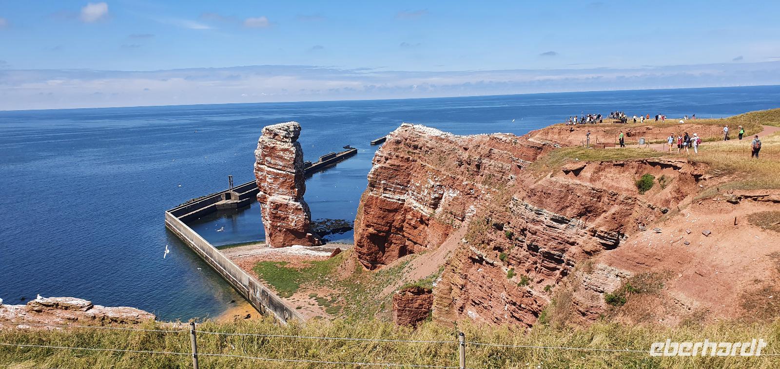 dem Wahrzeichen Helgolands schlechthin. Wir haben Sonne, strahlendblauen Himmel und den roten Buntsandstein der Felsen- ein tolleres Bild kann man nicht bekommen. Der Weg führt nun zurück zur Stadt und man kann entscheiden, ob man mit dem Fahrstuhl in das Unterland fahren möchte oder die Treppen nimmt. Überall locken nun Geschäfte mit dem zollfreien Einkauf vielerlei Waren. Es ist genügend Zeit für einen Mittagsimbiss und auf jeden Fall für ein Eis. Dann treffen wir uns am Anleger wieder. Die Rückfahrt dauert nochmals knapp 3 Stunden und unsere Busfahrt nach Husum nochmals eine, also wird es heute später mit dem Abendessen. Aber darauf hatten wir uns eingerichtet, auch die Gäste, die diesen fakultativen Ausflug nicht mitgemacht hatten. Und so verabschieden wir uns mit einem vorzüglichen Abendessen in die Nacht.