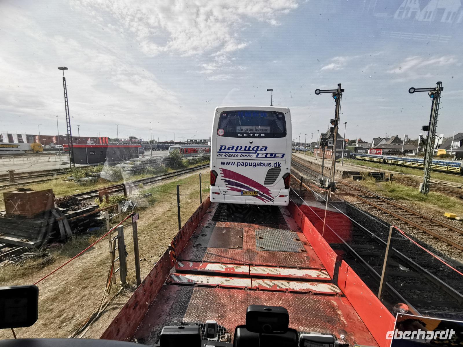 Wir verbringen etwas Zeit hier am schönen Strand, tauchen die Füße bei 29 Grad Außentemperatur in erfrischendes Nordseewasser und fahren dann zur Sylt Shuttlebahn nach Westerland zurück. Sicher und souverän lenkt Frank den Bus auf den Zug und wir kreuzen auf Schienen rückwärts durch die offene Nordsee. Das ist natürlich ganz spannend, so eine "Fahrt" mal mitzuerleben. In Niebüll verlassen wir die Schienenstränge wieder und machen uns auf den Rückweg nach Husum, jetzt wieder vorwärts fahrend.