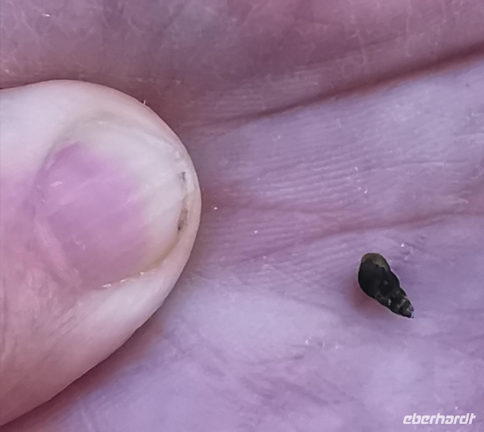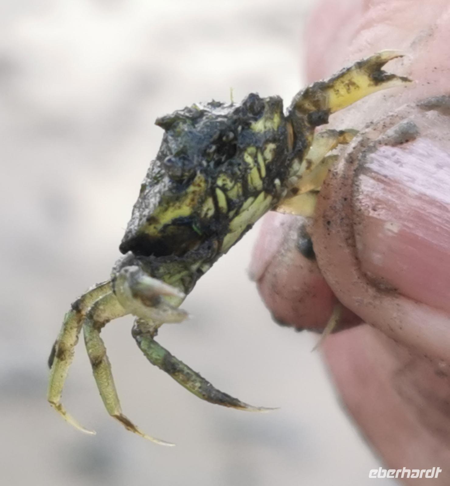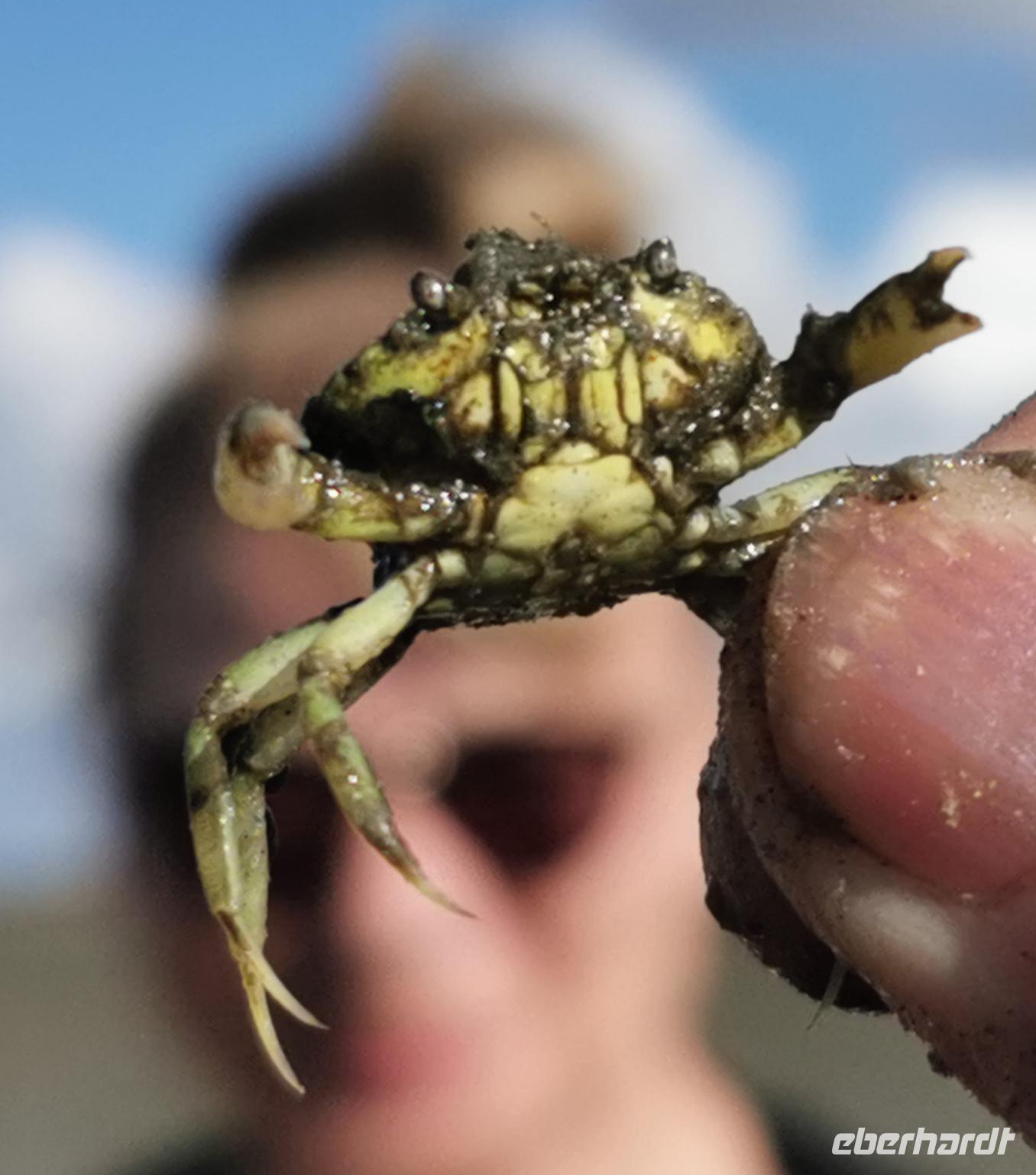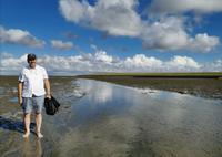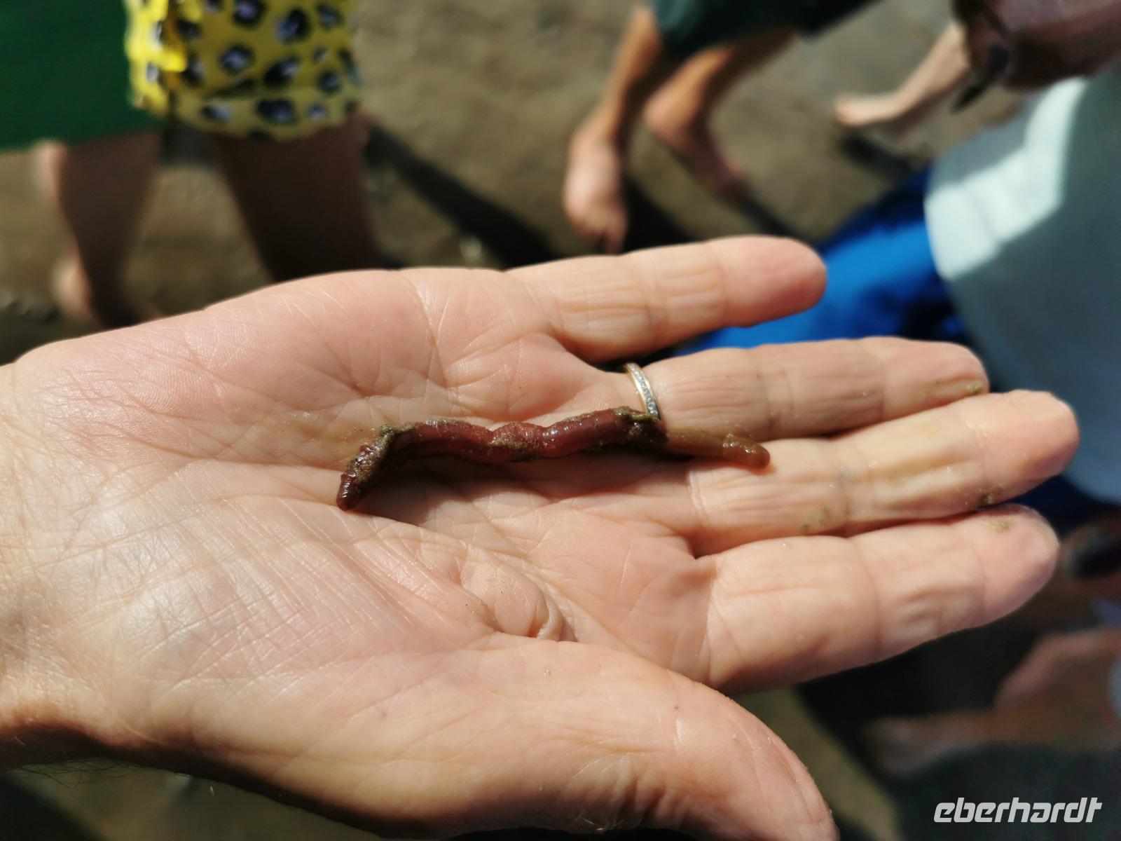Zuerst fahren wir allerdings zum Nordstrand. Der Damm hier wurde 1935 erbaut. Auf ihm fahren wir die Küste entlang. Dann ziehen wir die Schuhe aus und barfuß waten wir ins Watt. Das Gefühl, auf Meeresboden zu laufen ist unbeschreiblich und Hilke zeigt uns immer wieder, wieviel Leben im Watt steckt. Angefangen natürlich mit den bekannten Wattwürmern, die den Sand regelrecht filtern und dann wieder ausscheiden, was aussieht wie schwarz gefärbte Spaghetti . In den Löchern im Sand aus denen Luftblasen aufsteigen leben Muscheln, die, seitdem sie geschützt werden, eine beachtliche Größe erreichen können. Erst wenn alles ruhig ist ringsum zeigt sich ein kleiner Rüssel zum Luft-Holen. Kleine und größere Krebse drehen und wenden wir, ist es nun ein Männlein oder ein Weiblein? Alle Gäste, die vorher skeptisch waren, ob es nicht zu kalt, zu klebrig, oder zu rutschig sei, sind absolut begeistert vom Watt und bei dem tollen Wetter würden wir gern noch länger bleiben.