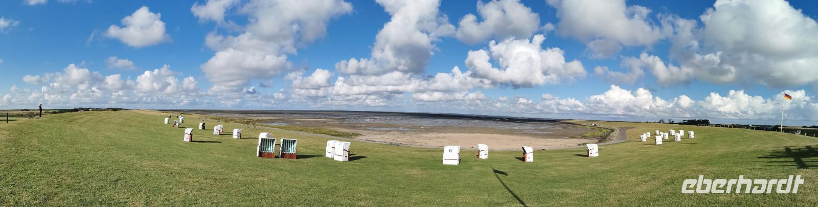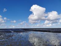 Heute treffen wir unsere Hilke wieder und machen uns sofort auf den Weg zum Watt. Das Wetter ist perfekt. Unterwegs erzählt sie uns, dass die Halbinsel Eiderstedt aus 3 einzelnen Inseln entstand, die eingedeicht wurden. Bis vor 700 Jahren sah es hier nämlich ganz anders aus. Das Festland reichte bis hinaus nach Helgoland. Dann kam die schwere Sturmflut und änderte den Küstenverlauf. Auch die Flut 1634 war verheerend, die Insel Altnordstrand ging verloren, von den 9000 Einwohnern verloren 7000 ihr Leben. Da kaum noch jemand in der Lage war, für die Deiche aufzukommen, wurden Deichbauer aus Holland geholt. Als Geldgeber sorgten sie für Kooge - eingedeichtes Land. Nach der schweren Sturmflut 1962 dann ersann man ein Schutzprogramm für die Küste und küstennahes Land und so entstand eines der großartigsten Küstenschutzbauwerke Deutschlands von 1967-1973: das Eider-Sperrwerk.