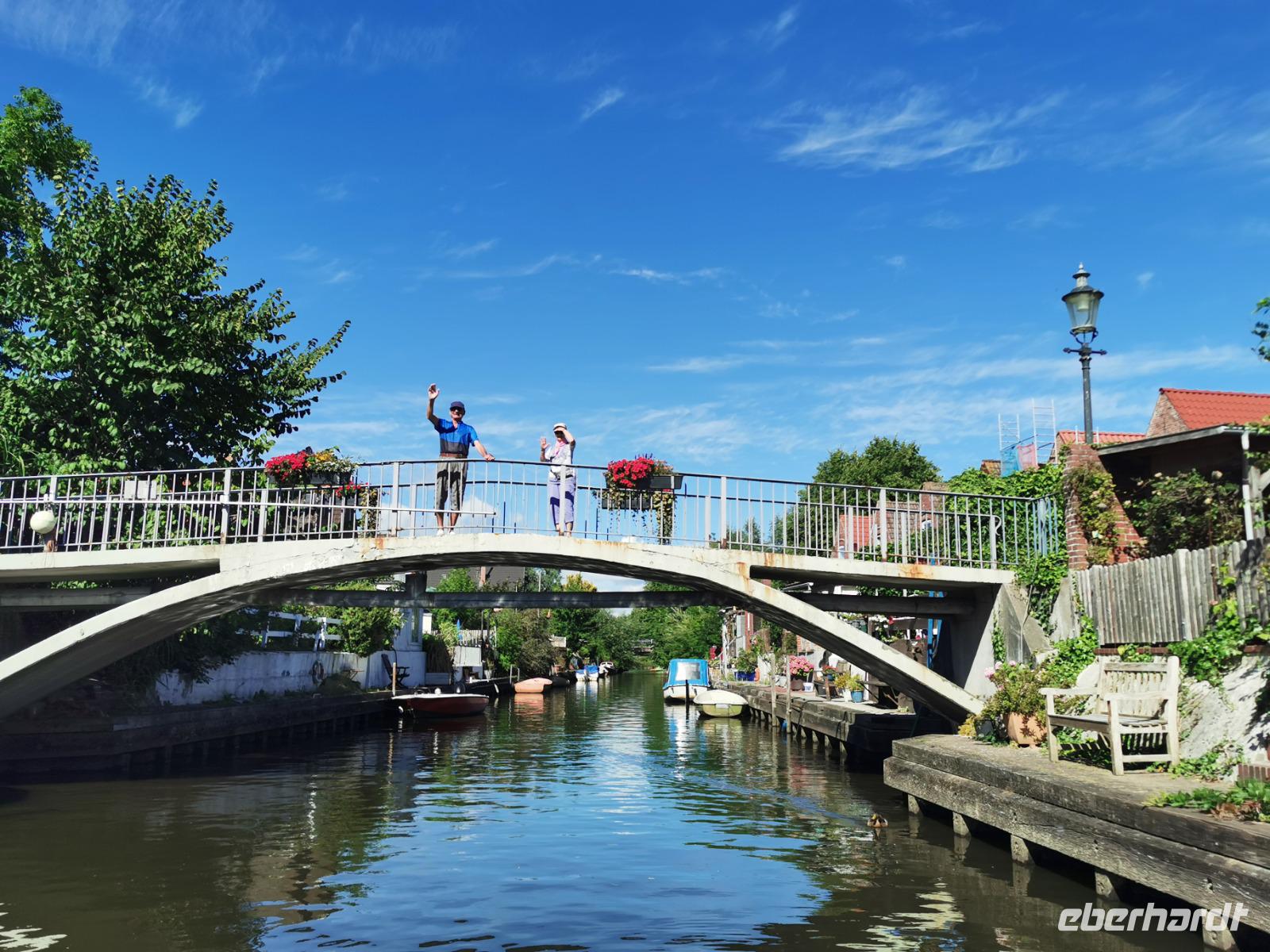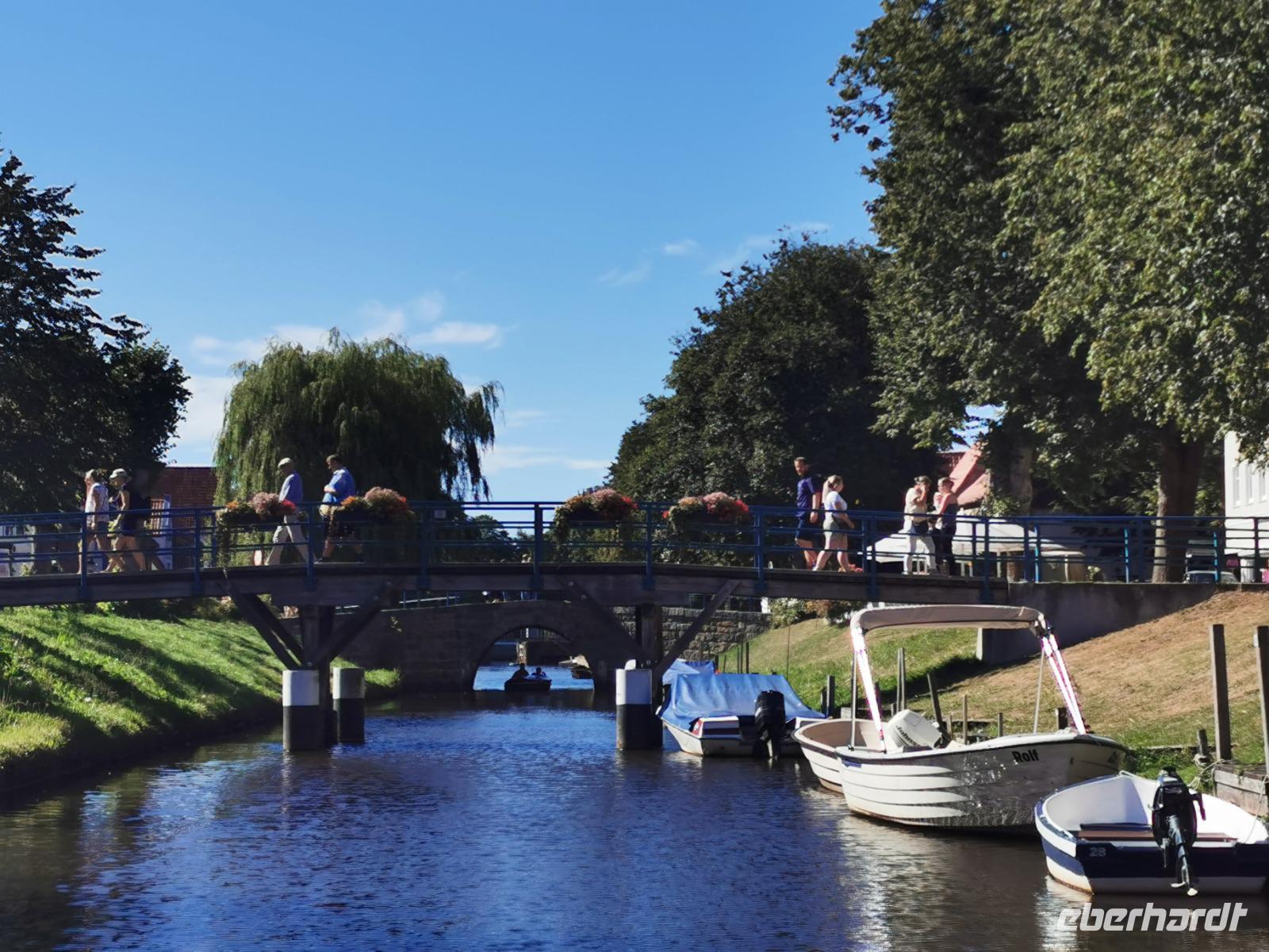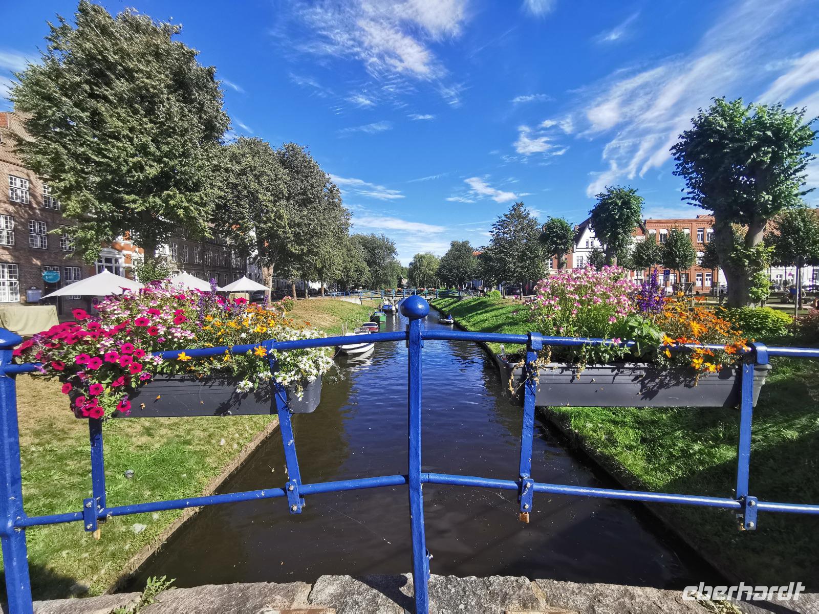 Am Schiffsanleger steigen wir in das Boot ein und fahren beim schönsten Sommerwetter auf der Treene hinaus zur Eider, beide Flüsse treffen sich in Friedrichstadt. Im Anschluß fahren wir hinein in die Holländerstadt, oder das Amsterdam des Nordens, wie Friedrichstadt auch genannt wird. Die Fahrt durch die Stadtkanäle ist bezaubernd schön und unser Schiffsführer unterhält uns mit Anekdoten und Wissenswertem. So sehen wir viele geschichtsträchtige Häuser, ehemalige Kirchen, genauso wie farbenfrohe Gärten und Bootsanleger. Viel zu schnell ist unsere Fahrt zu Ende und wir beschließen, noch etwas zu Fuß durch das Zentrum zu bummeln.