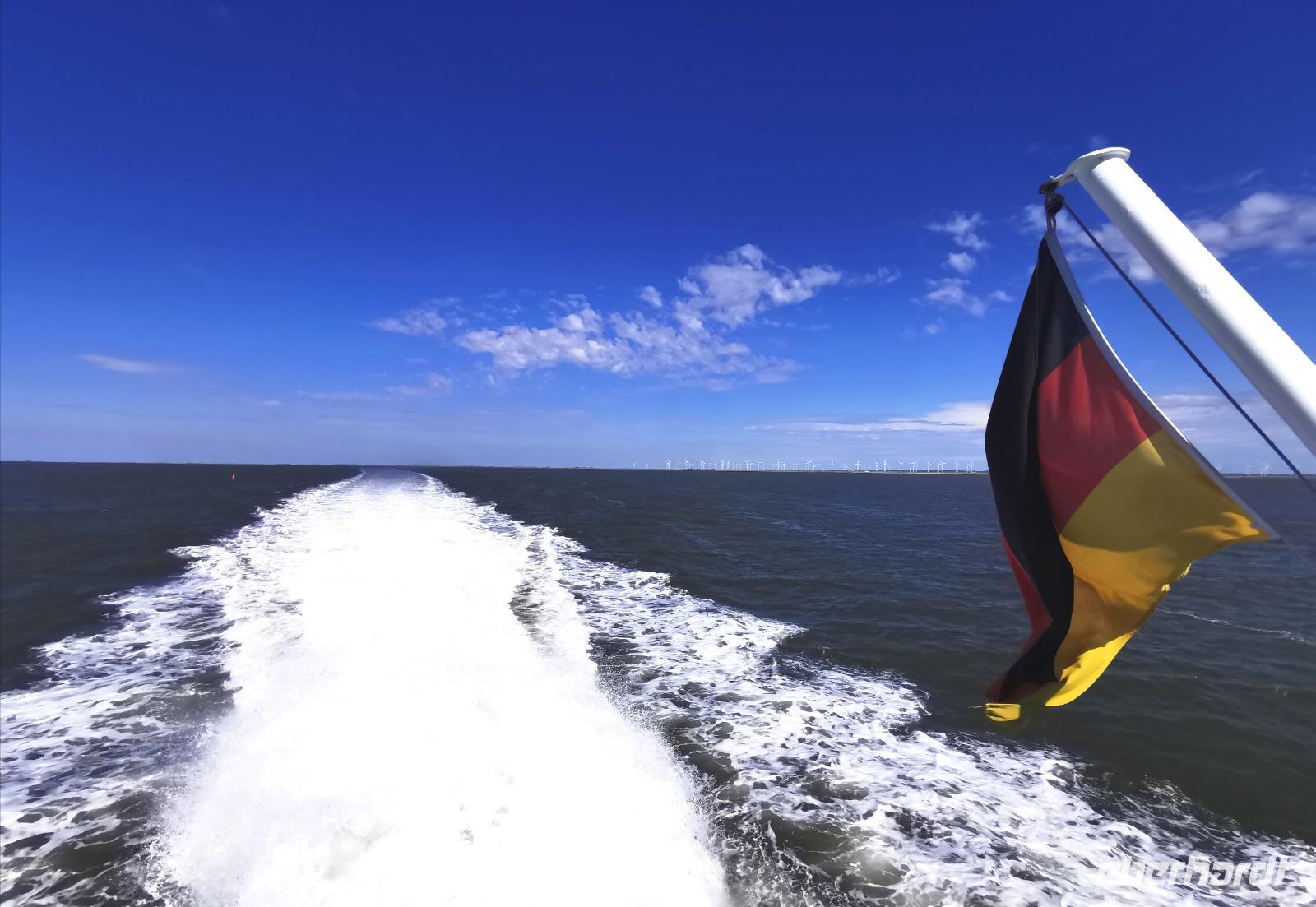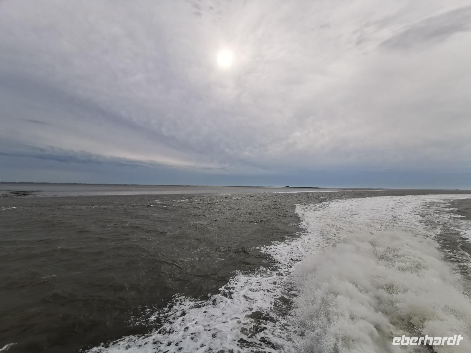 Von der Kirchwarft geht es schließlich mit einer Dame auf dem Kutschbock zurück zum Anleger. Unsere Fähre ist fast pünktlich und wir verbringen eine sonnige Stunde auf dem Wasser. Der ein oder andere Gast beschließt den heutigen Ausflug mit einem Pharisäer, dem hier populären Kaffee mit Rum und Schlagsahne.