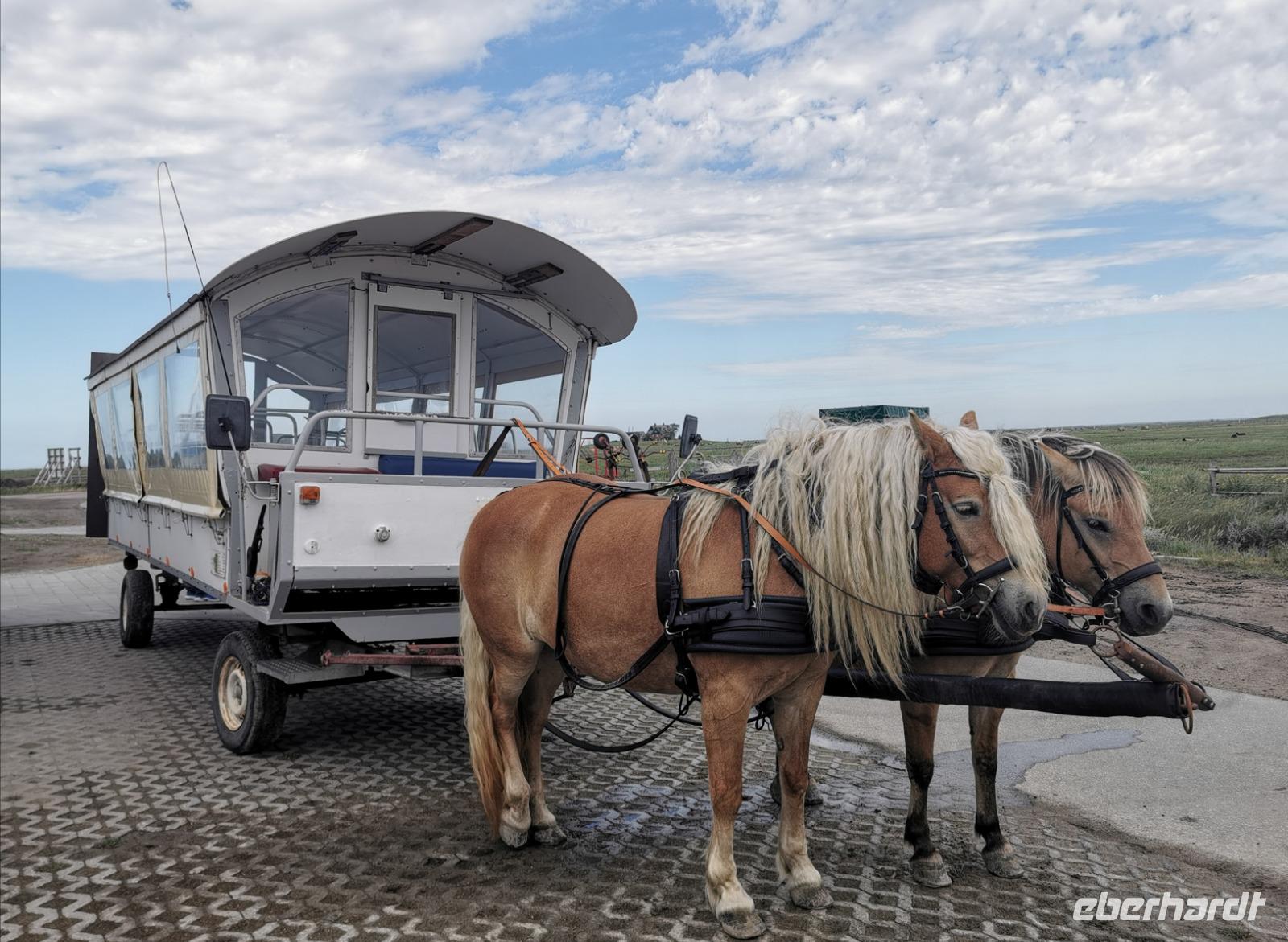 Auf der Hallig Hooge entscheiden sich die meisten für die Kutschfahrt, es spart einfach Zeit und bei unserer Ankunft ist das Wetter nicht sehr einladend. Die Siedlungen auf Hooge stehen auf den Warften, künstlichen Aufschüttungen. Nur so kann man hier der Nordsee erfolgreich die Stirn bieten. Hooge hat einen Sommerdeich, der 1,20 m hoch ist, trotzdem heißt es bis zu zehn Mal im Herbst und Winter "Land unter". Dann überflutet die See die Halligen bis zu den Warften.