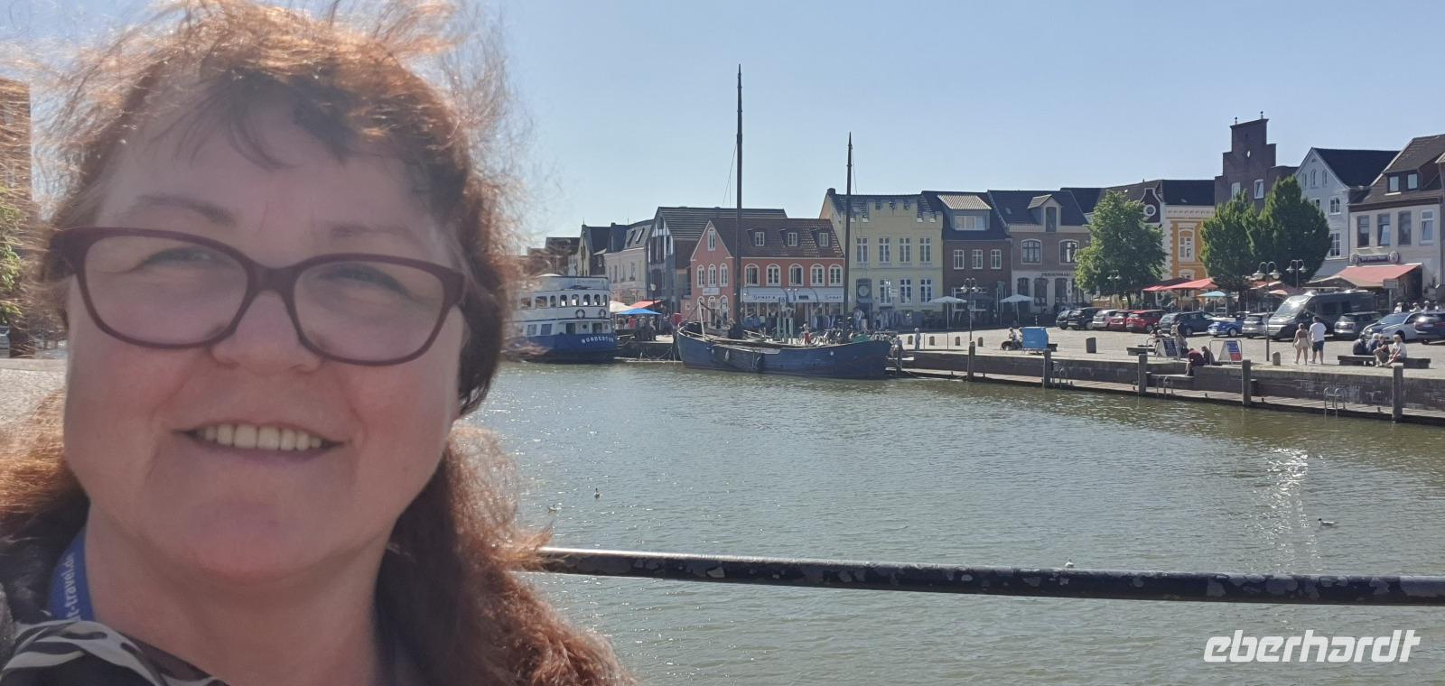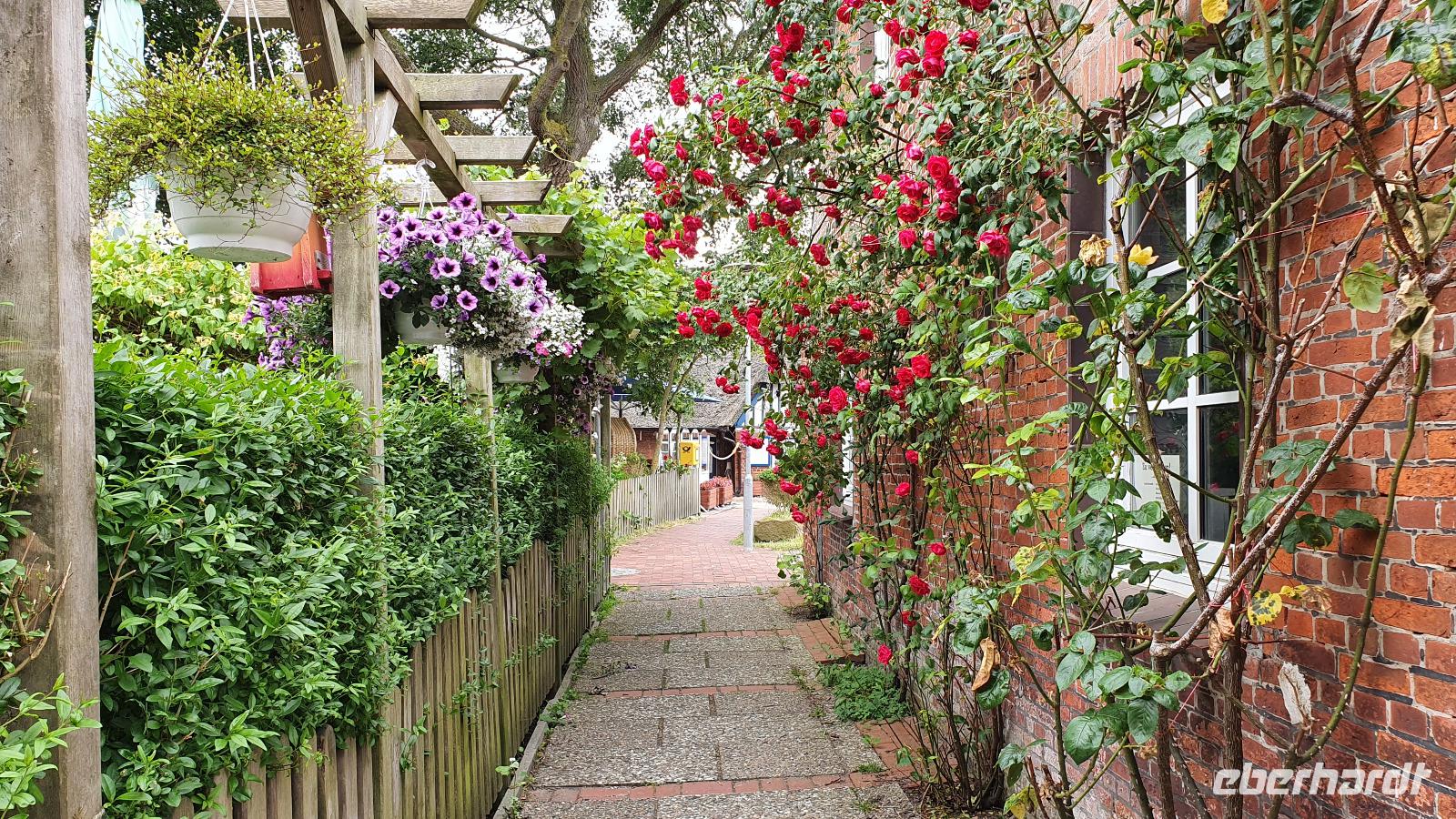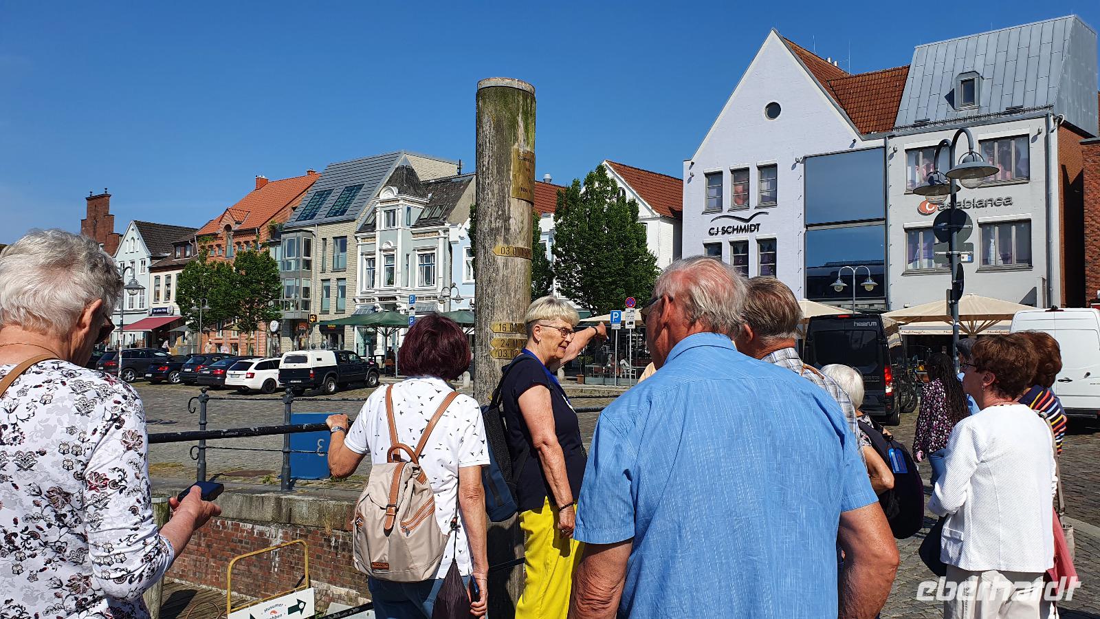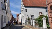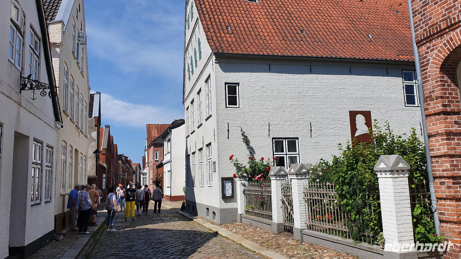 Hier war gerade Ebbe und der Flutpfahl erzählte von den Sturmfluten die im Lauf der Jahrhunderte hier wüteten. Am Asmussen- Woldsen- Denkmal erfuhren wir, dass dieses den beiden Stiftern gewidmet ist, die mit ihrem Vermögen viel Gutes für die Stadt getan haben. Sie ermöglichten Ausbildungen und gesundheitliche Betreuung. Viel besser bekannt ist dieses Denkmal aber unter dem Namen Tine- Brunnen. Die Marienkirche daneben konnten wir leider nicht besuchen, der Glockenstuhl wird gerade saniert und so konnte die Kirche nicht betreten werden. Durch wunderschöne Gassen mit üppig blühenden Rosensträuchern spazierten wir weiter und erreichten bald das