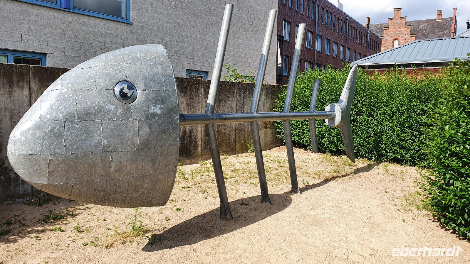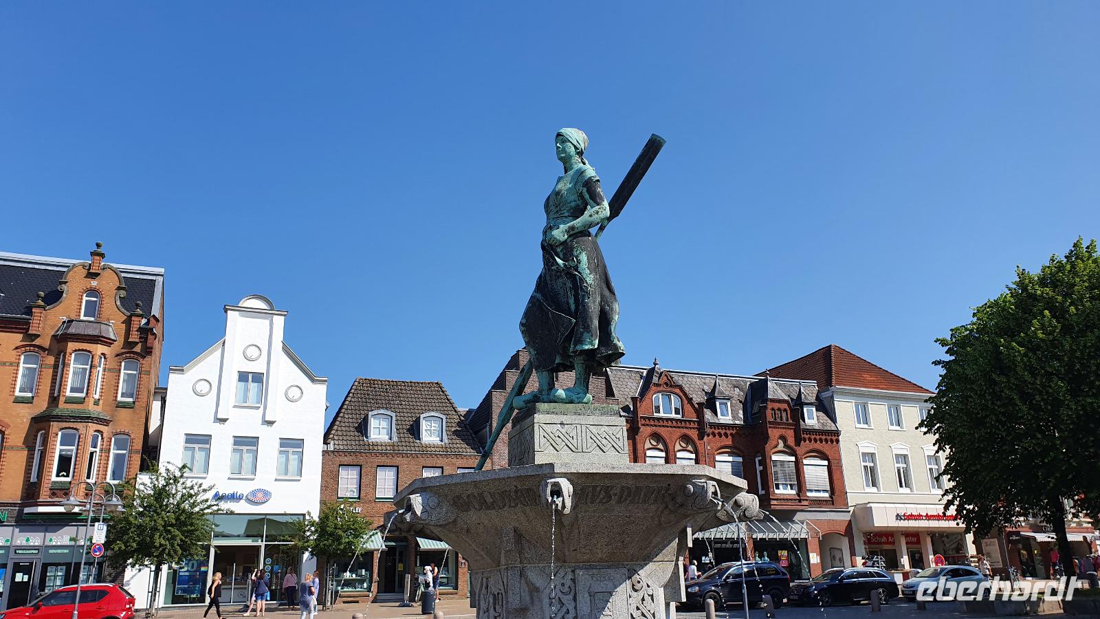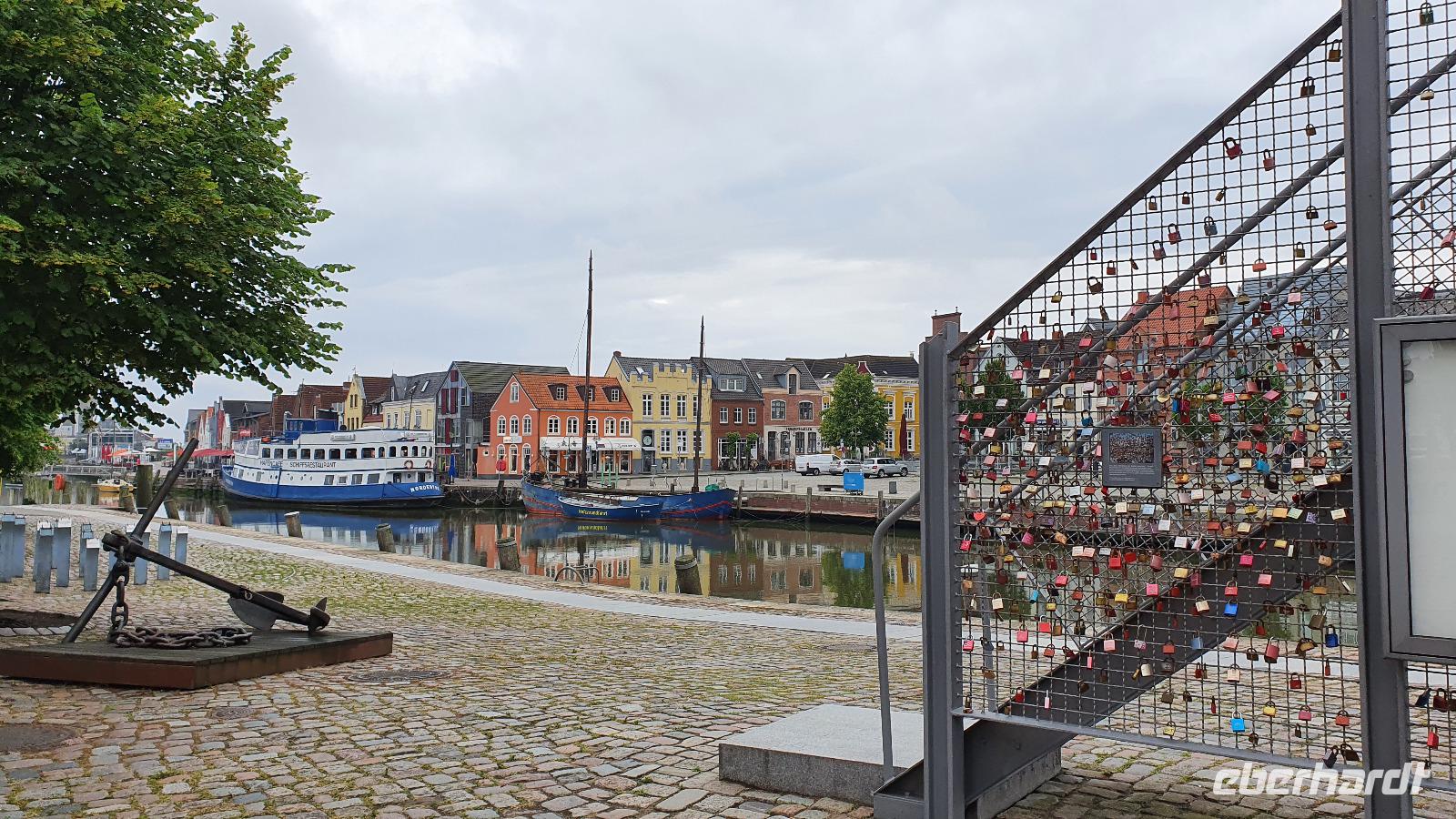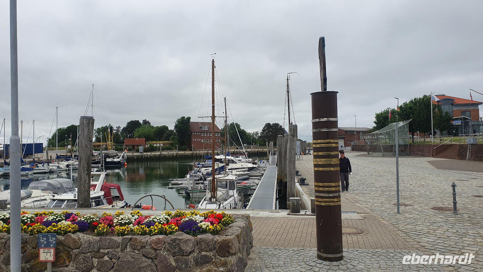 Hier war gerade Ebbe und der Flutpfahl erzählte von den Sturmfluten die im Lauf der Jahrhunderte hier wüteten. Am Asmussen- Woldsen- Denkmal erfuhren wir, dass dieses den beiden Stiftern gewidmet ist, die mit ihrem Vermögen viel Gutes für die Stadt getan haben. Sie ermöglichten Ausbildungen und gesundheitliche Betreuung. Viel besser bekannt ist dieses Denkmal aber unter dem Namen Tine- Brunnen. Die Marienkirche daneben konnten wir leider nicht besuchen, der Glockenstuhl wird gerade saniert und so konnte die Kirche nicht betreten werden. Durch wunderschöne Gassen mit üppig blühenden Rosensträuchern spazierten wir weiter und erreichten bald das