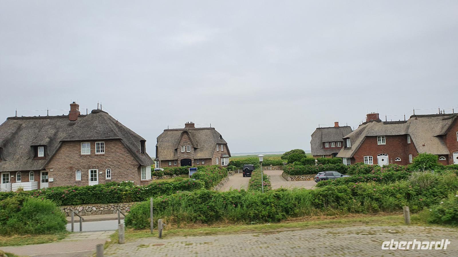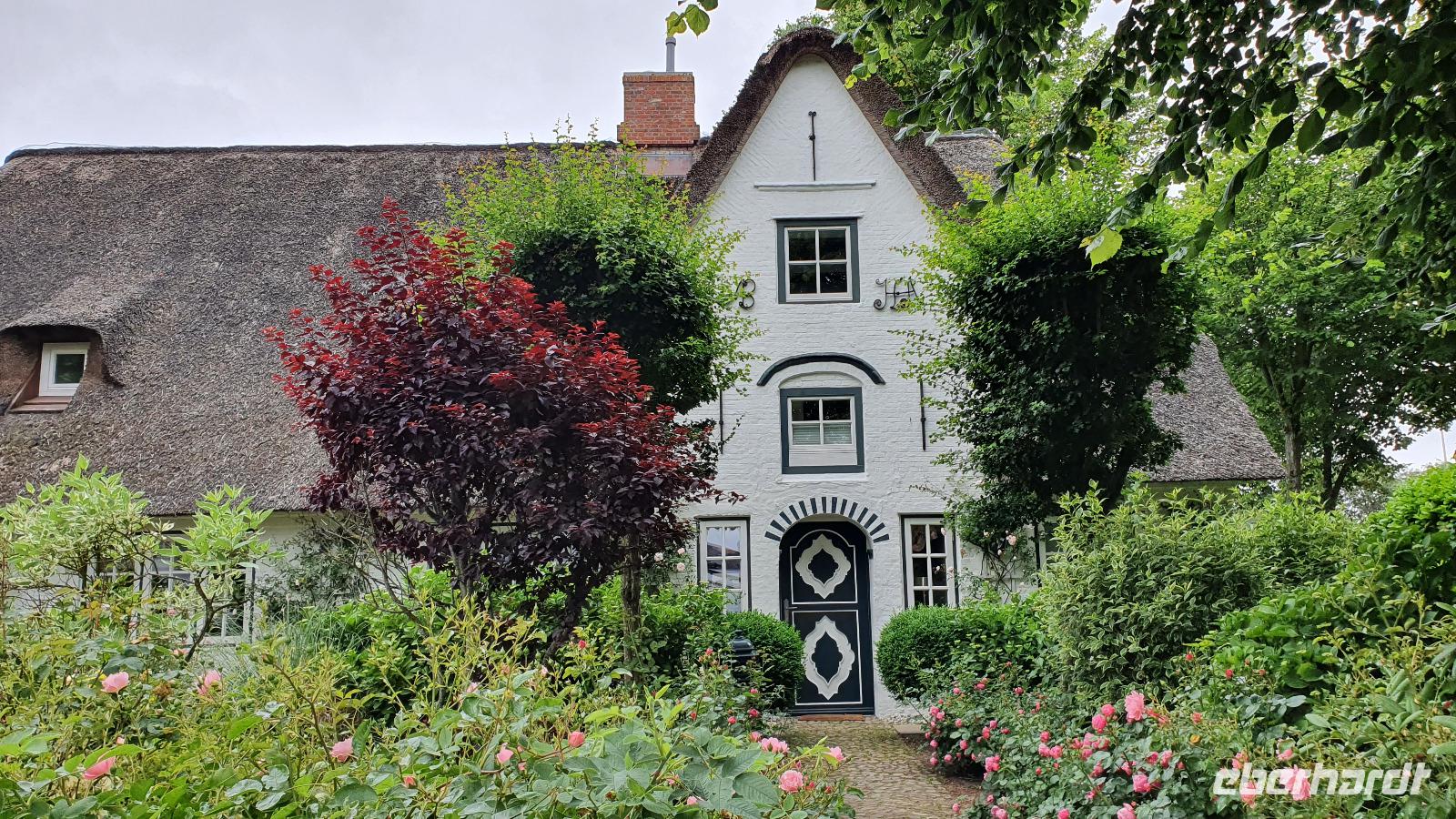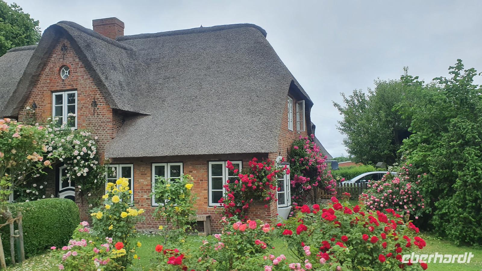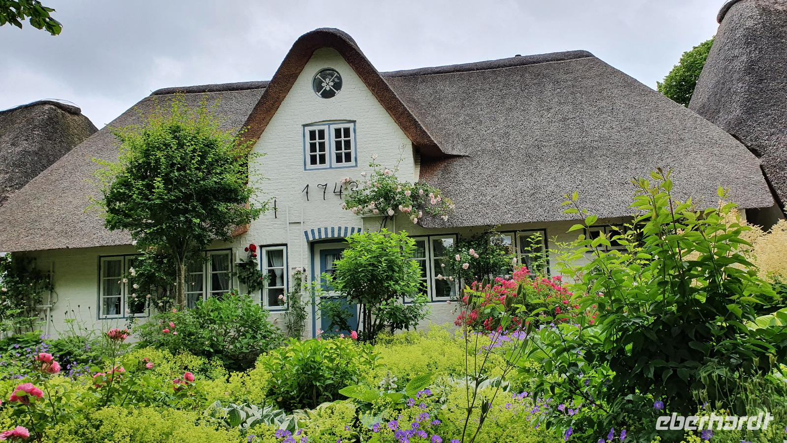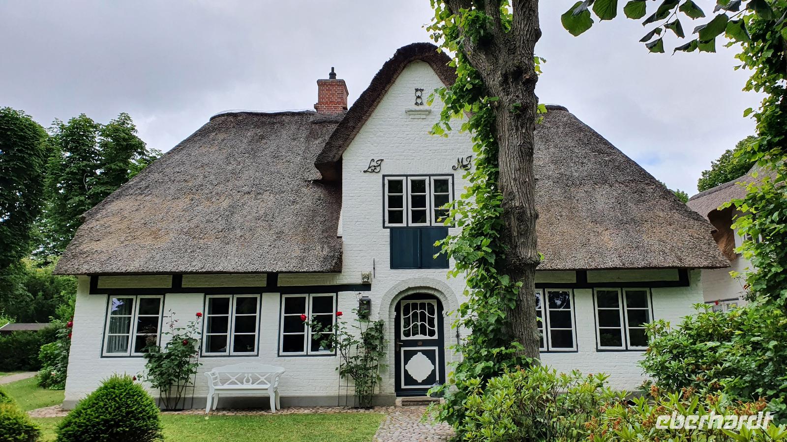 können wir noch einmal aussteigen und die wunderschönen Häuser hier fotografieren. Sven hat den Stopp extra für uns gemacht. Nieblum ist eine der schönsten Siedlungen hier und die Häuser erzählen Geschichten. So sind Kapitänshäuser an den blau gestrichenen Fenstern und Türen erkennbar. Handwerkerhäuser haben grün gestrichenen Fenster und Türen. Weiter geht die Fahrt Richtung Wyk, wir passieren sogar Weinbaugebiete, Rot- und Weißwein wird hier angebaut, wobei aus dem roten dann ein Rosé gekeltert wird. Am Golfplatz und auch dem Flugplatz vorbei erreichen wir wieder das Städtchen
