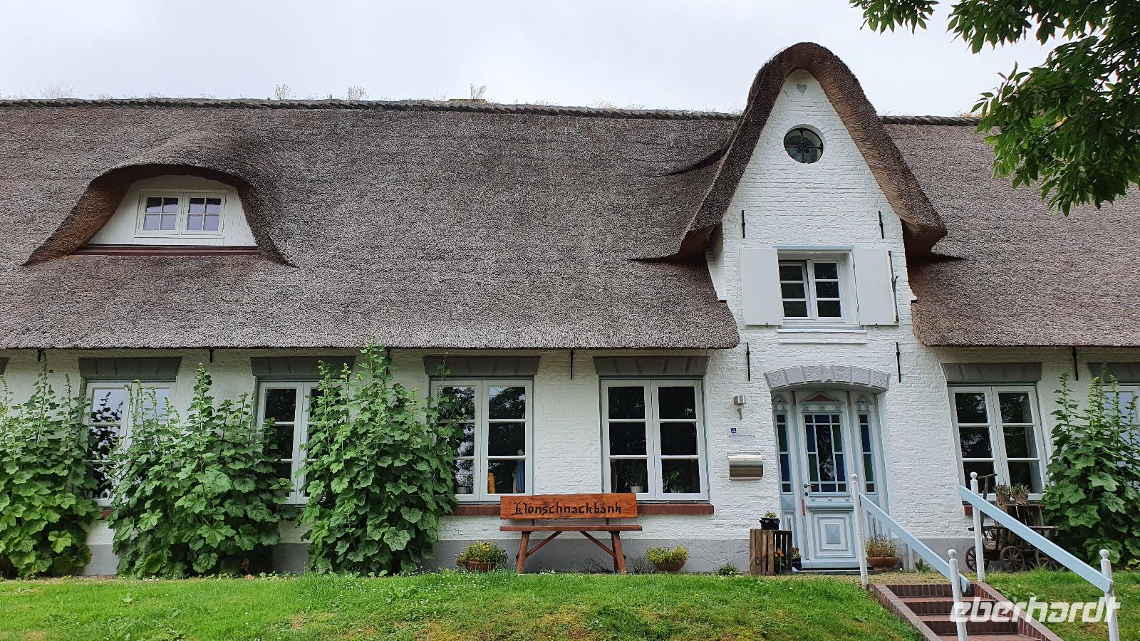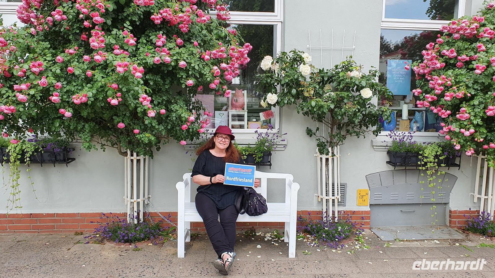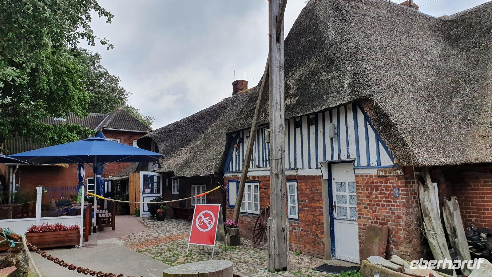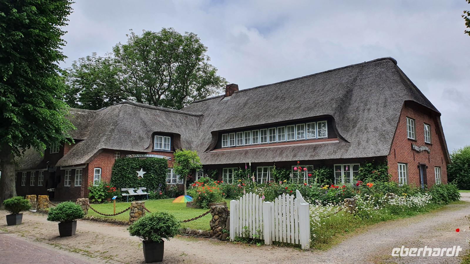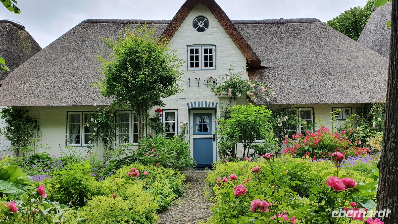 können wir noch einmal aussteigen und die wunderschönen Häuser hier fotografieren. Sven hat den Stopp extra für uns gemacht. Nieblum ist eine der schönsten Siedlungen hier und die Häuser erzählen Geschichten. So sind Kapitänshäuser an den blau gestrichenen Fenstern und Türen erkennbar. Handwerkerhäuser haben grün gestrichenen Fenster und Türen. Weiter geht die Fahrt Richtung Wyk, wir passieren sogar Weinbaugebiete, Rot- und Weißwein wird hier angebaut, wobei aus dem roten dann ein Rosé gekeltert wird. Am Golfplatz und auch dem Flugplatz vorbei erreichen wir wieder das Städtchen