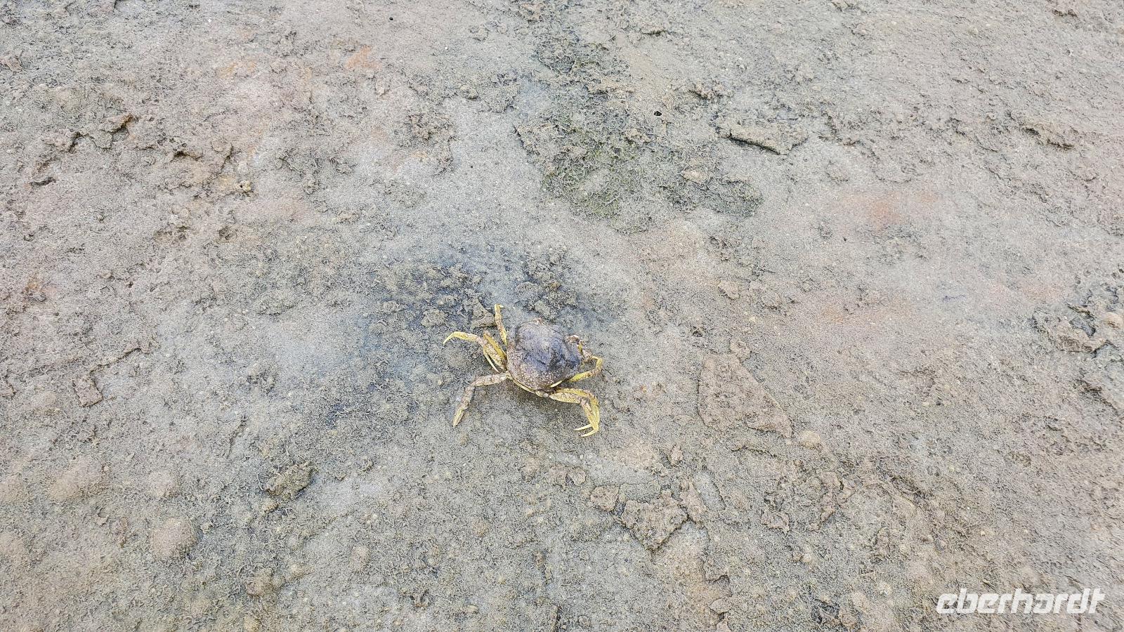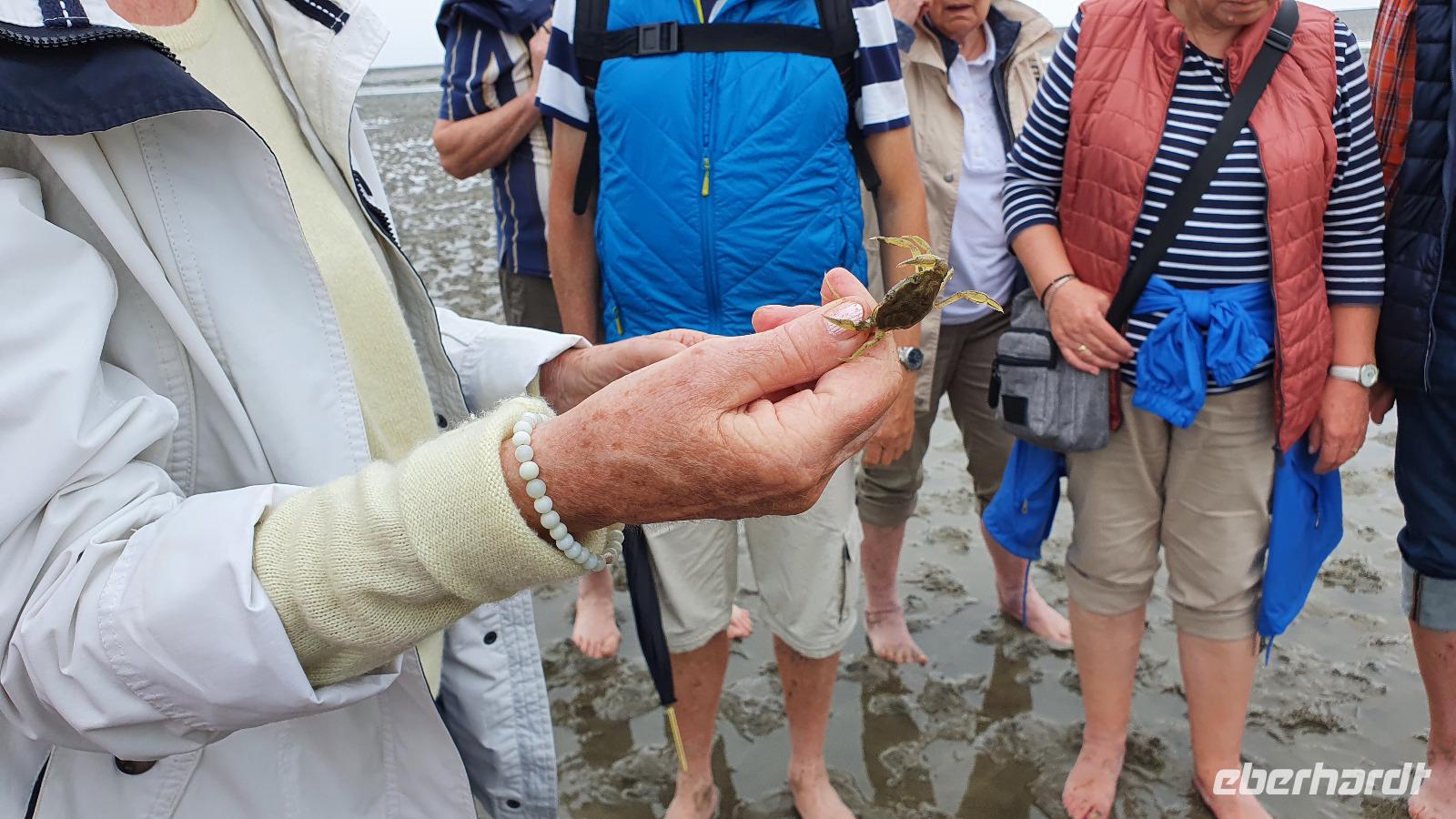 wir steigen aus dem Bus und laufen gemeinsam zum Damm. Hier heißt es dann: Schuhe aus und barfuß das Watt erobern. Das war anfangs gar nicht so einfach, Sand, Schlick und Wasserstellen wechselten sich permanent ab; aber nach einer kurzen Zeit hatten wir uns daran gewöhnt. Hilke erzählte uns, dass es im Watt weit mehr Lebewesen gibt als bisher angenommen, man sagt sogar, dass es mehr seien, als im tropischen Regenwald. Und so lernten wir sie kennen: den Wattwurm, die kleine Krabbe, die Schnecken und auch die verschiedenen Muscheln. Anschaulich erläutert uns Hilke wie die kleinen Krebse immer wieder ihre Panzer abwerfen müssen um wachsen zu können und wie sie es schaffen, neue Panzer wachsen zu lassen. Der Rückweg wurde noch einmal spannend: eine Wasserstelle war doch tiefer als gedacht. Trotzdem meisterten das alle von uns und wohlbehalten kamen wir wieder am Strand an. Hier hieß es Füße abduschen und auf geht es zu unserer nächsten Station für heute. Das war zu unserer Überraschung ein Punkt, der nicht im Programm stand: wir besuchten nämlich den