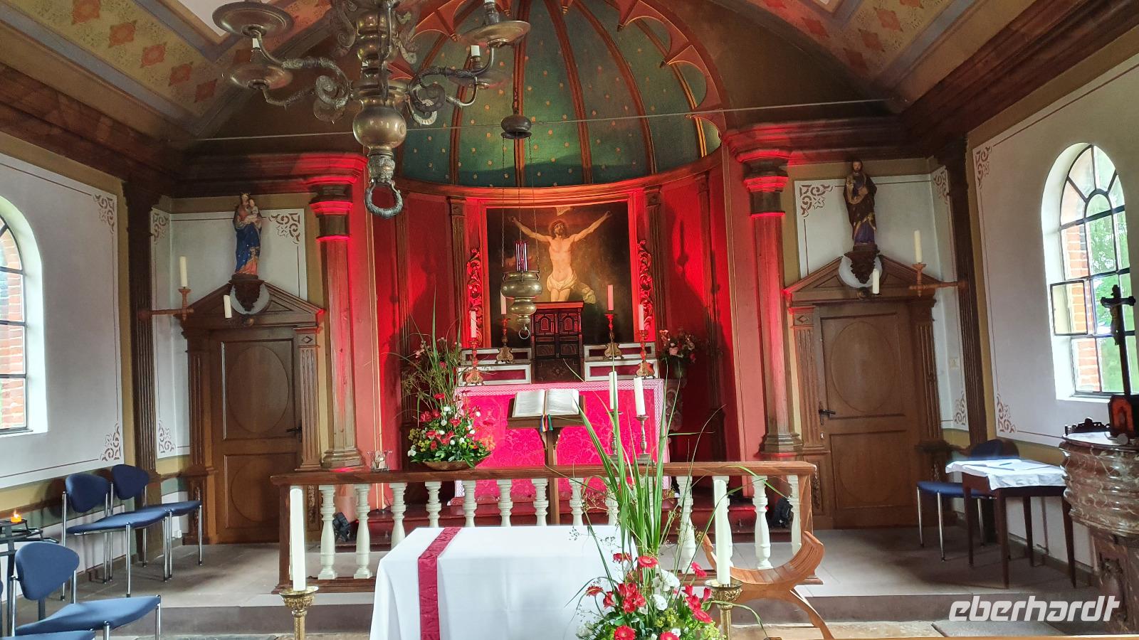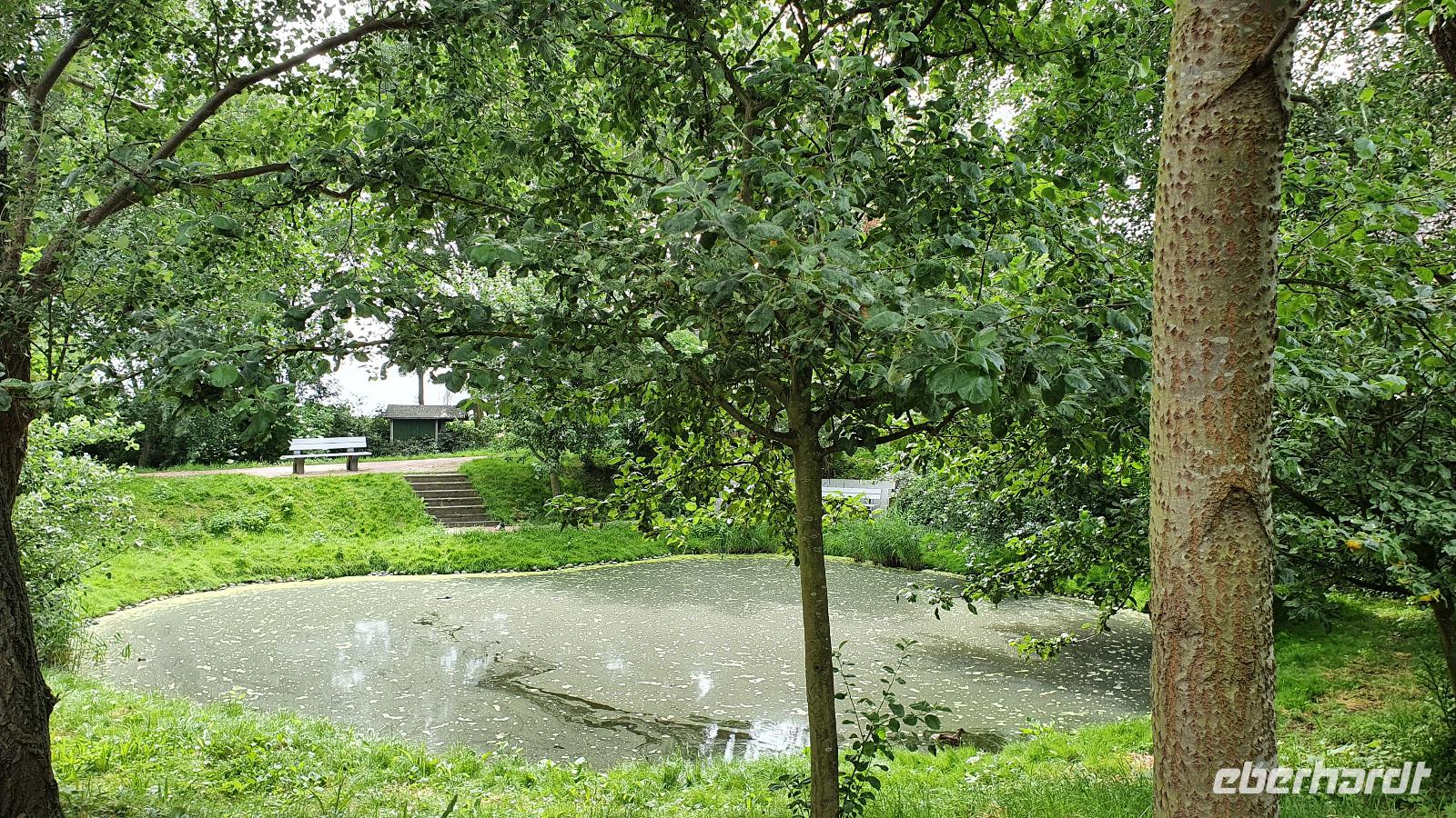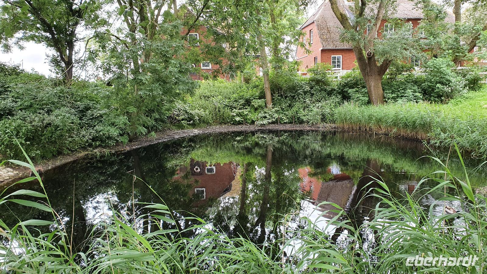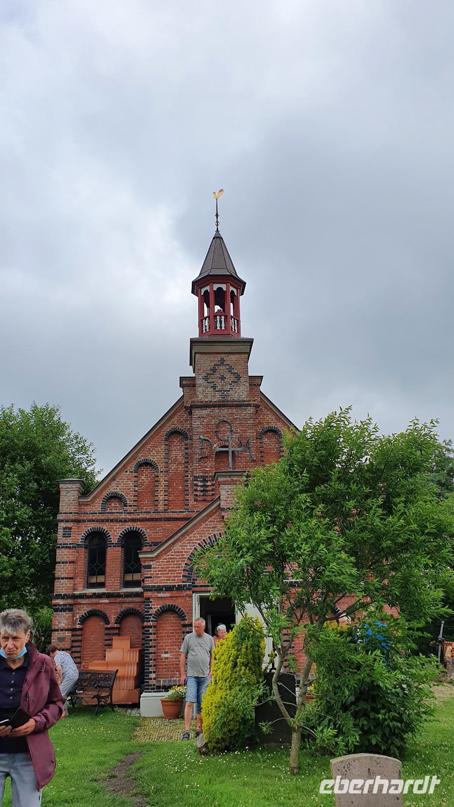 In Osterdeich steht sie: die Sankt Theresia-Kirche. Sie gehört der alt-katholischen Gemeinde und wurde tatsächlich zum Dom geweiht. Wir haben Zeit, also können wir diesen kleinen Dom besuchen und im Inneren erzählt uns Hilke von den Alt-Katholiken und ihrem Gemeindeleben. Auf dem Weg zum Bus dann kann ich noch eine Schale frische Erdbeeren erstehen und alle greifen gerne zu. Wir setzen unsere Erkundungsfahrt fort und fahren zum