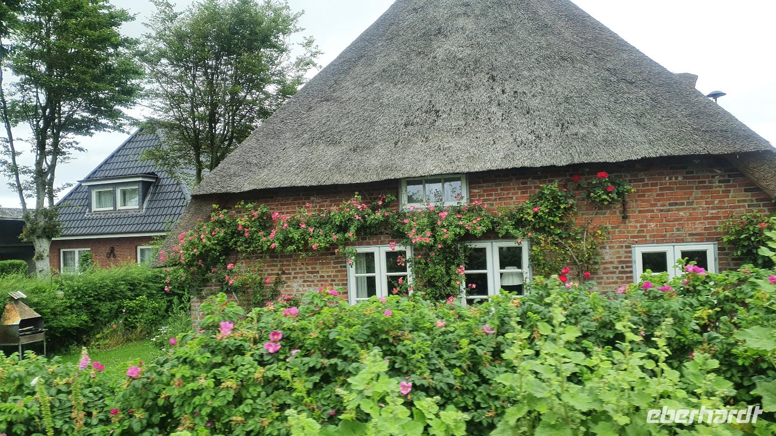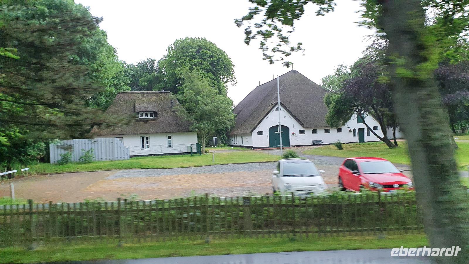 Sie ringen dem Meer neues Land ab, bauen Lahnungen und erweitern sie, bis der Queller als erste Salzwiesenpflanze dafür sorgt, dass der Boden bleibt und fruchtbar wird. Wenn dann das neu gewonnene Land eingedeicht ist nennt man es Koog- im niederländischen Polder. Und Niederländer waren es auch, die vom Herzog von Gottorf nach der verheerenden Flut 1632 geholt wurden, um neue Deiche zu bauen, hier vor Ort war niemand mehr dazu in der Lage, mehr als 7000 Menschen verloren damals ihr Leben. Die Spuren der Holländer sind bis heute sichtbar. Gewaltige Anwesen errichteten sie: die Haubarge. (Hau=Heu und Barge= große, riesig). Das sind Häuser in Ständerbauweise, mit 4-8 Ständern. Mehr als 200 soll es davon gegeben haben, heute sind es nur noch um die 20, die auf Eiderstedt zu finden sind. Eines davon sahen wir auf unserem Weg nach