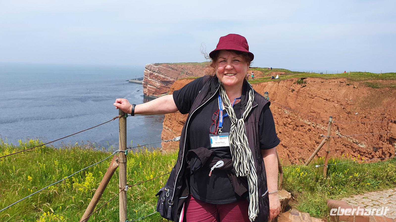 Fast alle entschieden sich für Helgoland und so machten wir uns beizeiten auf, um die Fähre in Büsum zu erreichen. Trotz Umleitung wegen einer gesperrten Brücke erreichten wir den Hafen rechtzeitig und auch das Einchecken ging problemlos, noch im Bus erhielten alle ihre Tickets und dank Teilnehmerliste entfiel die einzelne Registrierung. Lediglich beim Einstieg mußten wir noch unser "G" nachweisen, per Impfausweis, Bestätigung oder Testergebnis. Zu unserer Überraschung war es nicht die "Funny Girl", die uns nach Helgoland bringen sollte sondern die "Lady von Büsum". Sie war doch etwas schwerfälliger und nicht ganz so schnell, was wir am zeitweise beachtlichen Wellengang (auch auf dem Schiff) bemerkten. Trotzdem gelangten wir fast alle wohlbehalten auf der Insel an, das Tendern entfiel wegen Corona und so liefen wir direkt den Hafen an. Hier spazierten wir gemeinsam bis zum Aufgang zum Oberland, ab hier konnte jeder selber entscheiden, was er/sie gern sehen wollte. Viele entschieden sich für den
