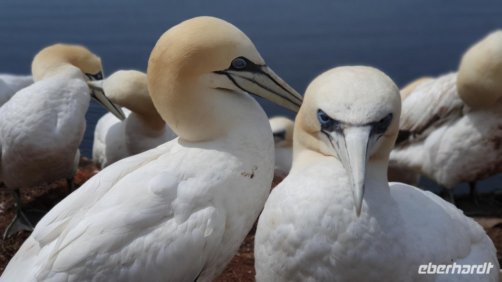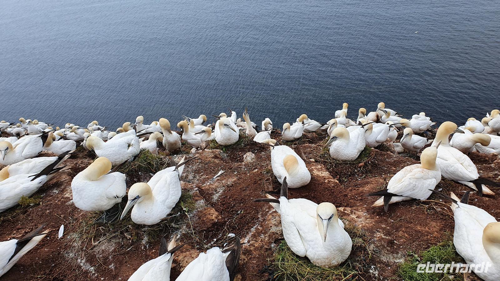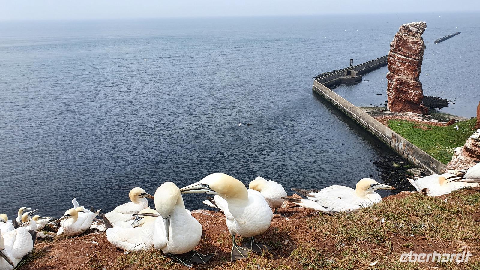 Doch nicht nur die Trottellumme ist hier heimisch, seit 1991 brüten hier auch die Basstölpel. Die imposanten Tiere lassen sich durch die Besucher nicht stören, sie brüten bzw. ziehen in aller Ruhe ihre Jungen in ihrer Kolonie auf. Das so hautnah erleben zu können war schon etwas ganz besonderes. Die Tölpel erreichen eine Flügelspannweite von bis zu 1,70 Metern, wenn man sie dahingleiten sieht ist es schon sehr majestätisch. Ihren Namen verdanken sie ihrem Ursprungsort in Schottland- dem Bass Rock, auf dem Hunderttausende von ihnen brüten. Unser Spaziergang führt weiter und dann sehen wir sie auch schon, die