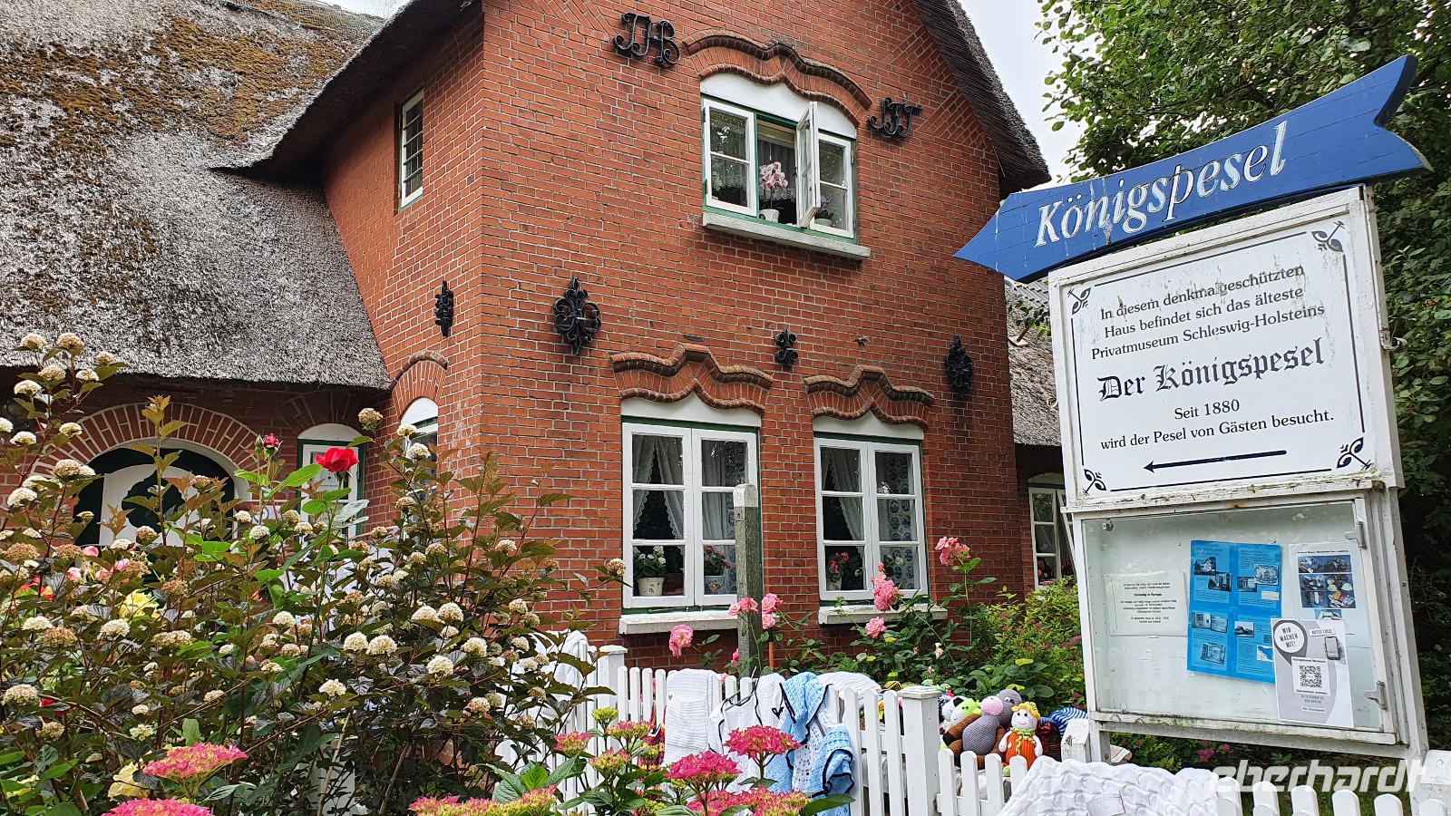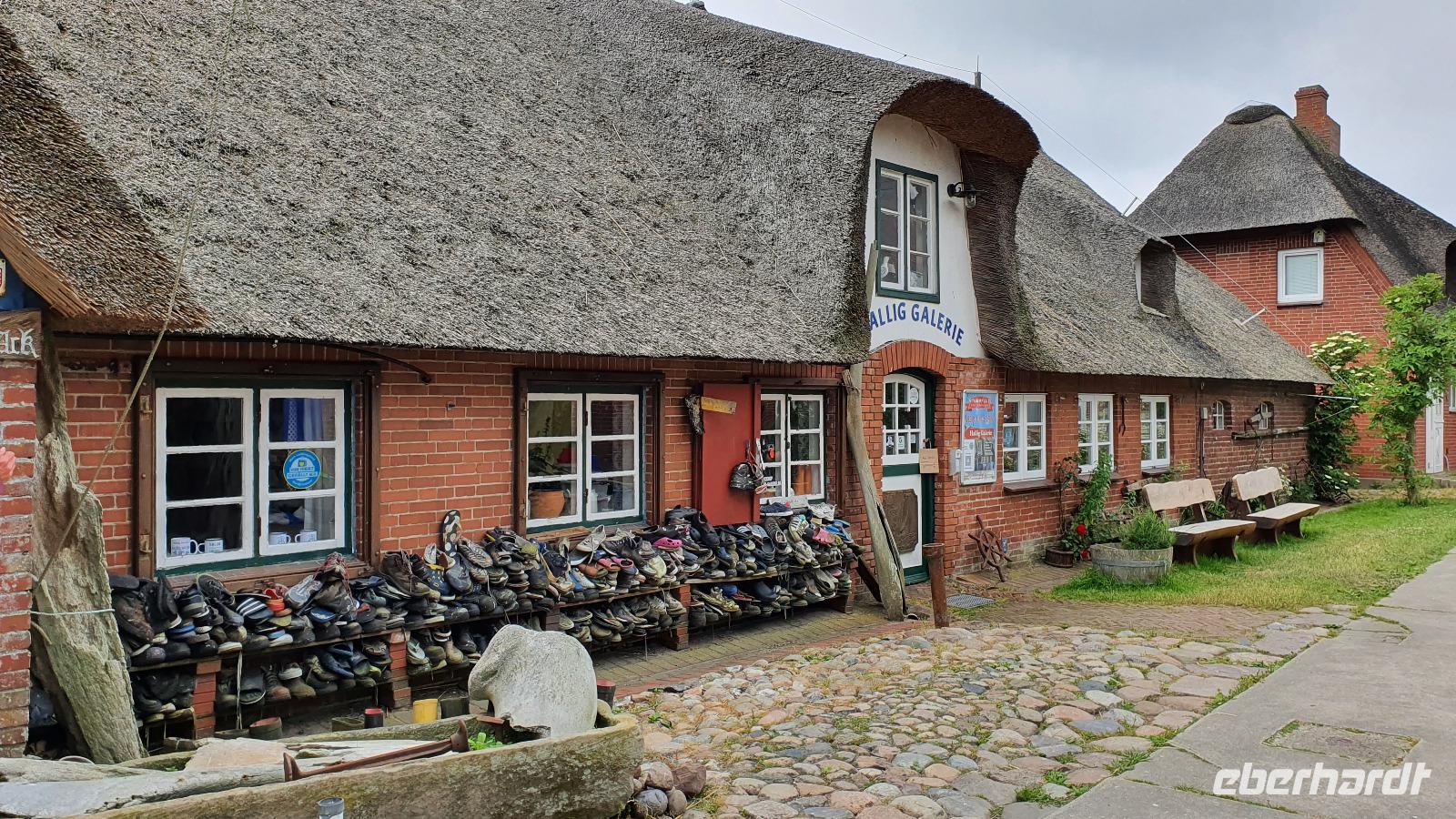 Wir fahren an Südfall vorbei und der Hamburg Hallig, die über einen Damm mit dem Festland verbunden ist. Auf der kleinsten der Hallige- Habel- gibt es weder fließend Wasser noch Strom, sie gehört den Vogelbeobachtern. Backbord sehen wir die Insel Pellworm und schließlich auch steuerbords Hallig Gröde und Hallig Langeneß, letztere hat ihren Namen von ihrem Aussehen, sie erinnert an eine "lange Nase". Nach einer knappen Stunden Überfahrt erreichen wir Hallig Hooge. Alle sind mit Plänen der Hallig und Informationen zu den Häusern und Einrichtungen ausgestattet so dass viele individuell unterwegs sind. Wer möchte nimmt den Kutschen-Express und läßt sich zur Hanswarft fahren, hier kann man im Sturmflutkino anschaulich erleben, wie die Nordsee die Hallig flutet. An der Galerie findet sich besonderes "Strandgut", hunderte Schuhe sind hier angespült worden. Im Königspesel kann man das Leben hier nachvollziehen, er heißt so, weil auch der dänische König einst hier übernachtete, da eine Sturmflut eine Weiterfahrt unmöglich machte. In den Cafes und Restaurants genießen viele ihre Mittagspause, spazieren über die Hallig, besuchen die Kirchwarft mit der Kirche, die Backenswarft mit dem Friesenpesel. Ein letzter Kaffee hier und schon geht es retour zur Anlegestelle. Unsere Fähre hat nur geringe Verspätung und so erreichen wir am frühen Nachmittag wieder
