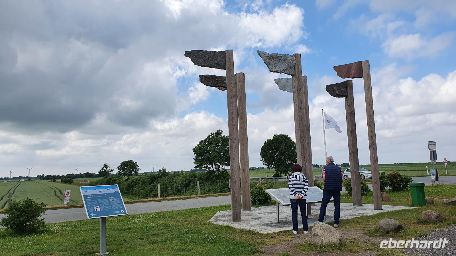 welches durch Eindeichen entstanden und daher sehr fruchtbar ist. Im Gegensatz dazu ist die Geest sehr sandig und deshalb weniger fruchtbar. Sie wird also eher als Weide genutzt. Viele Windkraftwerke sehen wir unterwegs und Hilke erzählt, dass mehr als 50% der benötigten Energie bereits aus Wind gewonnen wird, das meiste natürlich offshore- weil dort wesentlich größere und leistungsfähiger Windräder gebaut werden können. Dann erreichen wir den höchsten Berg Nordfrieslands immerhin stolze viertausendfünfhundert Zentimeter hoch- der Stolberg. Schon sind wir in Dänemark, die dänische