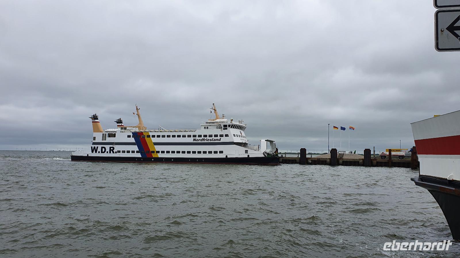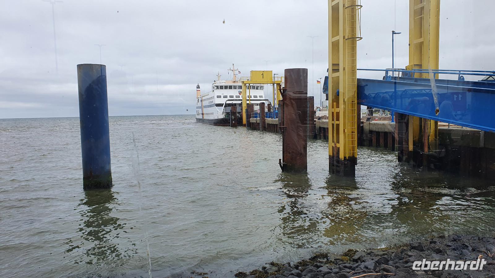 Wieder hatten heute alle die Wahl: in Husum den Tag selbst gestalten oder die Insel Föhr kennenlernen- alle hatten sich für die Insel Föhr entschieden. Also starteten wir bei bedecktem Himmel und einige schauten mit Sorge auf das vorhergesagte Wetter, wird es wirklich regnen heute? Bis zum Fährhafen in Dagebüll hielt sich der Himmel bedeckt. Bald schon kam unsere Fähre: die "Nordfriesland" und mit Blicken auf die Halligen fuhren wir hinüber zur