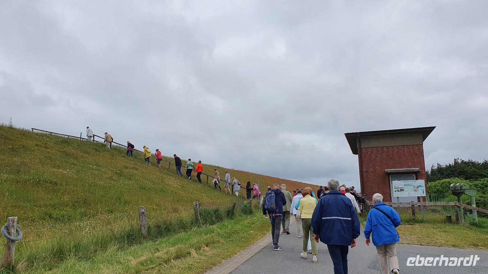 Sonne sorgt heute für einen fröhlichen Start in den Tag und nach einem leckeren Frühstück treffen wir uns wieder mit Hilke, unserer örtlichen Reiseleiterin. Der Gezeiten-Gott ist uns gnädig: wir haben ablaufendes Wasser, das heißt, unsere geplante Wattwanderung kann stattfinden. So fahren wir also mit Hilke zum Nordstrand. Das war bis 1935 eine richtige Insel bevor dann der Autodamm über eine Länge von 4 km gebaut wurde und so die Insel wieder mit dem Land verbunden war. Nach einer knappen halben Stunde Fahrt erreichen wir schließlich unser erstes Ziel für heute: