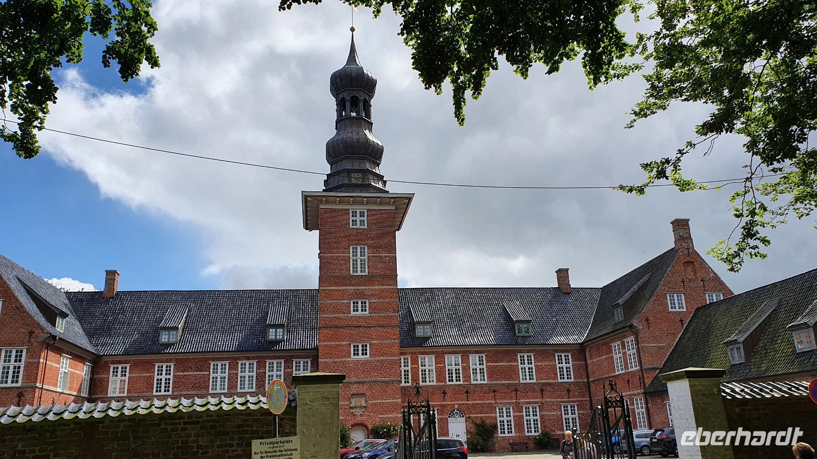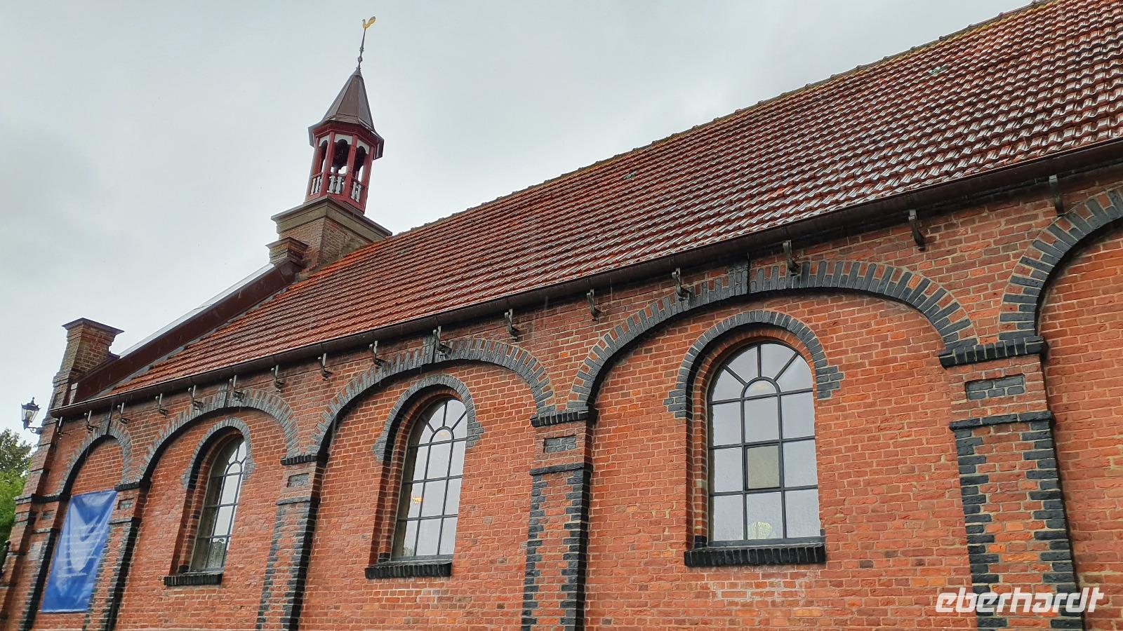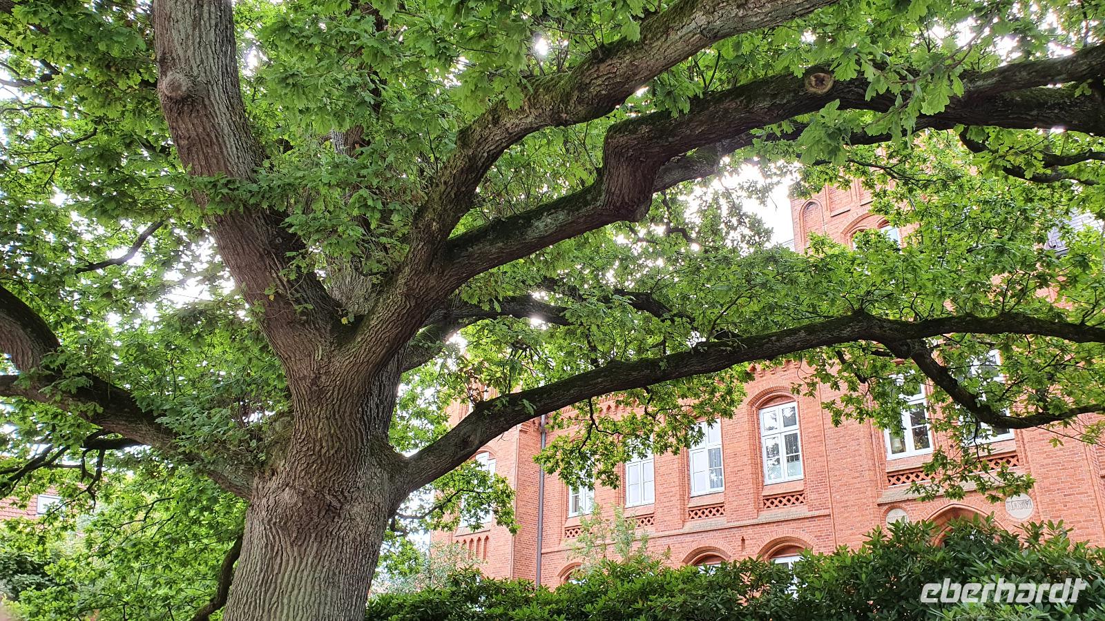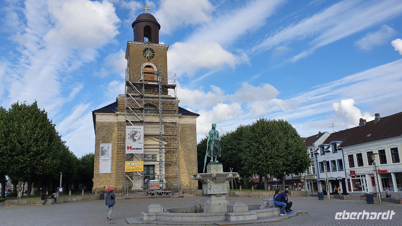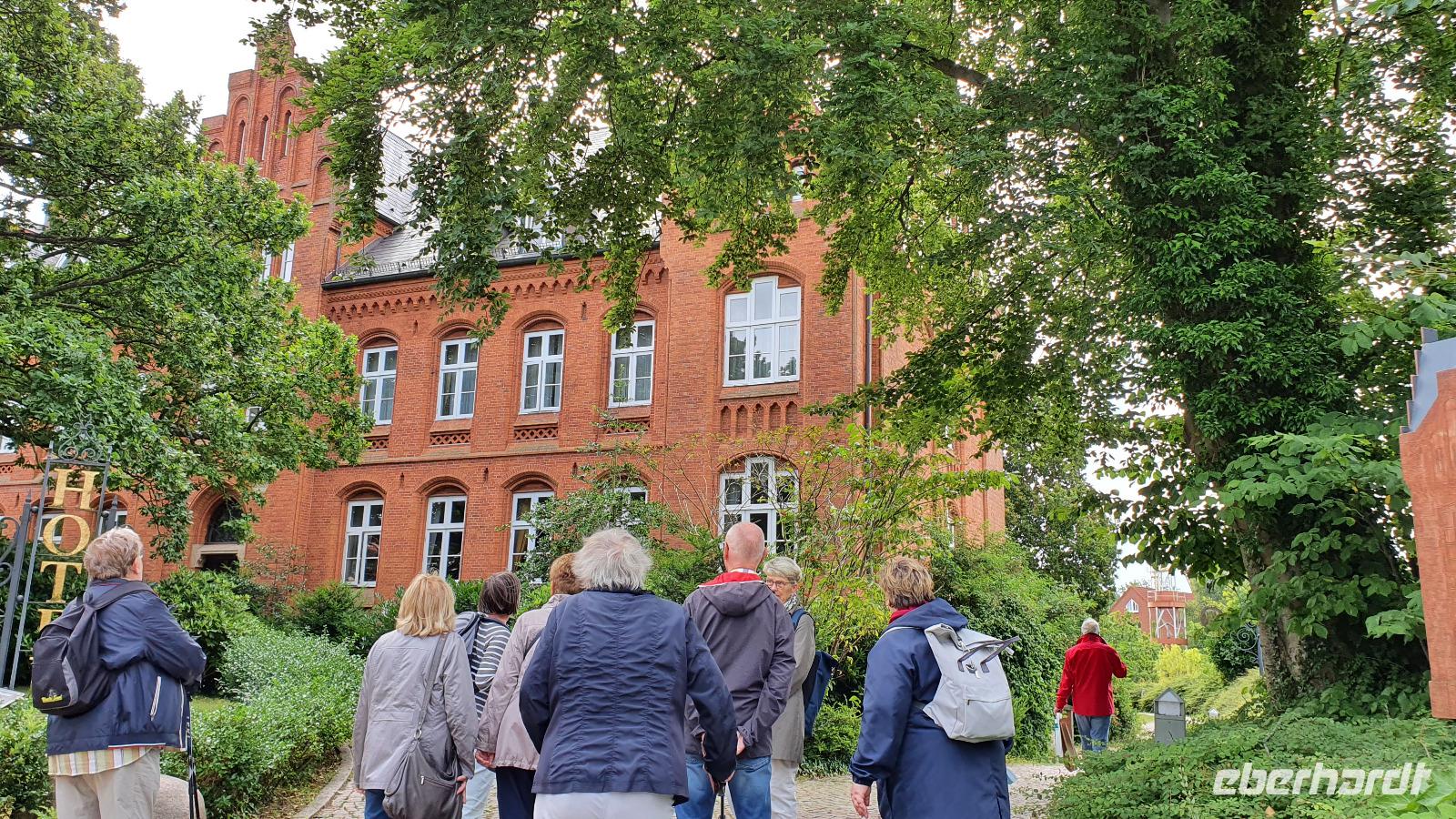 Heute ein 5-Sterne-Genießer-Hotel wurde es Ende des 19. Jahrhunderts erbaut und nahm alsbald die 1527 gegründete Husumer Gelehrtenschule auf. Hier war auch Theodor Storm Schüler. Die große Eiche davor wurde nach dem Krieg 1870/71 gepflanzt und soll heute die größte in Husum sein. Weiter geht unser Spaziergang, an der St. Marienkirche entlang. Sie wurde im klassizistischen Stil wiederaufgebaut, der strnge, schnörkellose Stil gefällt nicht jedem und so gibt es Bemühungen, den ursprünglichen Zustand wieder herzustellen. Derzeit wird aber noch das Geläut saniert und so können wir die Kirche leider nicht im Innern besichtigen. Dafür schauen wir uns das