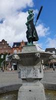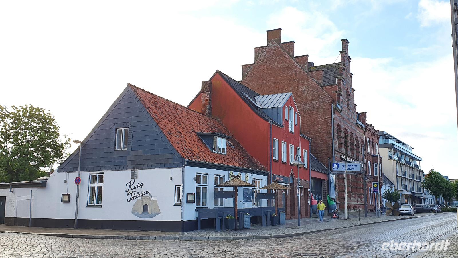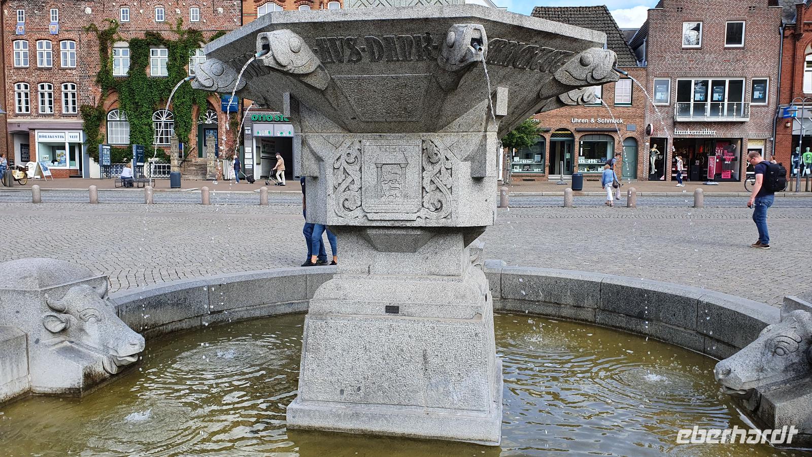 an- besser bekannt als Tine-Brunnen. August Friedrich Woldsen war der Vetter von Anna Catharina Asmussen. Beide lebten im 19. Jahrhundert, die Brauerei- und Hofbesitzer hinterließen ihr gesamtes Erbe der Stadt Husum, noch heute gibt es ihre Stiftung, die seit jeher darauf abzielt, Bildung zu ermöglichen, Stipendien zu vergeben, Bedürftige zu unterstützen und die Stadt schöner zu machen. Viel erfahren wir noch vom Denkmal: den Fischen, die für den ergiebigen Fischfang früher stehen, die Rinderköpfe, die für den einst florierenden Viehhandel stehen, die Wappen von Husum, Schleswig und von Holstein. Dann ist Zeit, weiterzugehen. Die wohl schönste Gasse der Stadt- die Schloßgasse - gehen wir entlang. Ende der 80er Jahre erhielt sie mit dem Bau der letzten Häuser in der Gasse ihr heutiges Aussehen. Ein kleiner Regenguss sorgt dafür, dass wir erst mal Schutz suchen, aber nach wenigen Minuten ist der vorbei und am Schloßtor vorbei geht es zum