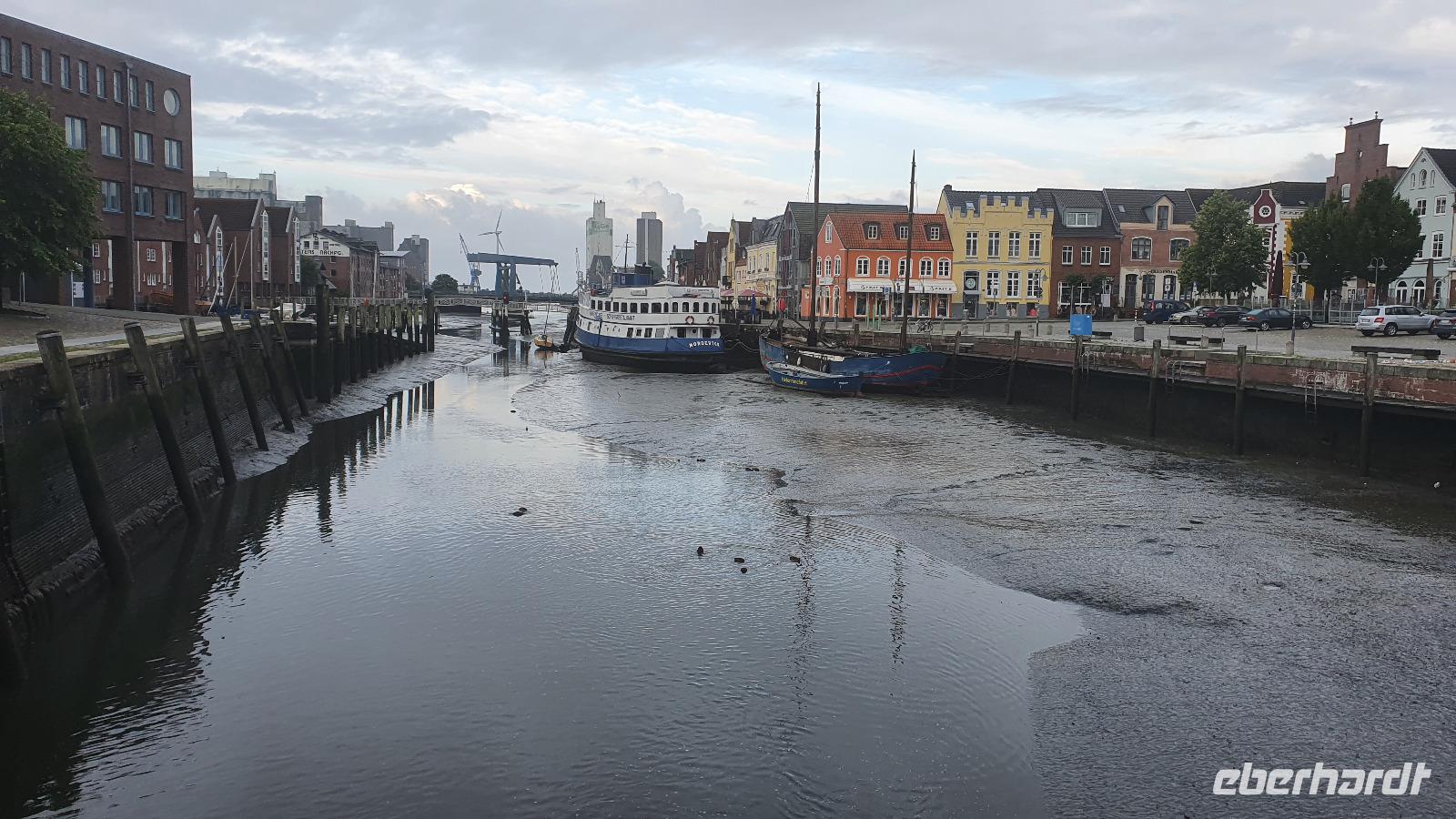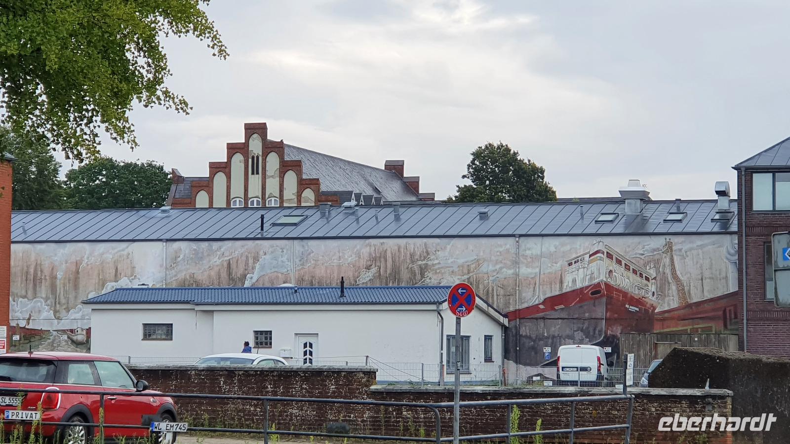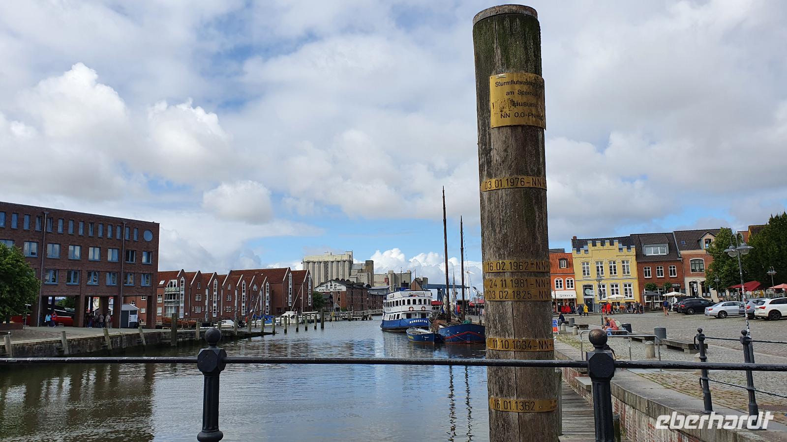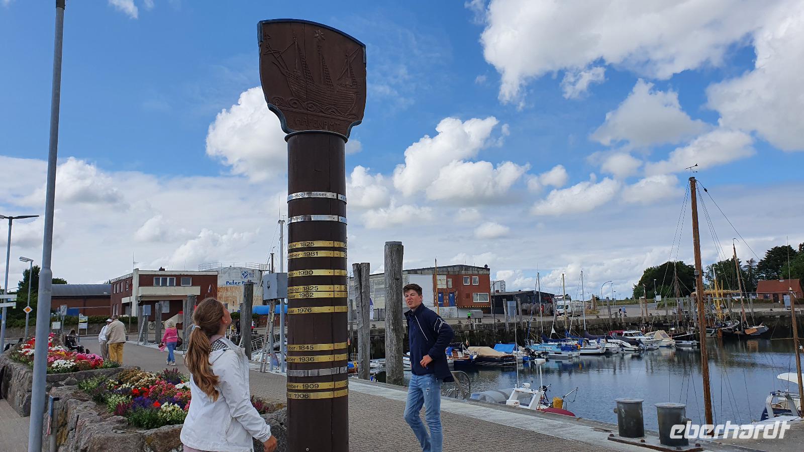 zeigt die Pegel der Fluten an, allerdings gemessen am Außenhafen- wir hatten schon gedacht, dass tatsächlich die ganze Stadt unter Wasser gestanden hat. Aber Margrit erzählt von den Fluttoren, die die Stadt schützen und den Deichen, die nun als Klimadeiche gebaut oder erneuert werden. Unsere nächste Station ist das