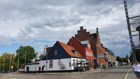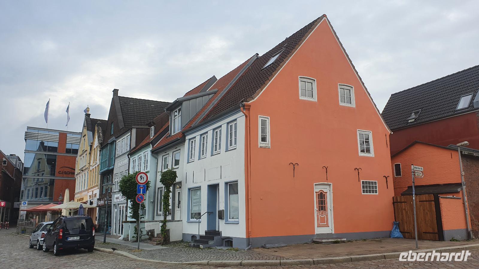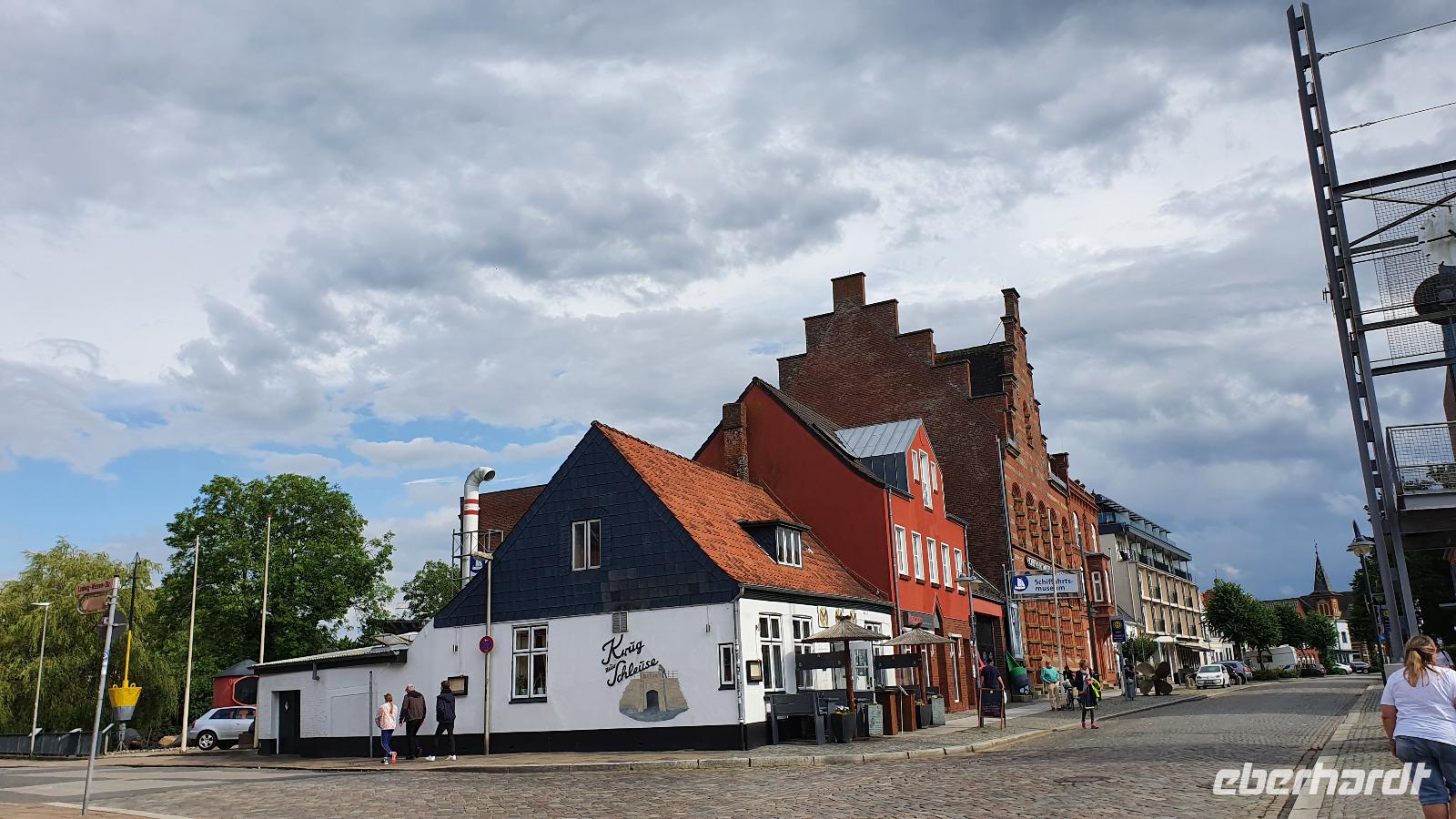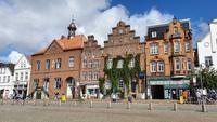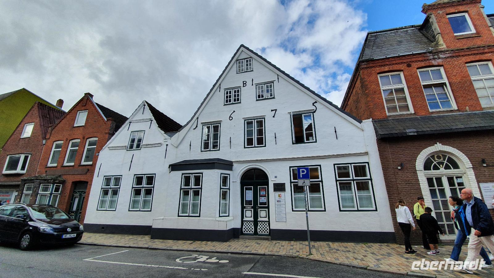 mit zwei erfahrenen Gästeführerinnen. Also teilen wir uns auf und wer lieber langsamer unterwegs ist, der schließt sich der "Genießer-Gruppe" an. Gleich auf den ersten Metern dann das älteste Gasthaus Husums, das Schiffahrtsmuseum und auch das neue Rathaus der Stadt- naja, so neu nur auch wieder nicht, der futuristische Bau entstand 1989 und soll an ein Schiff erinnern- gut dass Margrit uns das sagte...Der
