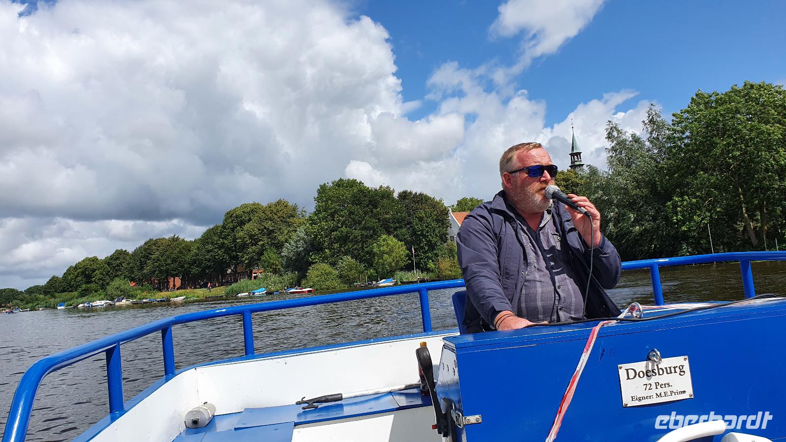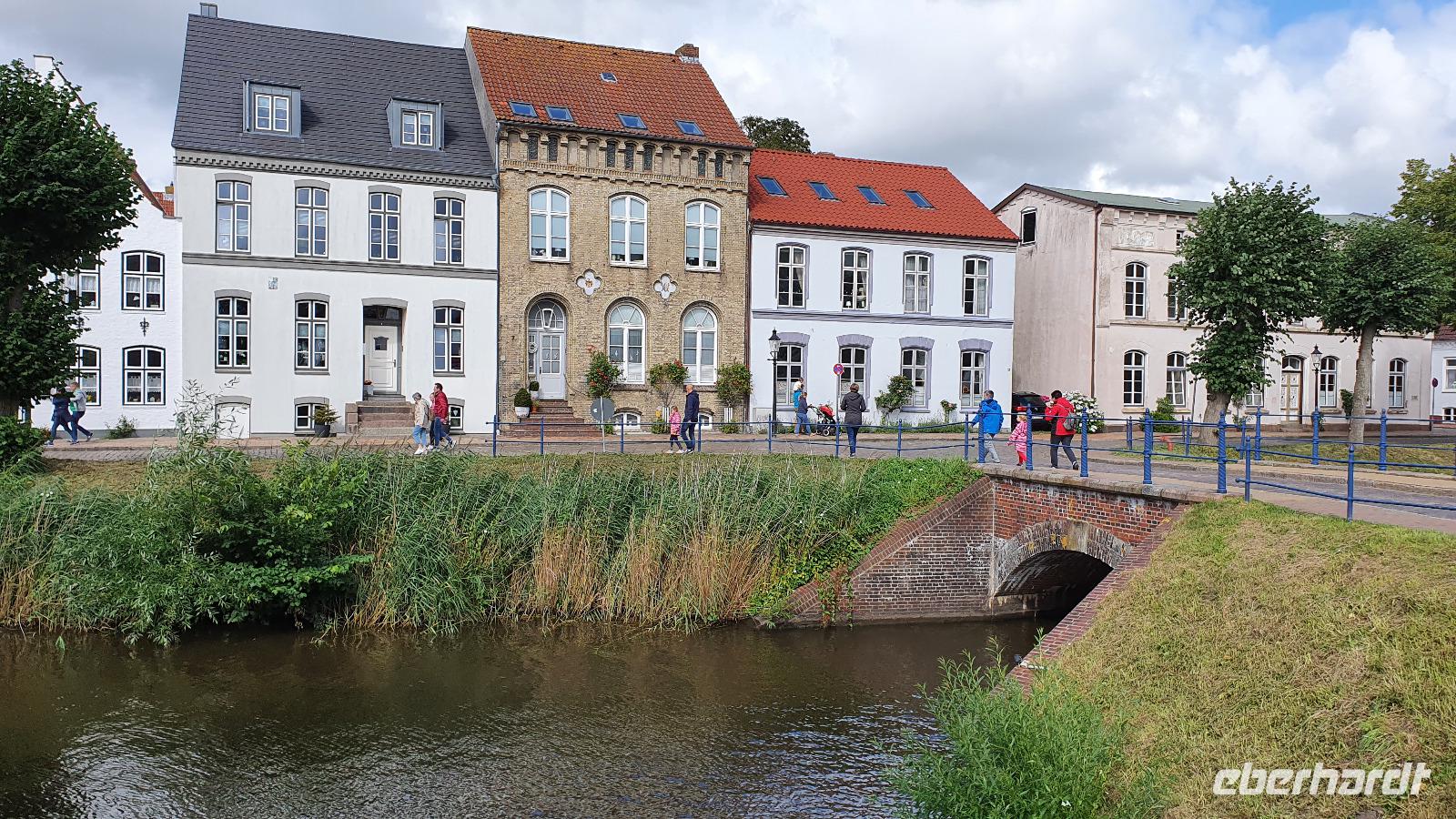 starten. Da wir eine "Cabrio" als Schiff hatten konnten wir auf den Mund- Nasen- Schutz verzichten und so die Fahrt richtig genießen. Zuerst ging es zum Binnenhafen und zur "SoDa-Brücke". Eigentlich eine Klappbrücke, die die Passage großer Schiffe ermöglichen sollte. Dumm nur, dass gleich dahinter eine weitere Brücke ist, die kann man aber nicht hochklappen, also steht die neue Brücke einfach nur "so da" und wurde noch nie geöffnet. Dann ging es hinaus auf die Treene, bis zu 200 Meter ist sie hier breit, endet aber in einem Totarm hier. Als die Treene noch ins Meer floß gab es immer wieder Überflutungen, seitdem sie hier an einem Deich endet nie wieder. Von hier aus befuhren wir dann die Kanäle des Städtchens, Fiedrichstadt hat zwar nur etwas über 2000 Einwohner, aber den Status einer Stadt. Den verliert sie auch nicht, egal wieviele (oder wie wenige) Menschen hier leben. Das alles erfuhren wir von unserem Kapitän, der auch gleich anbot, Ehen zu schließen falls jemand mochte, er würde auch Scheidungen vornehmen, das ginge fix, einer rechts ins Wasser, der andere links- fertig. Da sich niemand meldete erzählte er lieber weiter vom Leben hier in Friedrichstadt. Von den Remonstranten, die hierher kamen, weil sie ihren Glauben ausüben durften und besonders geschickt im Deichbau waren, zeitweise gab es bis zu 13 Konfessionen, die hier friedlich mit- und nebeneinander lebten, heute sind es noch 5. Vorbei ging die Fahrt an den