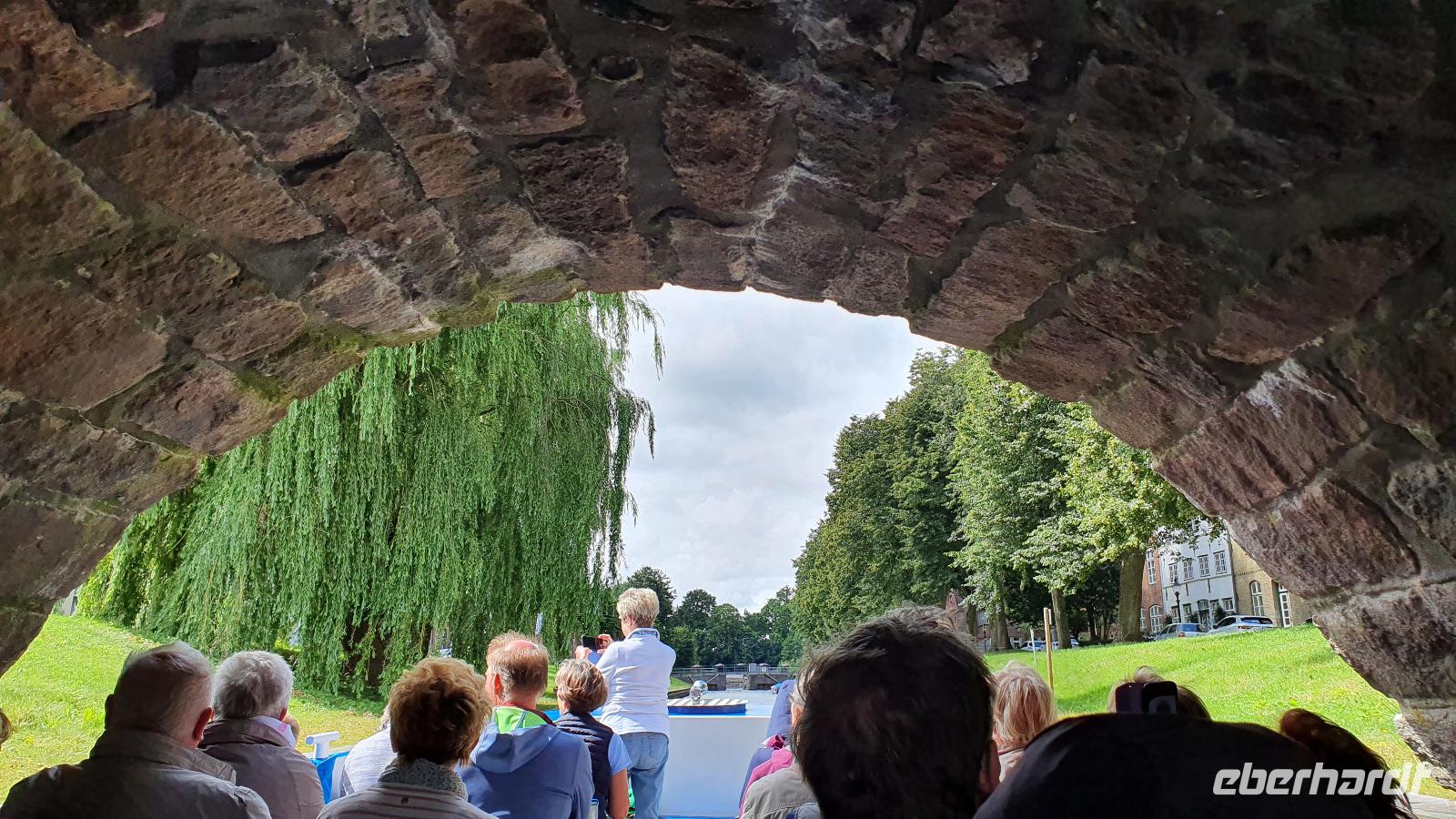 die schmal, aber hoch gebaut waren, so konnte man die Grundsteuer niedrig halten. Viele Kinder wurden hier geboren, nur wohnte die Hebamme auf der anderen Seite des Flussarmes. Als sie es wieder einmal nicht rechtzeitig zu einer Geburt schaffte bat sie um Abhilfe und es wurde tatsächlich eine Brücke gebaut, die "Hebammenbrücke". Unsere Fahrt führte an wunderschönen Gärten und Grundstücken vorbei, durch niedrige und schmale Brücken, die wir mit unserem Schiff geradeso noch durchfahren konnten, und viel zu schnell verging dabei die Zeit. Schon waren wir wieder an der Anlegestelle zurück. Nun konnte sich jeder individuell umsehen, zum Markt spazieren oder vielleicht in einem Cafe eine
