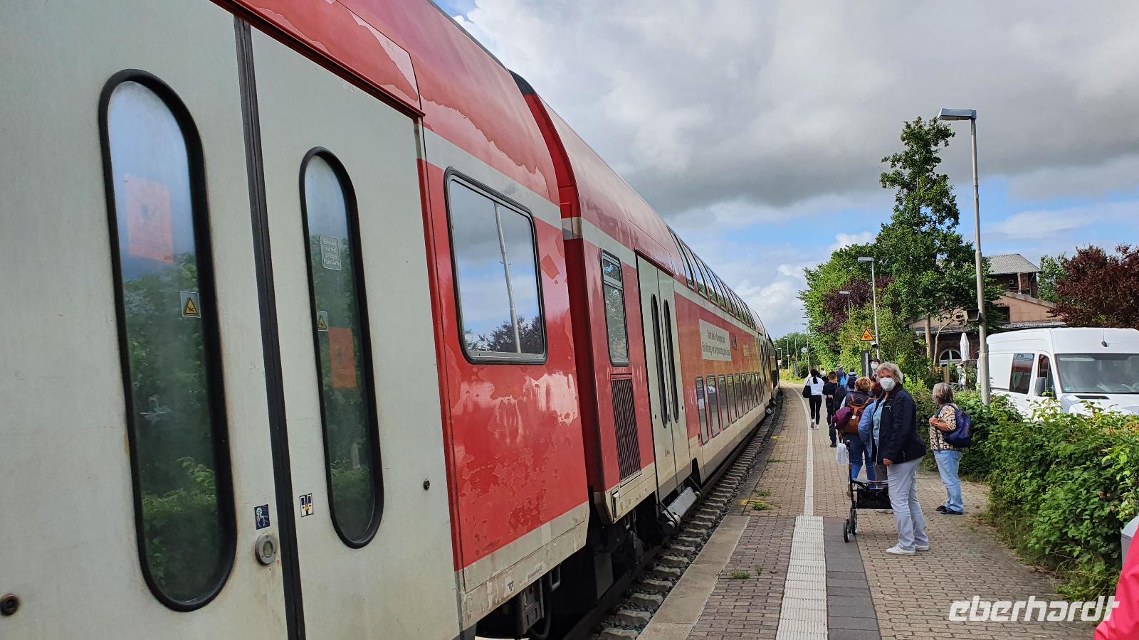 Wir nehmen den Zug, also geht es zum Bahnhof von Husum. Dabei stellten einige doch fest, dass sie schon seit Jahren nicht mehr mit dem Zug gefahren sind- was man auf so einer Reise nicht alles erlebt...Eine kleine Schrecksekunde beim Aussteigen: unsere Tür ließ sich nicht öffnen, also fix in den anderen Wagen und dort aussteigen. Aber alles ging gut und so spazierten wir gemeinsam zur Anlegestelle der Prinzenlinie. Hier sollte unsere