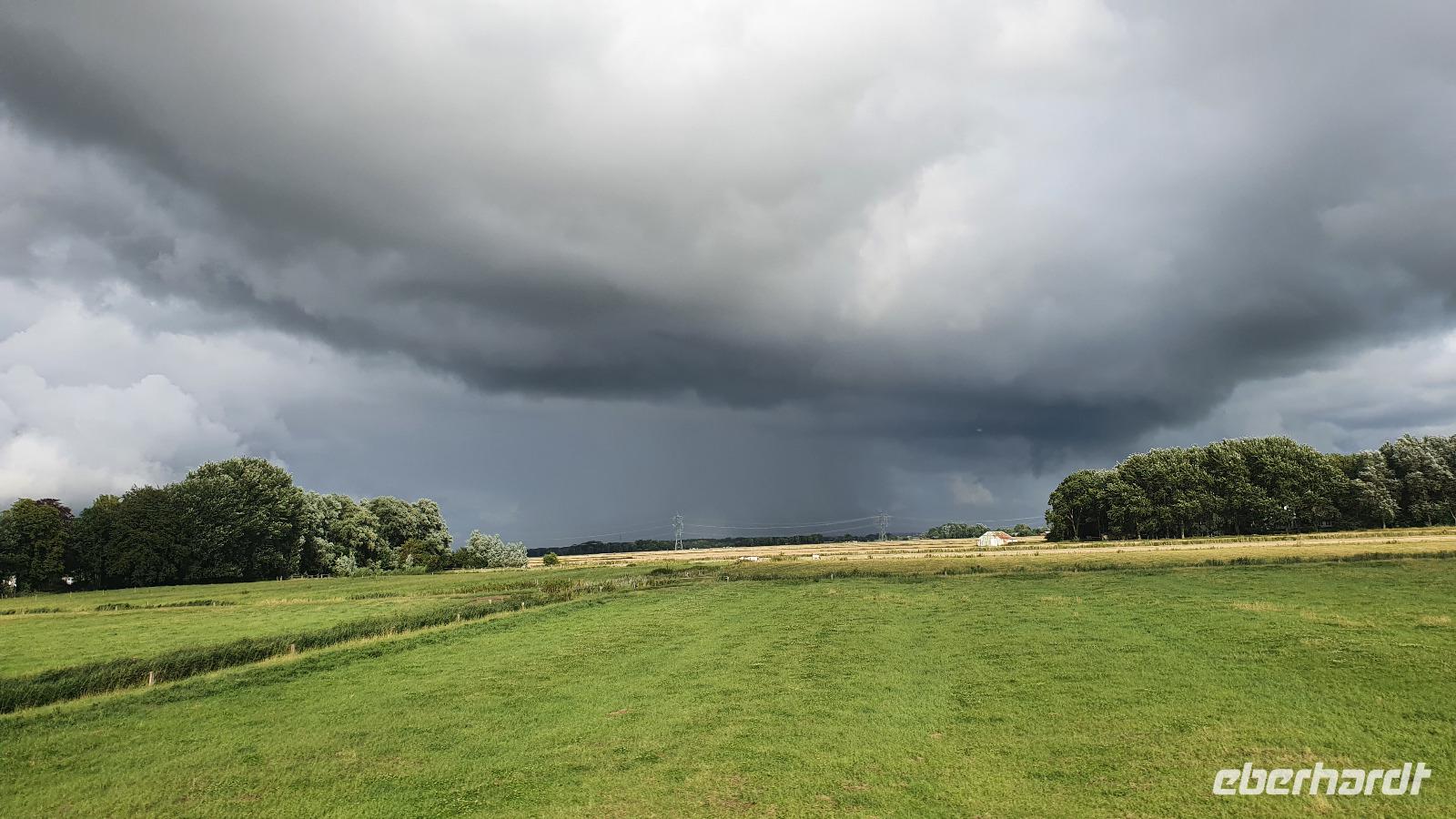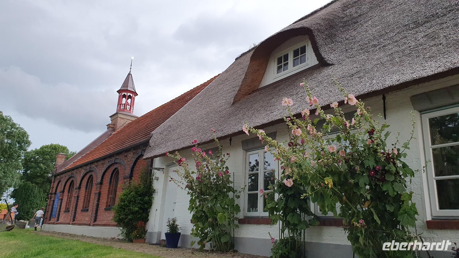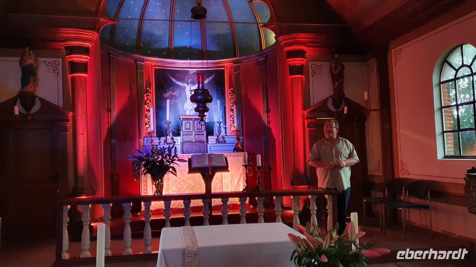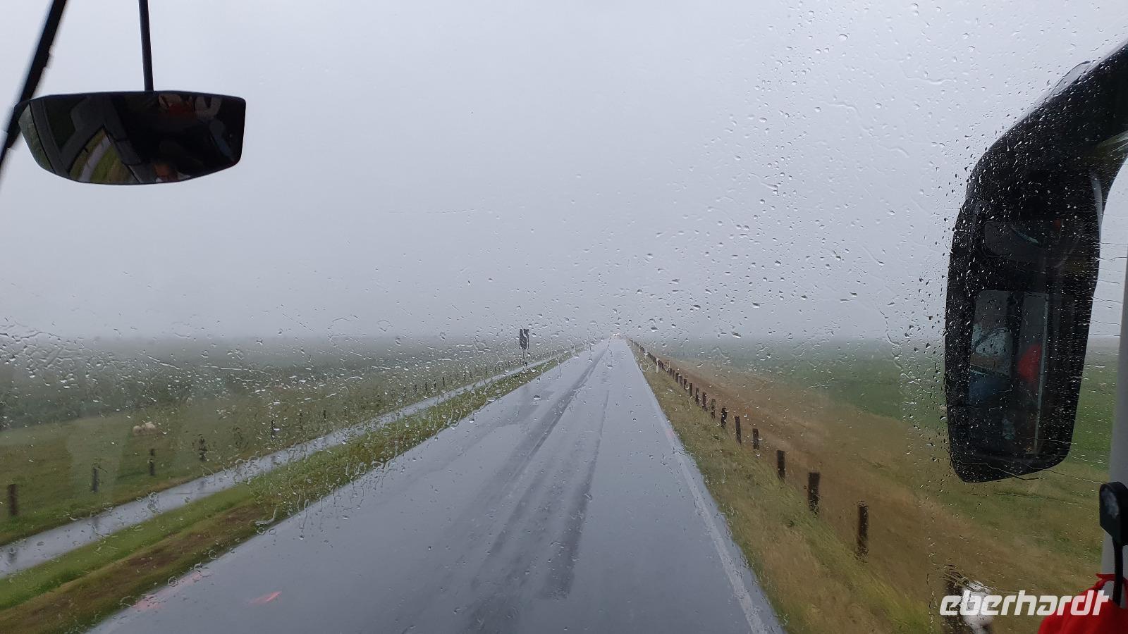 Erst jetzt waren uns die Gezeiten dafür gnädig, die Ebbe setzt heute gegen 15 Uhr ein und so erreichen wir ca. 15.45 Uhr den Deich auf Nordstrand. Hier zogen sich jedoch dunkelste Gewitterwolken zusammen und ein Grollen kündigte das nahe Unwetter an. Hatten wir gehofft, davon verschont zu werden, so wurden wir nun eines besseren belehrt. Also hieß es wieder Schuhe anziehen und leider kein Ausflug ins Watt. Dafür schauten wir uns den Hafen in Strucklahnungshorn an und fuhren zur Altkatholischen Kirche. Zufällig war Pfarrer Schmidt hier und so erzählte er uns von der Geschichte und Besonderheit der Kirche und ihrer Gemeinde. In strömendem Regen ging es zurück zum Bus. Das Unwetter begleitete uns noch ein ganzes Stück auf unserer Fahrt nach Husum und wir waren froh, im sicheren und warmen Bus sitzen zu können. Wir verabschiedeten uns von Hilke, die uns die zwei Tage hier begleitet hat und dankten ihr herzlich. Zurück am Thomas Hotel in Husum übernahm Maik mit unserem Bus die Transfere zum Hotel Osterkrug und zurück zum Abendessen, so dass wir gemeinsam den Tag bei einem leckeren Essen ausklingen lassen konnten. Wie immer meinte es die Küche des Hotels ausgesprochen gut mit uns. Auch das Wetter meinte es wieder besser mit uns und zum Sonnenuntergang gab es tolle Fotos.