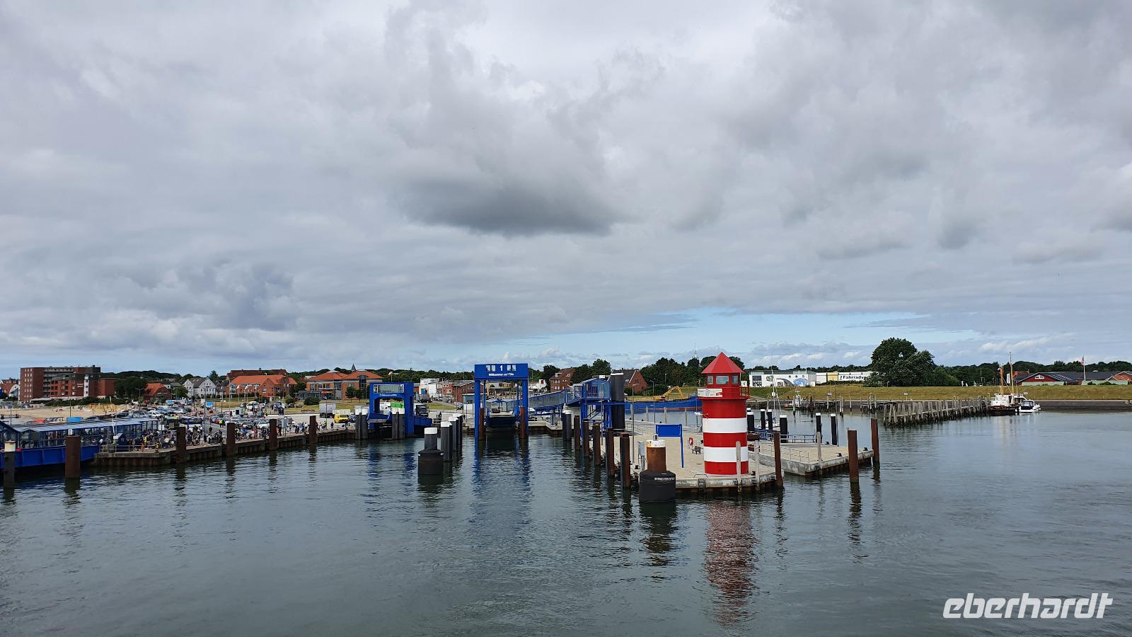 Maik hatte eine wunderschöne Route ausgesucht, direkt an der Küste entlang und so konnten wir bei toller Sicht die Halligen erkennen mit ihren Warften, auf denen die Häuser gebaut sind. Direkt am Deich ging es entlang und im Hinterland sehen wir jede Menge Wasservögel, die es sich an den Bächen und Seen gut gehen lassen. Manche bleiben gleich und verbringen auch den Winter hier. Am Hafen von Dagebüll angekommen spazieren wir gemeinsam zum Anleger, jeder bekommt sein Ticket und dann kommt auch schon unsere Fähre: die "Nordfriesland". Jeder sucht sich einen Platz, der ihm oder ihr gefällt, drinnen oder doch lieber draußen- auf jeden Fall ist wunderbar klares und ruhiges Wetter, so dass wir die Überfahrt mehr als genießen. Schon von weitem sehen wir den rot-weißen Leuchtturm am Hafen von