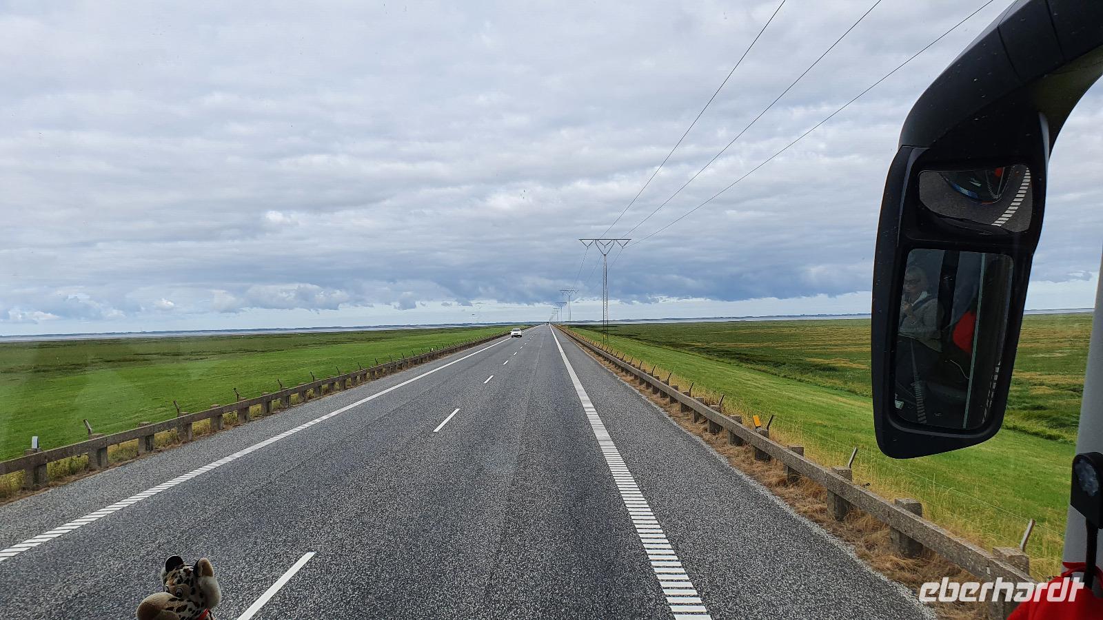 Wie immer heißt es am Anreisetag: zeitig aufstehen. Mit den ersten Sonnenstrahlen steigen auch die ersten Gäste in Dresden in unseren Reisebus. Maik, unser Fahrer, fährt souverän und umsichtig. In Döbeln und Leipzig steigen weitere Gäste zu und mit den obligatorischen Pausen haben wir bald die A10 erreicht- und stehen im Stau. Dabei waren wir so froh, an einem Sonntag unterwegs zu sein, ohne LkWs...Aber die Baustellen fordern trotzdem ihren Tribut und unser letzter Gast mußte sich ordentlich gedulden, bis auch sie in unseren Bus einsteigen konnte. Nun waren alle an Bord und so konnten wir uns mit dem Programm der vor uns liegenden Woche vertraut machen. Als Einstimmung gab es eine kleine filmische Zusammenfassung der Erlebnisse der letzen Reise, die ich begleiten durfte. Vielleicht auch eine Entscheidungshilfe für die fakultativen Ausflüge, die zur Auswahl standen. So näherten wir uns Nordfriesland und mit kleinen Geschichten zu Land und Leuten, Sehens- und Bemerkenswertem unterwegs erreichten wir schließlich unser
