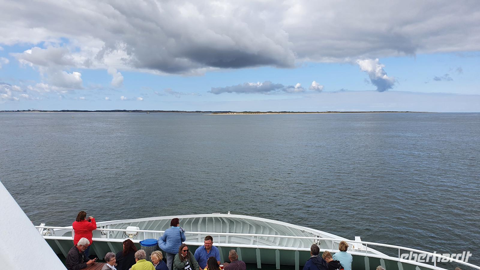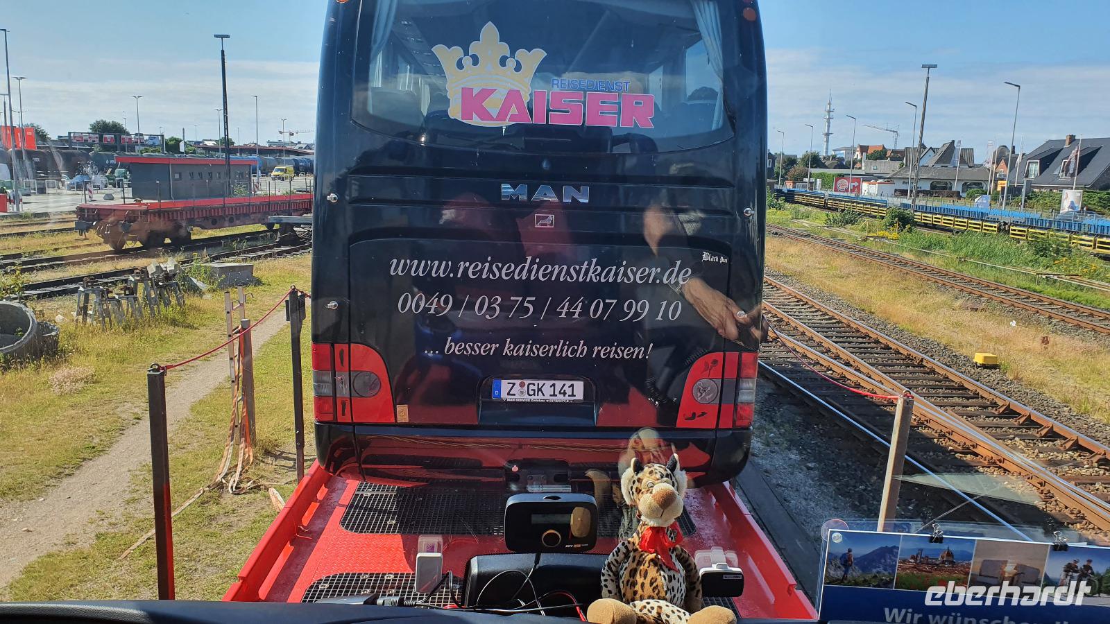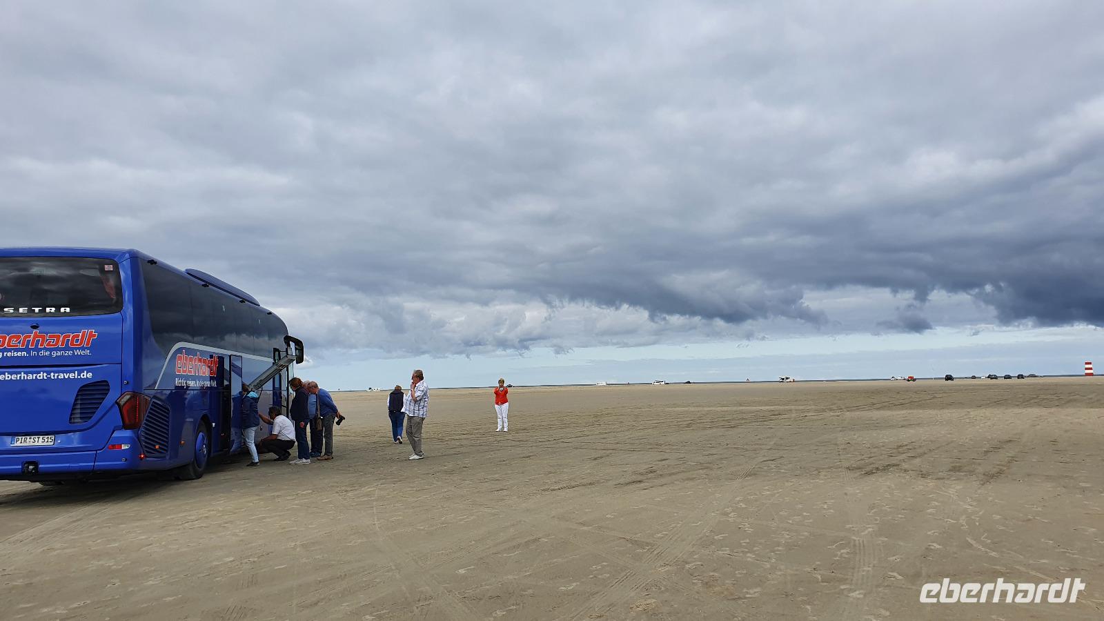 Vorher aber ging es durch Töndern, ein hübsches Städtchen, in dem es ein "Stuhl- Museum" gibt. Und natürlich noch viel mehr, auch eine Klöppelschule gibt es, wer hätte das hier vermutet? Auf Rømø gab es dann ein Highlight vor allen Dingen für unseren Busfahrer Maik. Er konnte mit unserem Bus eine Runde auf dem großen Sandstrand drehen. Natürlich stiegen auch alle Gäste aus und genossen einen kleinen Spaziergang auf dem Strand. Pünktlich kamen wir dann am Hafen von Havneby an. Hier legt die Syltfähre ab, die nach List fährt. So können wir sagen, dass wir am nördlichsten Punkt Deutschlands waren. Unsere Fähre kommt pünktlich und wir fahren mit unserem Bus hinauf. Das Aussteigen wird eng, gar zu nah sind die Busse aneinander eingewiesen worden. Aber wir schaffen das und genießen die Überfahrt nach
