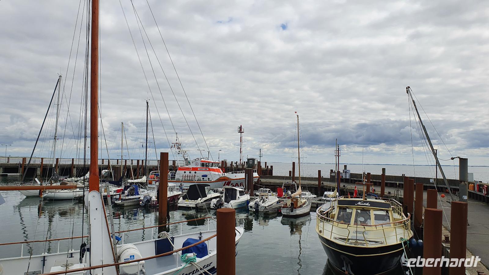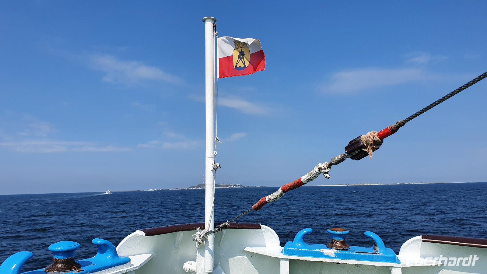 entschieden haben. Alle anderen genießen den Tag in Husum und Umgebung. Wir fahren nach Büsum und gehen hier an Bord unserer "Funny Girl". Sie bringt uns zur einzigen deutschen Hochsee-Insel. Immerhin sind wir mehr als 2 1/2 Stunden hierhin unterwegs. Befürchtungen vor Seegang oder Wellen zertreuten sich rasch, je weiter wir auf See hinaus kamen desto mehr rissen die Wolken auf. Die See war ruhig und ermöglichte eine tolle Überfahrt. Pünktlich zum Mittag legten wir im Hafen von Helgoland an, das bis dato übliche Ausbooten mit kleineren Booten zum Hafen entfiel wieder wegen Corona. Ein Großteil der Gruppe spazierte hinauf aufs Oberland, den