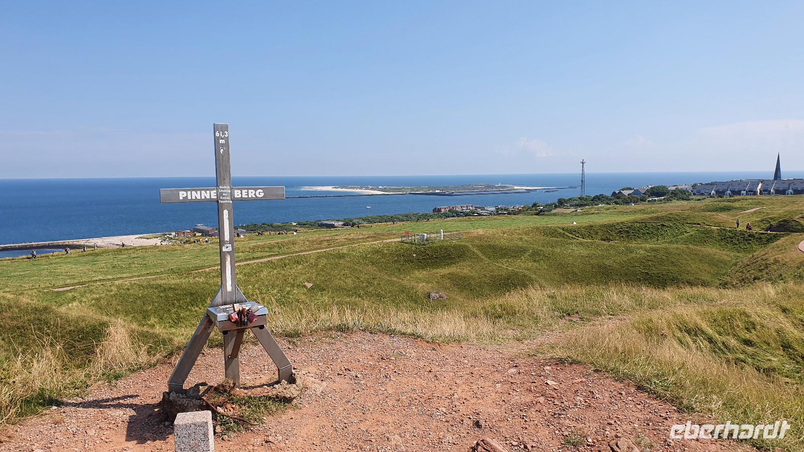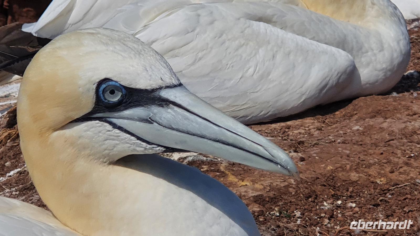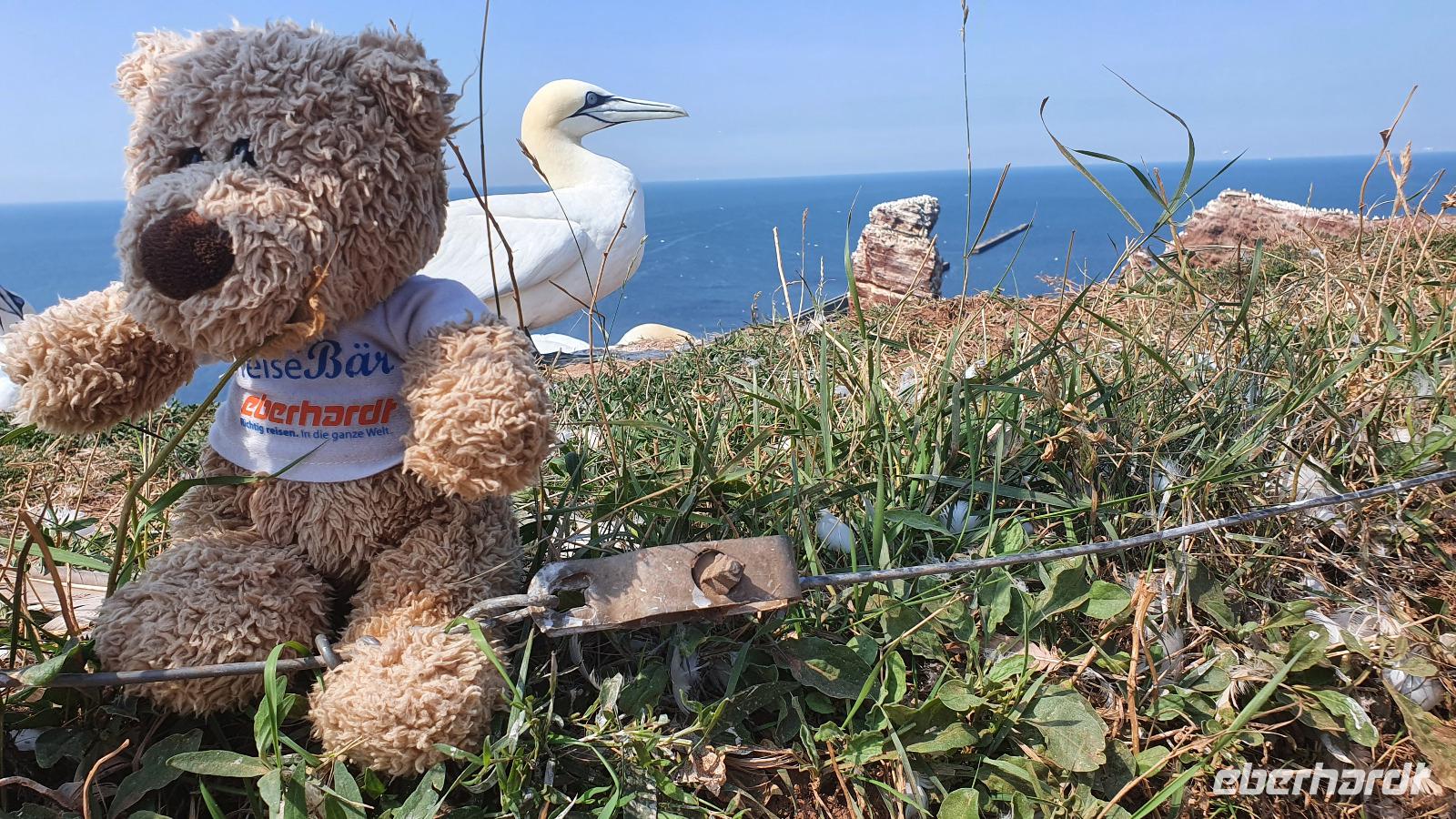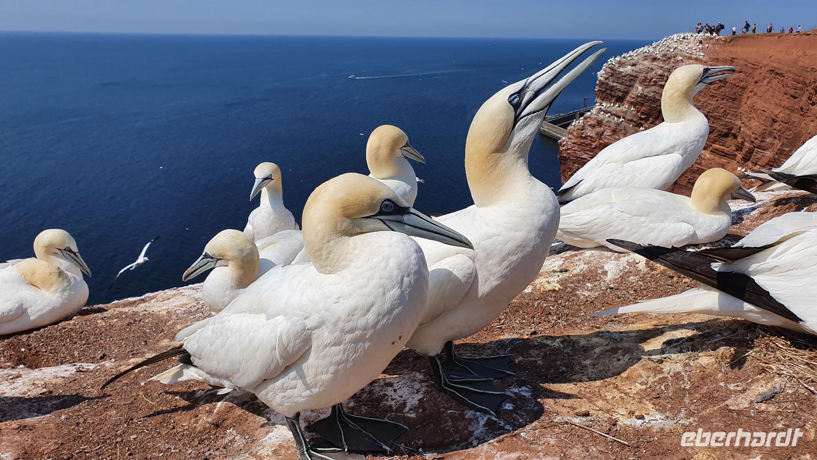 entlang. Dieser führt direkt an der Steilküste im Westen entlang zur "Langen Anna", dem Wahrzeichen Helgolands. Vorher aber genossen wir tolle Ausblicke auf den Hafen, die sogenannte "Hummerschere", alles aufgeschüttet und dem Meer abgerungen. Und dann kam der "Lummenfelsen". Einstmals für seine Kolonien der Lummen bekannt wird er heute auch von den Basstölpeln zum Brüten genutzt. Mit einer Flügelspannweite bis zu 2,70 Metern äußerst imposante Vögel! Ganz nah kann man an sie herangehen und erleben, wie sie ihre Jungen aufziehen. Was für ein Erlebnis! Zurück im Osten Helgolands schweift der Blick hinüber zur Düne. Hier sonnen sich Seehunde, kann man baden oder auch Campen. Zurück ins