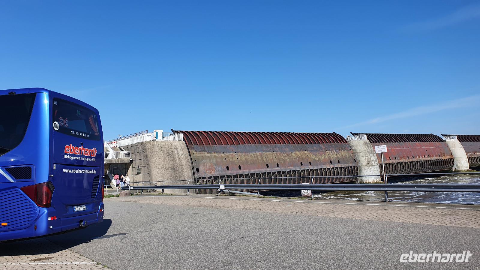 Die holländischen Deichbauer, die ins Land geholt wurden, haben ihre Anwesen erbaut: sogenannte Haubarge (Hau= Heu + Barg= groß) Viele davon sind verfallen, aber etliche konnten durch privates Engagement gerettet werden. An einem davon fuhren wir direkt mit dem Bus vorbei. An der Eider ging es weiter entlang, mit 188 Kilometern der längste Fluss Schleswig-Holsteins. Sie entspringt 8 Kilometer vor der Ostee und um eine Verbindung zwischen Nord- und Ostsee zu haben wurde vor ca. 400 Jahren der Eiderkanal gebaut. Hier an der Nordsee mündet die Eider schließlich und wird zu einem mächtigen Strom. Durch die Küstenschutzmaßnahmen wurden die regelmäßigen Überschwemmungen verhindert und so entstand ein einmaliges Naturschutzgebiet, nicht nur für Wasservögel. Durch eines davon- das Katinger Watt- fahren wir und sehen bereits die Klimadeiche, die zum wohl bekanntesten Bauwerk des Küstenschutzes führen: zum