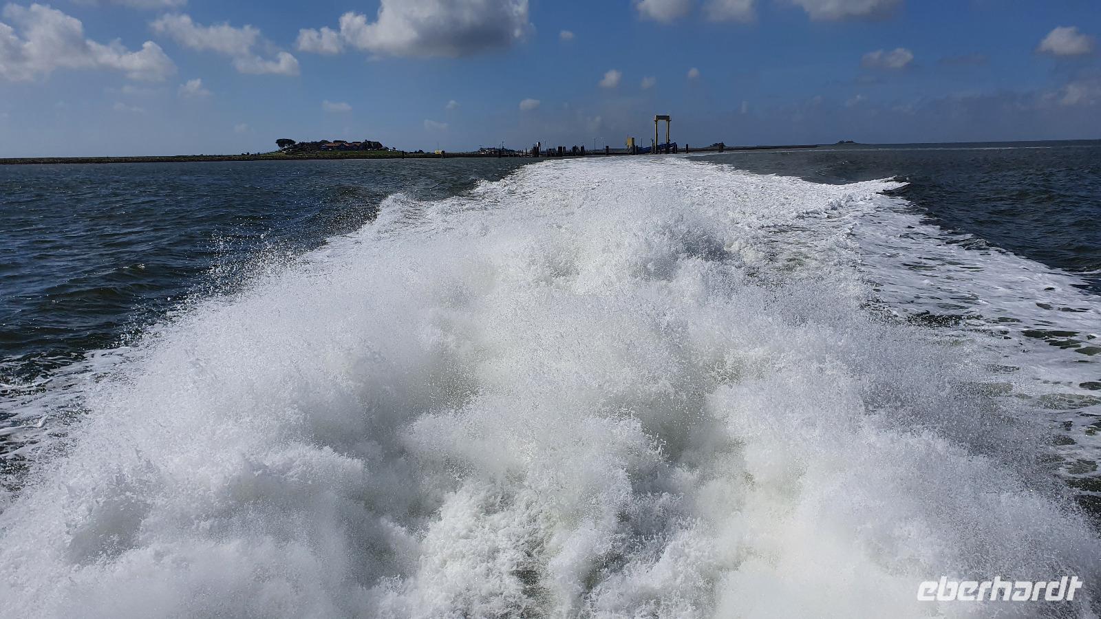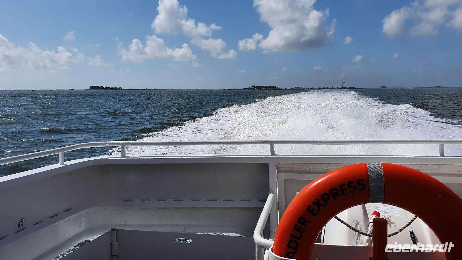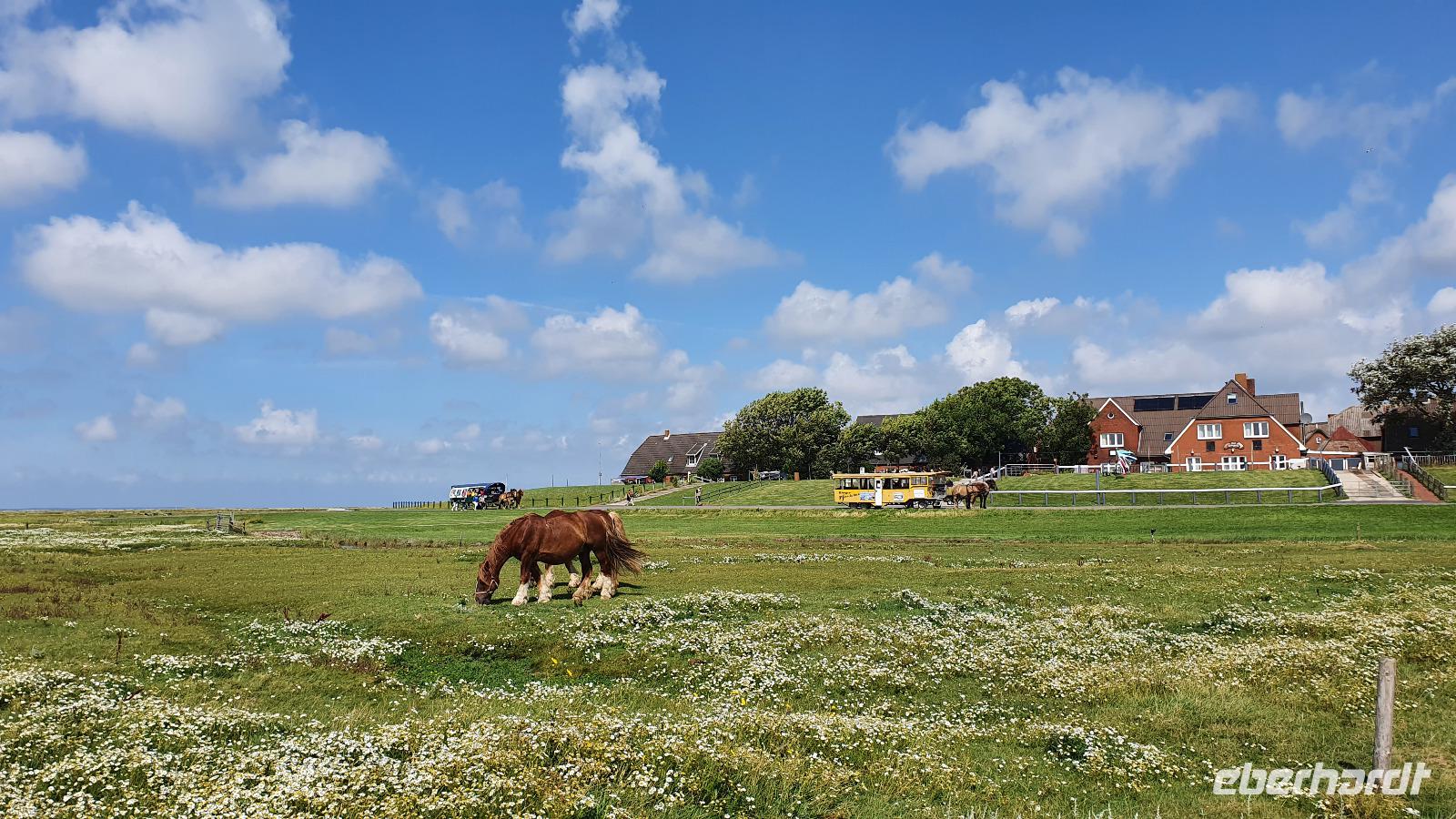 Wir fahren ab Strucklahnungshörn auf Nordstrand mit der MS "Adler Express". Und da ist der Name auch Programm. Die Bordmotore mit 2 x 1500 PS schießen pro Sekunde 6000 Liter Wasser durch und sorgen dafür, dass es tatsächlich eine Express- Überfahrt wird. Und so geht es vorbei an kleinen und großen Halligen. Das sind flache Inseln im Meer. Da sie kein Deich schützt werden sie regelmäßig überflutet. Deshalb stehen die Gebäude auf sogenannten Warften, künstlichen Aufschüttungen, die vor den Fluten schützen. Vorbei geht es an der kleinen Hallig Südfall, an der Hamburger Hallig, die über einen Damm mit dem Festland verbunden ist, an Nordstrandischmoor und der Insel Pellworm. Auf der kleinsten der Hallige- Habel- gibt es weder fließend Wasser noch Strom, sie gehört den Vogelbeobachtern. Angekommen auf Hooge können wir uns individuell umsehen. Einige nehmen den Kutschen-Express (mit 2 PS) und lassen sich komfortabel zu den Warften fahren, andere erkunden die Hallig zu Fuss oder leihen sich ein Rad aus. Auf der größten Warft-