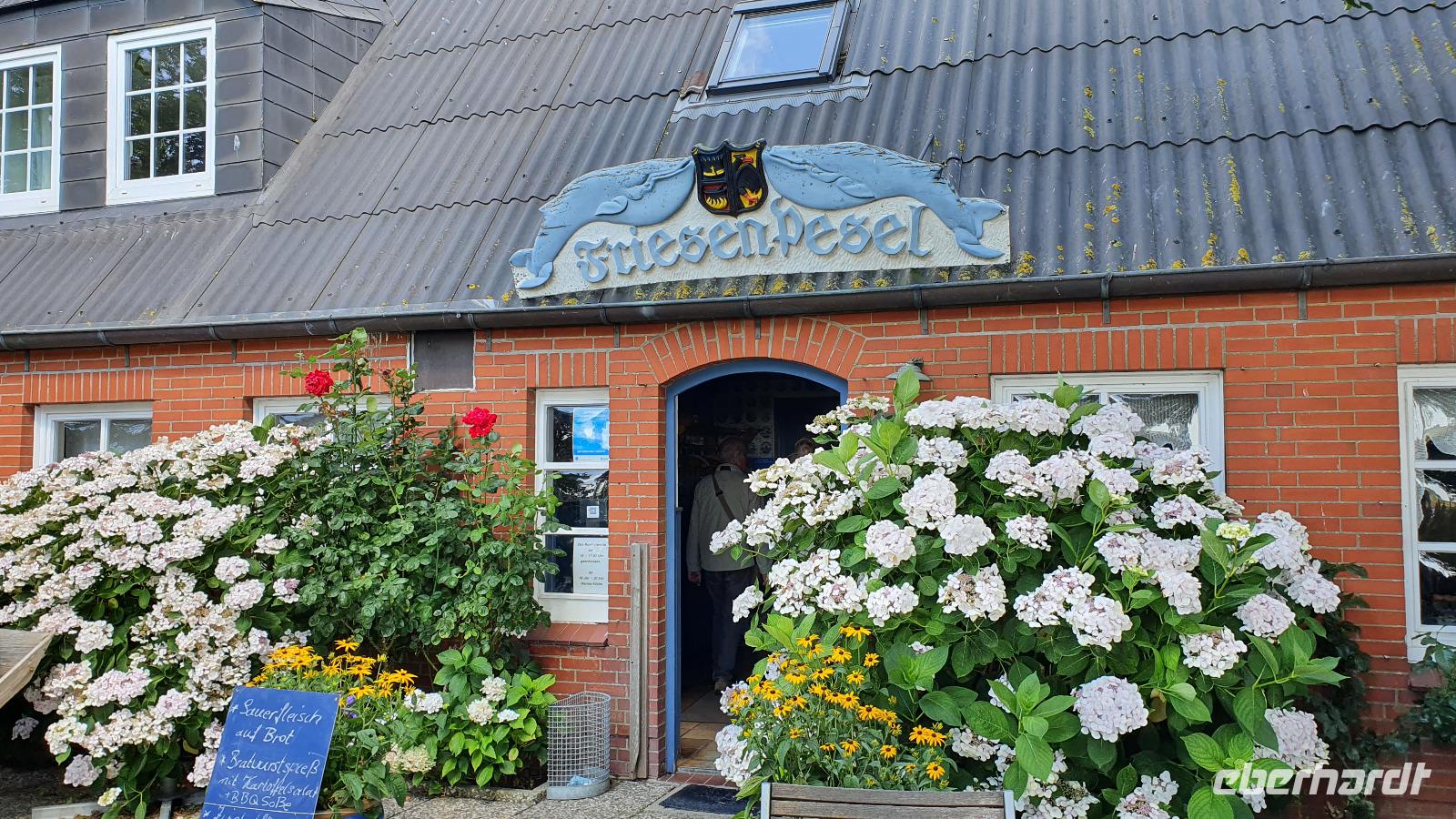 schließlich läßt es sich im Friesenpesel nochmal genussvoll schlemmen, hier sind die Wände mit flämischen Fliesen geschmückt und alles erstrahlt in weiß-blau. Am frühen Nachmittag treffen wir uns alle wieder am Anleger und es geht mit der Express-Fähre zurück nach Struecklahnungshorn auf Nordstrand. Da die Insel über den Autodamm mit dem Festland verbunden ist gelangen wir rasch wieder zurück nach Husum. Nicht jedoch, ohne vorher an den