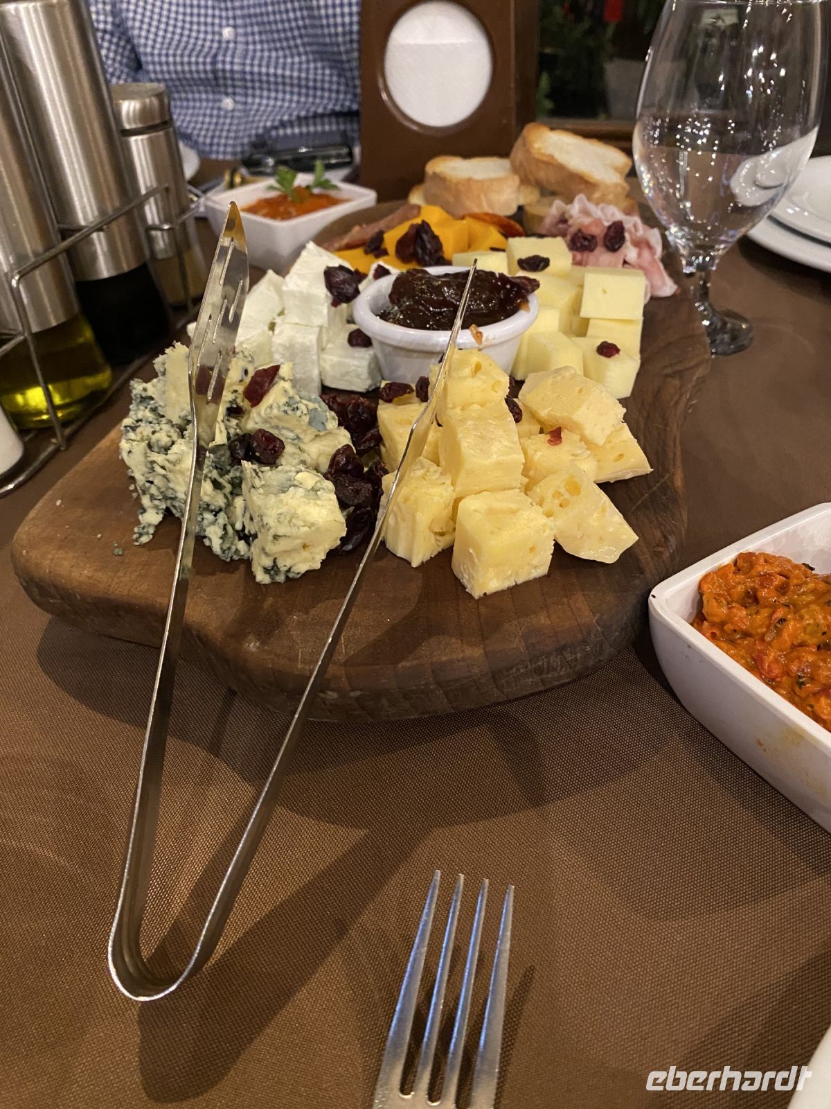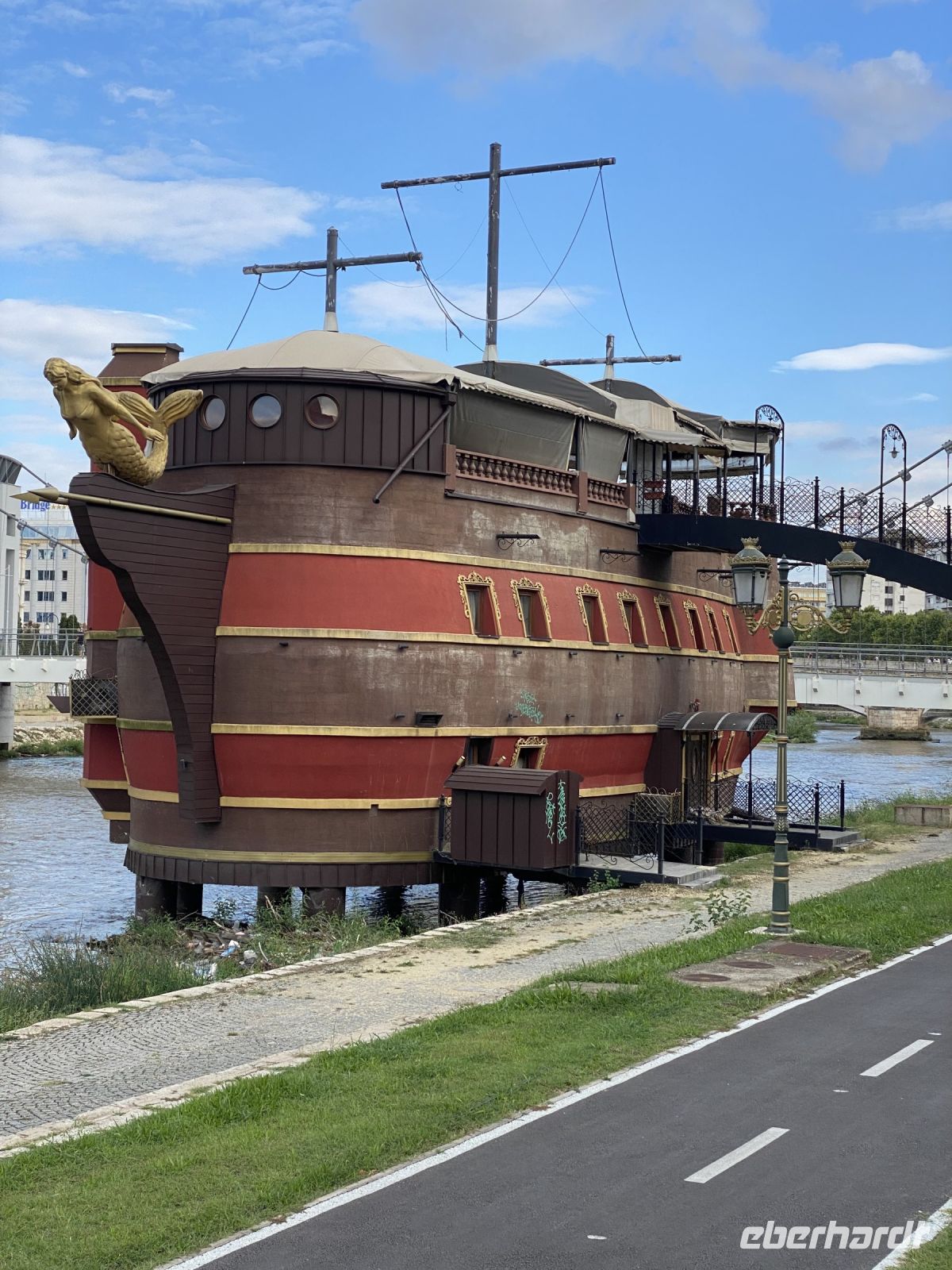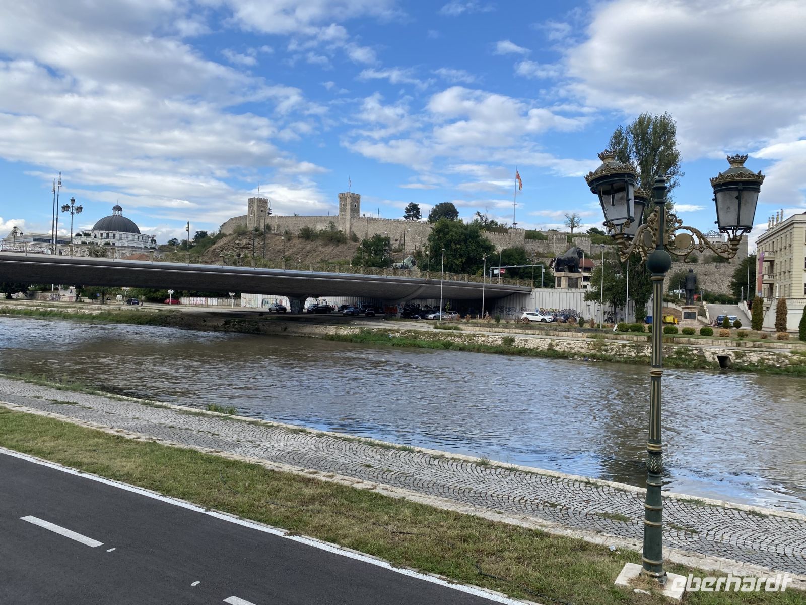 Der Rote Uhrenturm, der höchste Turm in Nordmazedonien, ist jetzt mit einer Schweizer Uhr bestückt, das bürgt wohl für Genauigkeit. Über die Steinerne Brücke gehen wir über den Vardar-Fluss zurück in die neue Stadt und Bogdan überrascht uns noch mit einer kleinen Weinprobe mi drei mazedonischen Weinen. Auf diese Weise erfrischt, kehren wir in unser Hotel zurück und finden uns 19:00 Uhr wieder am Büfett zum Abendessen ein.
