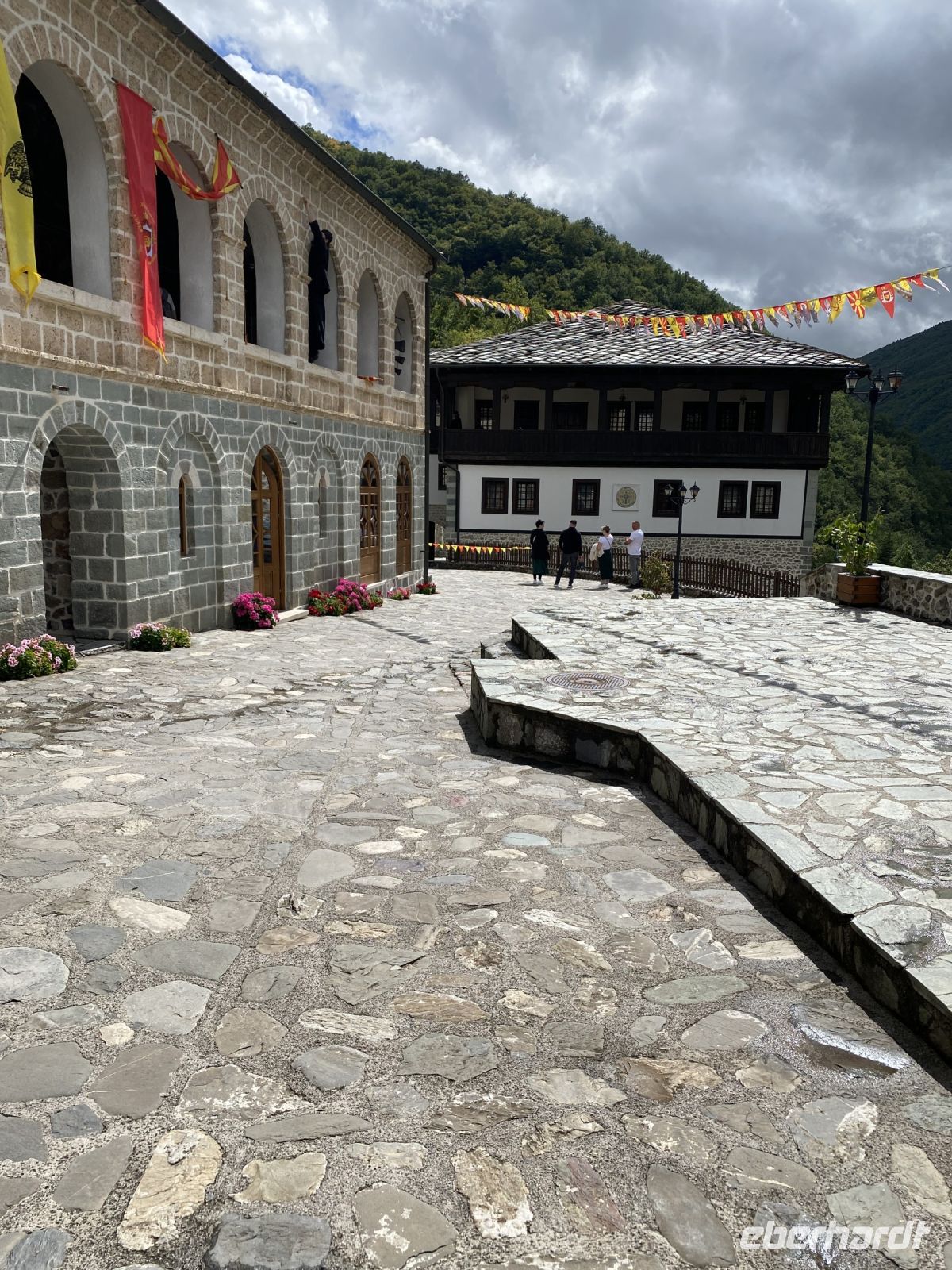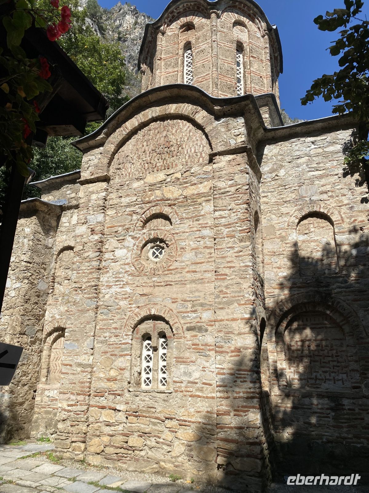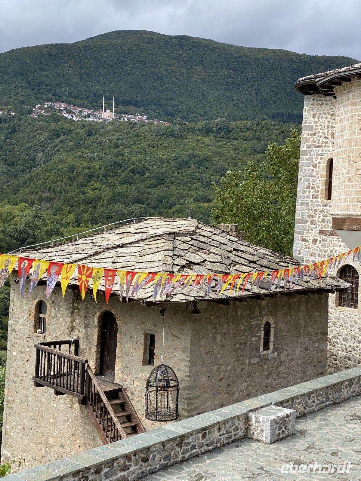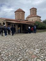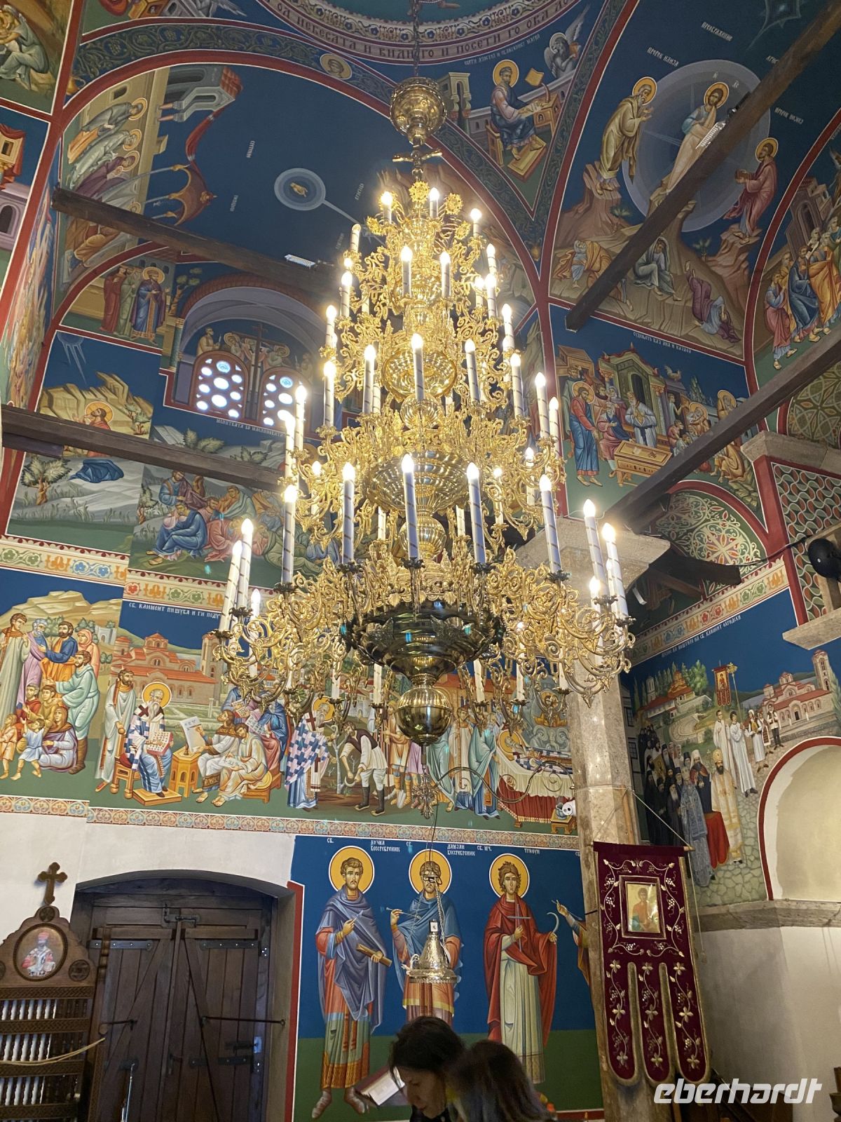 Weiter geht die Fahrt zum durch den Mavrovo-Nationalpark und eine Kaffeepause legen wir am Stausee ein. Ab und zu öffnet der Himmel noch einmal seine Schleusen, aber wir verbringen diese Zeit im Bus und fahren durch die Radika -Schlucht bis zum Kloster Johann Bigorski. Wir besichtigen die Klosterkirche und erfreuen uns am Ausblick in das hügelige Umland.