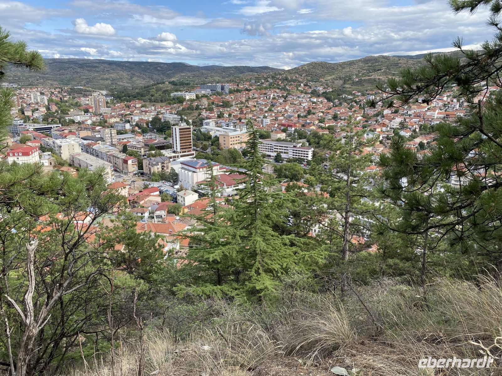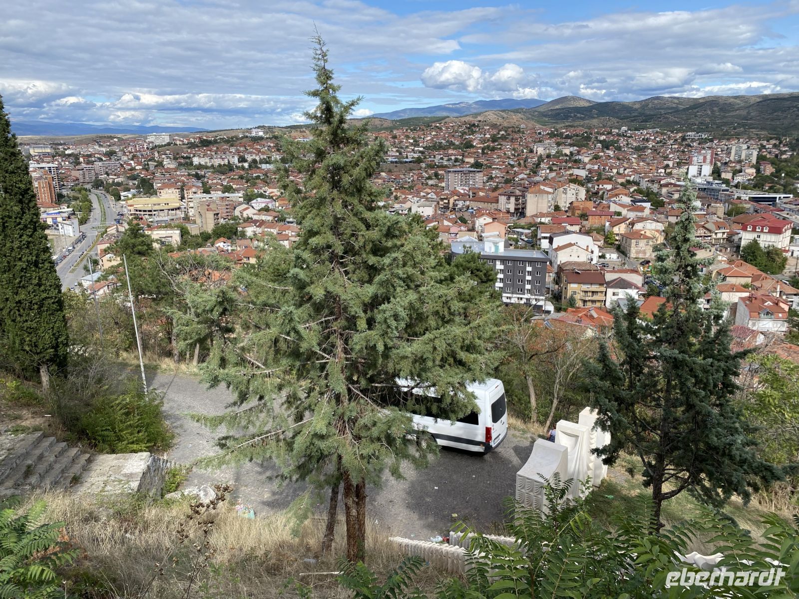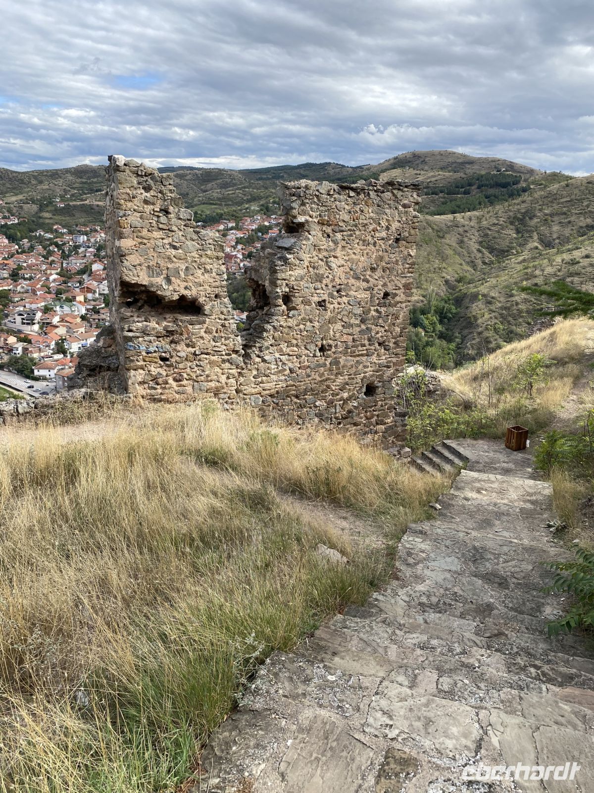 Solcherart erfrischt fahren wir nun in die Stadt Stip, früher wegen seiner umfangreichen Textilindustrie auch jugoslawisches Manchester genannt. Unser Ziel ist allerdings nicht die Industrie, sondern es sind die Reste der Burg Isar. Sie befinden sich auf einem Hügel, der mit ziemlich vielen Stufen zu erklimmen ist. Die Mauerreste sind unspektakulär, aber der Blick von oben auf die Stadt und den Fluss Bregalnica ist beeindruckend.