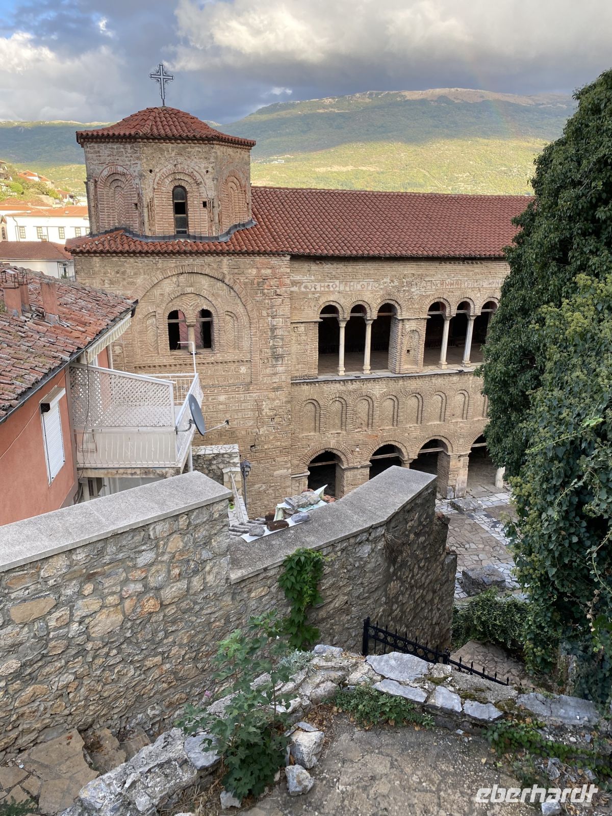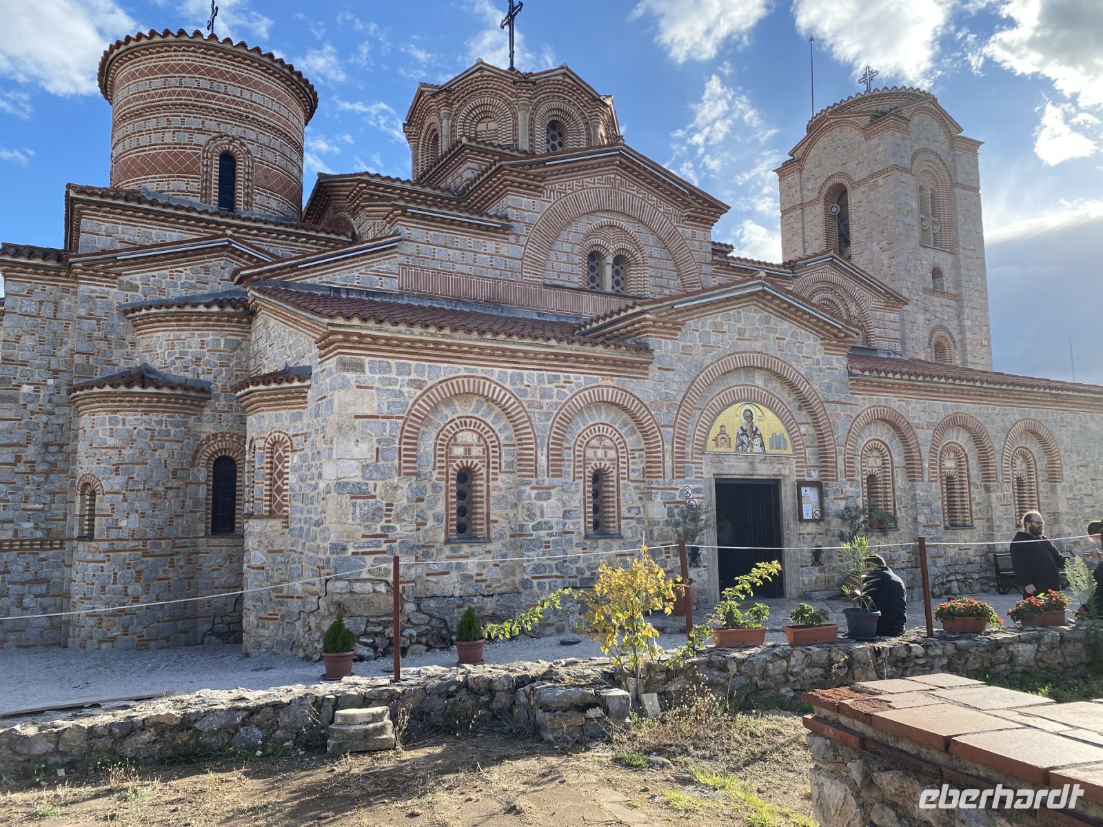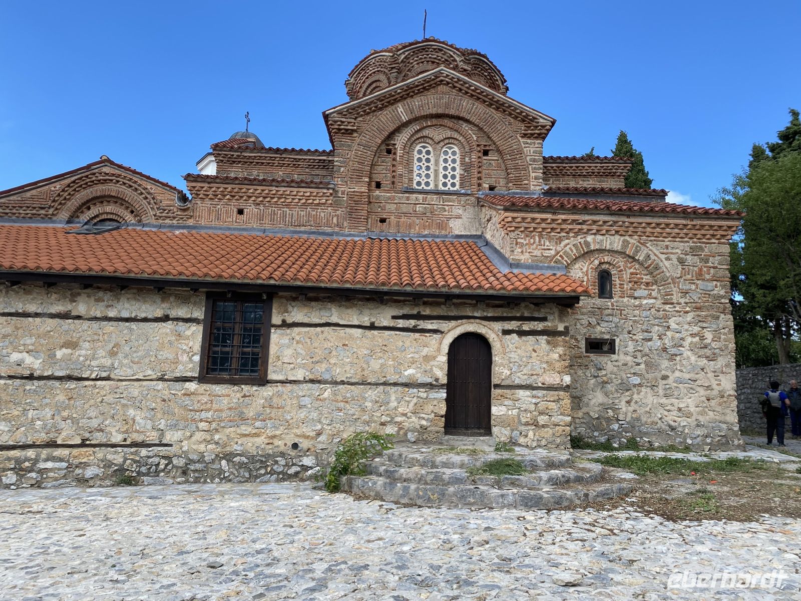 Man sagt, Ohrid hatte einst 365 Kirchen, eine für jeden Tag. Ganz so viele sind es jetzt nicht mehr, aber dennoch kann man viele Zeugnisse ihrer mehr als 2.000jährigen Geschichte finden. Die Bergfestung diente König Samuil im 10. Jahrhundert als Hauptstadt. Unter byzantinischer Herrschaft wurde die Stadt ein bedeutendes Zentrum des Christentums. Wir klettern fast bis nach oben auf den Hügel, bewundern die tolle Aussicht und wollen eigentlich die Kirche Sv. Bogorodica Perivlepta anschauen, aber hie findet eine Hochzeit statt. So gehen wir weiter zur Kirche Sv.Kliment, die als Sv. Pantelemon von den Osmanen zerstört wurde. Nun ist sie unter neuem Namen wieder aufgebaut und beherbergt das Grab des heiligen Kliment.