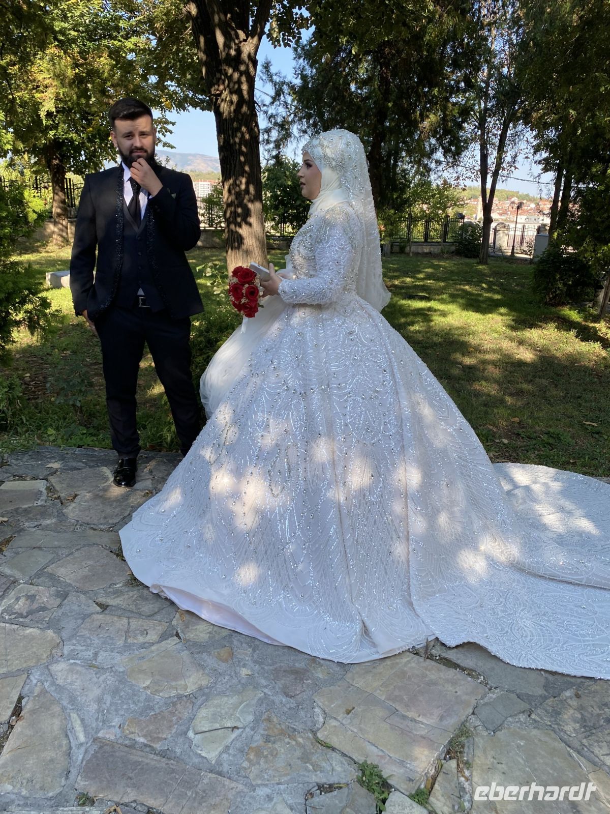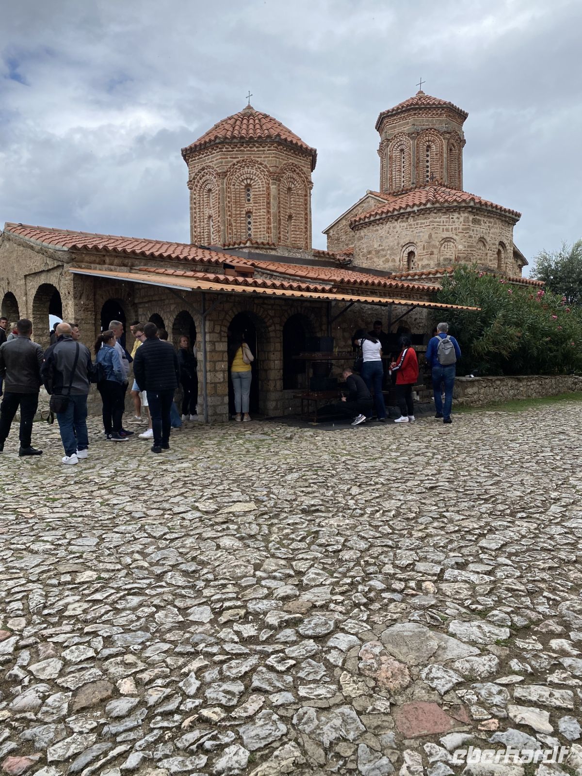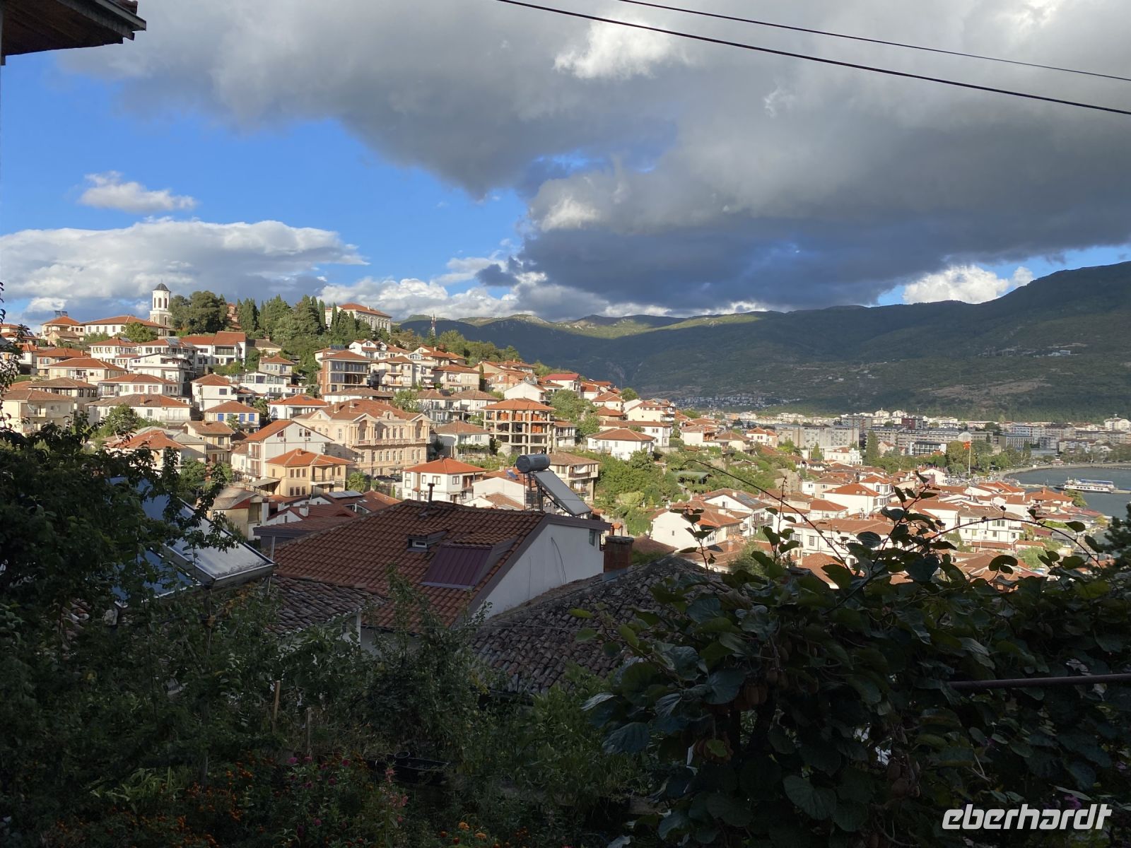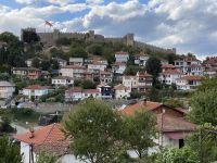 Man sagt, Ohrid hatte einst 365 Kirchen, eine für jeden Tag. Ganz so viele sind es jetzt nicht mehr, aber dennoch kann man viele Zeugnisse ihrer mehr als 2.000jährigen Geschichte finden. Die Bergfestung diente König Samuil im 10. Jahrhundert als Hauptstadt. Unter byzantinischer Herrschaft wurde die Stadt ein bedeutendes Zentrum des Christentums. Wir klettern fast bis nach oben auf den Hügel, bewundern die tolle Aussicht und wollen eigentlich die Kirche Sv. Bogorodica Perivlepta anschauen, aber hie findet eine Hochzeit statt. So gehen wir weiter zur Kirche Sv.Kliment, die als Sv. Pantelemon von den Osmanen zerstört wurde. Nun ist sie unter neuem Namen wieder aufgebaut und beherbergt das Grab des heiligen Kliment.