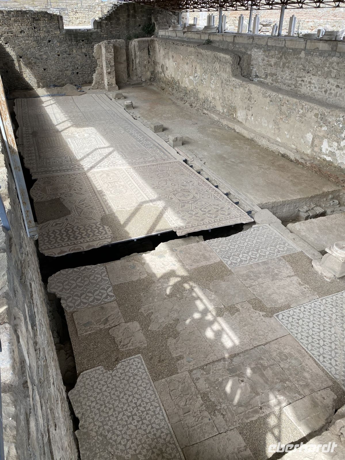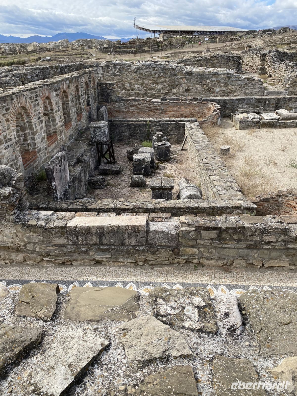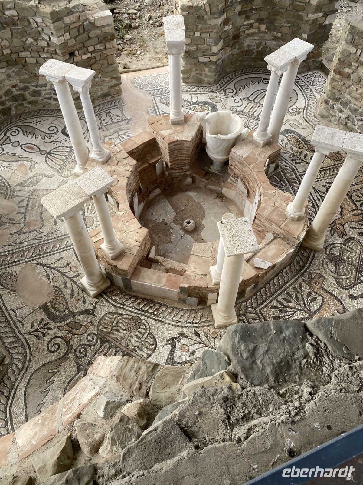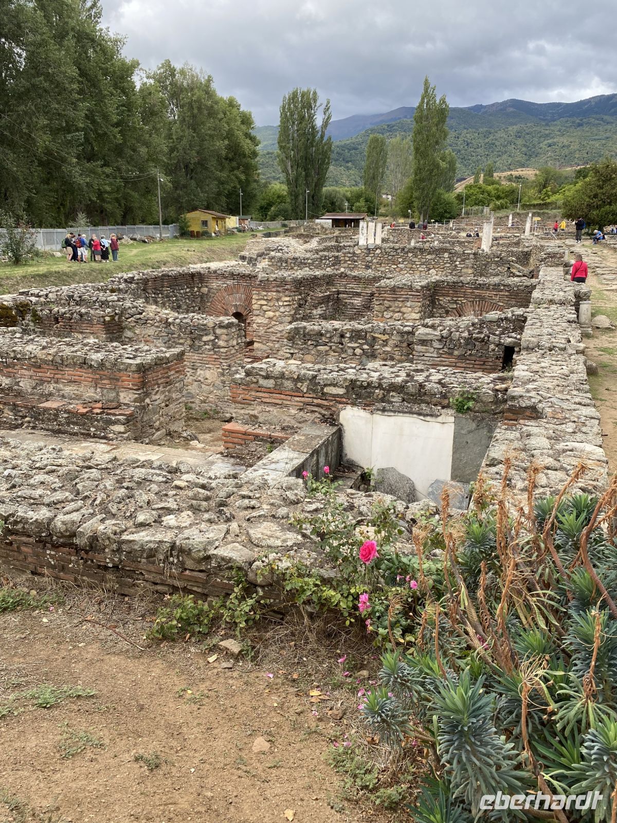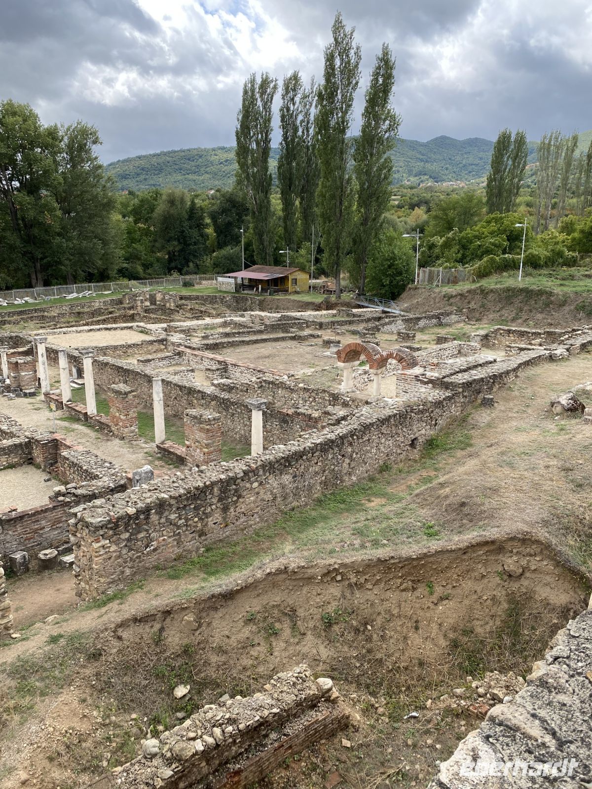 Kurze Zeit später erreichen wir Stobi, die zweite große Ausgrabungsstätte in Nordmazedonien. Auf 27 ha wurden die Reste einer römischen Stadt ausgegraben, man kann allerdings davon ausgehen, dass sie noch wesentlich größer war und sich noch viele Reste unter der Erde befinden. Wir sehen Teile der Stadtmauer, eine große Bischofsbasilika, Häuser reicher Bürger, ein Amphitheater, eine Taufkapelle mit wunderschönen Mosaiken.
