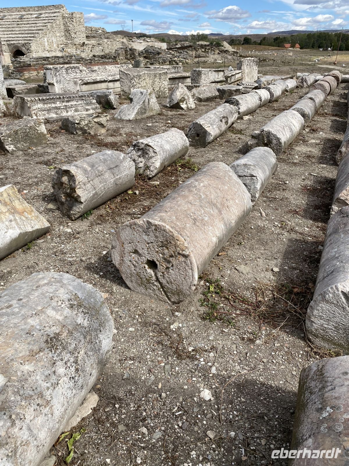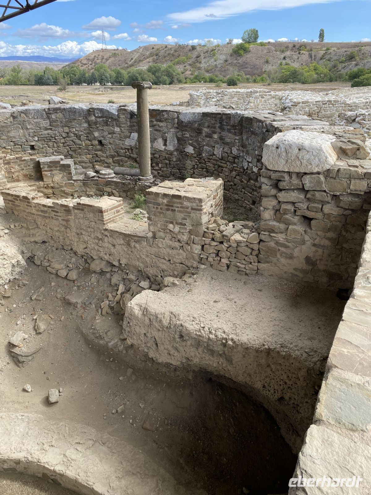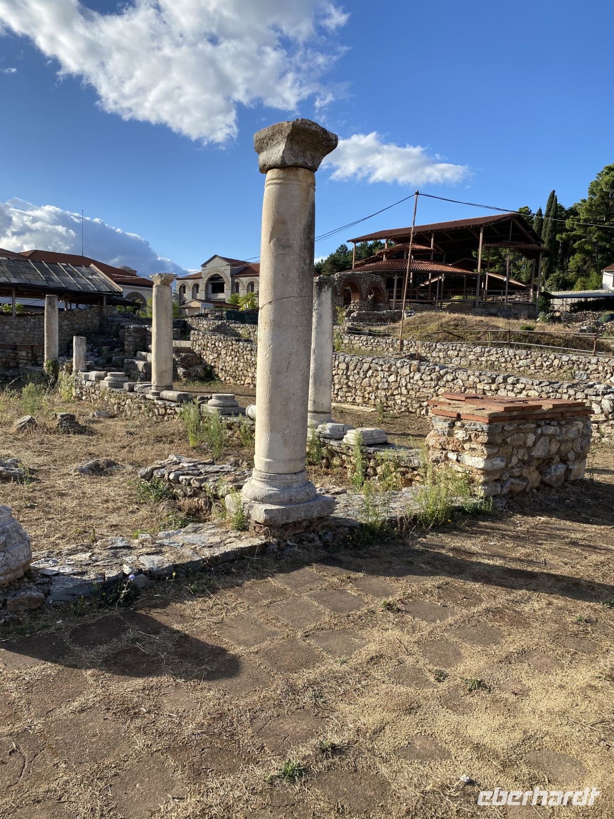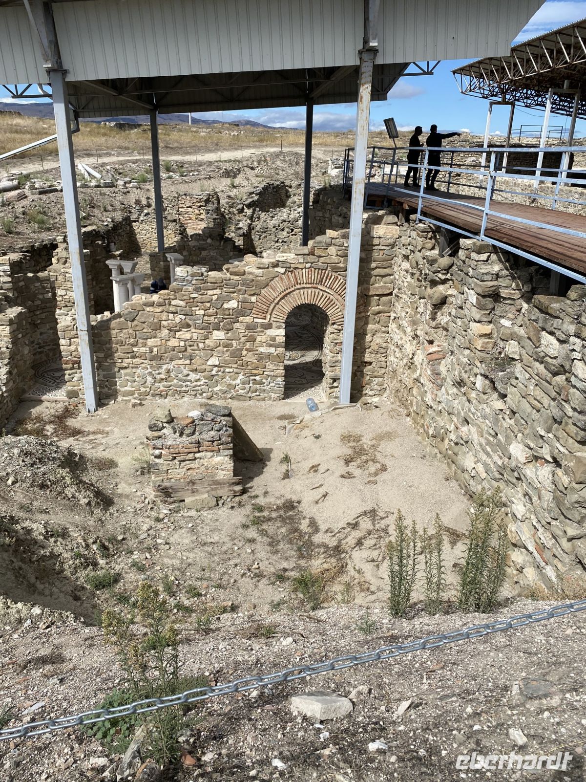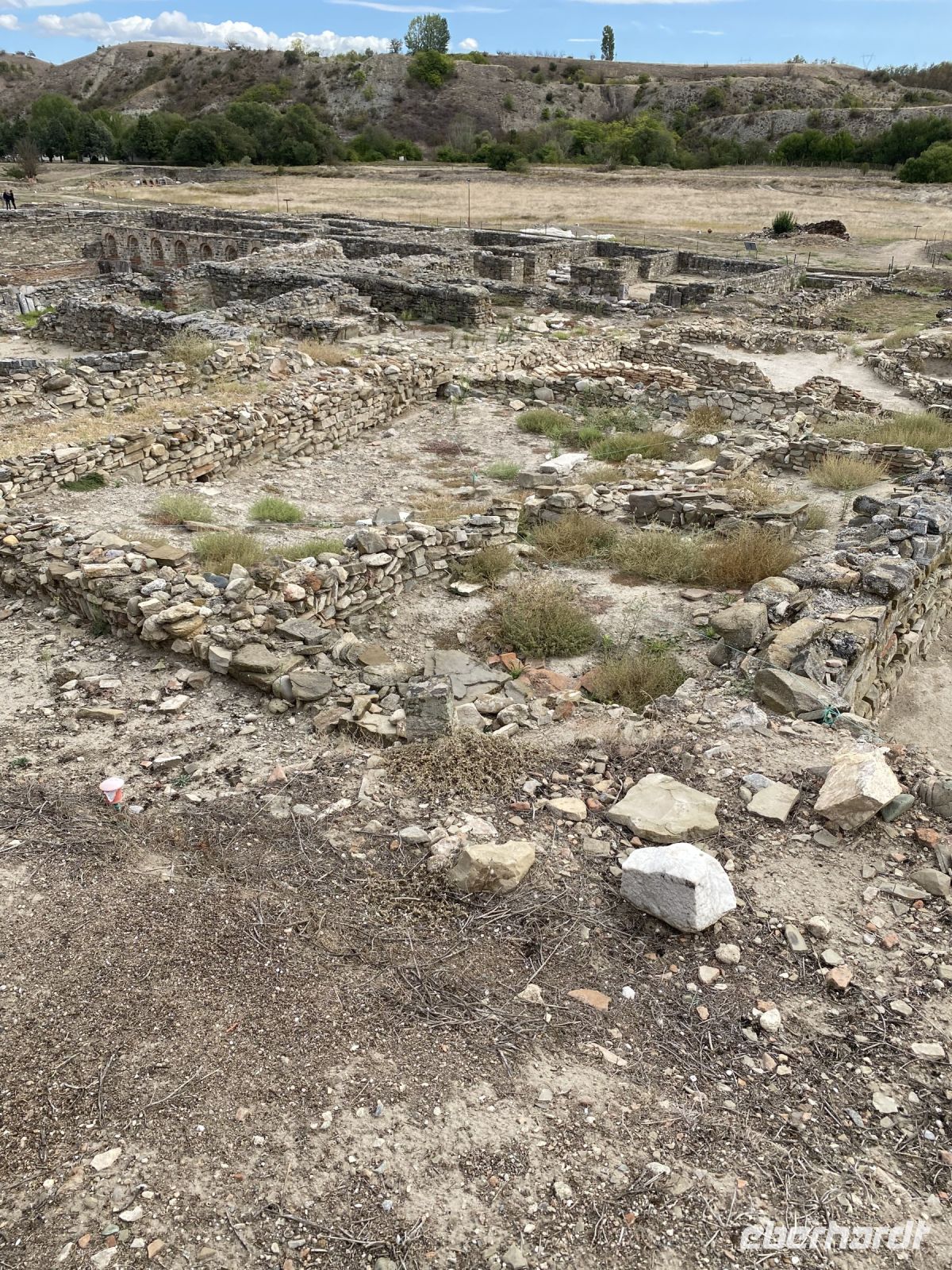 Kurze Zeit später erreichen wir Stobi, die zweite große Ausgrabungsstätte in Nordmazedonien. Auf 27 ha wurden die Reste einer römischen Stadt ausgegraben, man kann allerdings davon ausgehen, dass sie noch wesentlich größer war und sich noch viele Reste unter der Erde befinden. Wir sehen Teile der Stadtmauer, eine große Bischofsbasilika, Häuser reicher Bürger, ein Amphitheater, eine Taufkapelle mit wunderschönen Mosaiken.