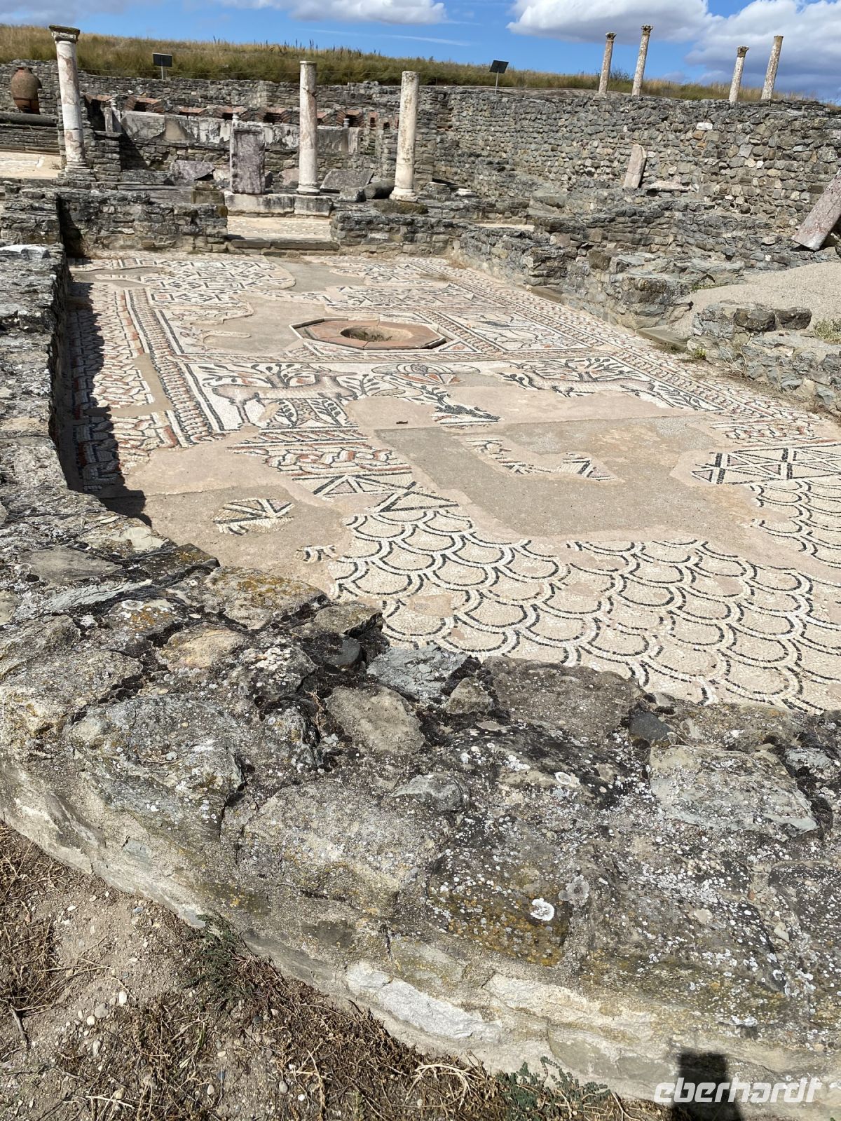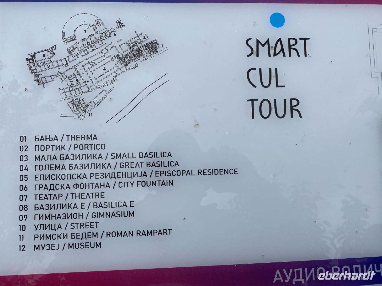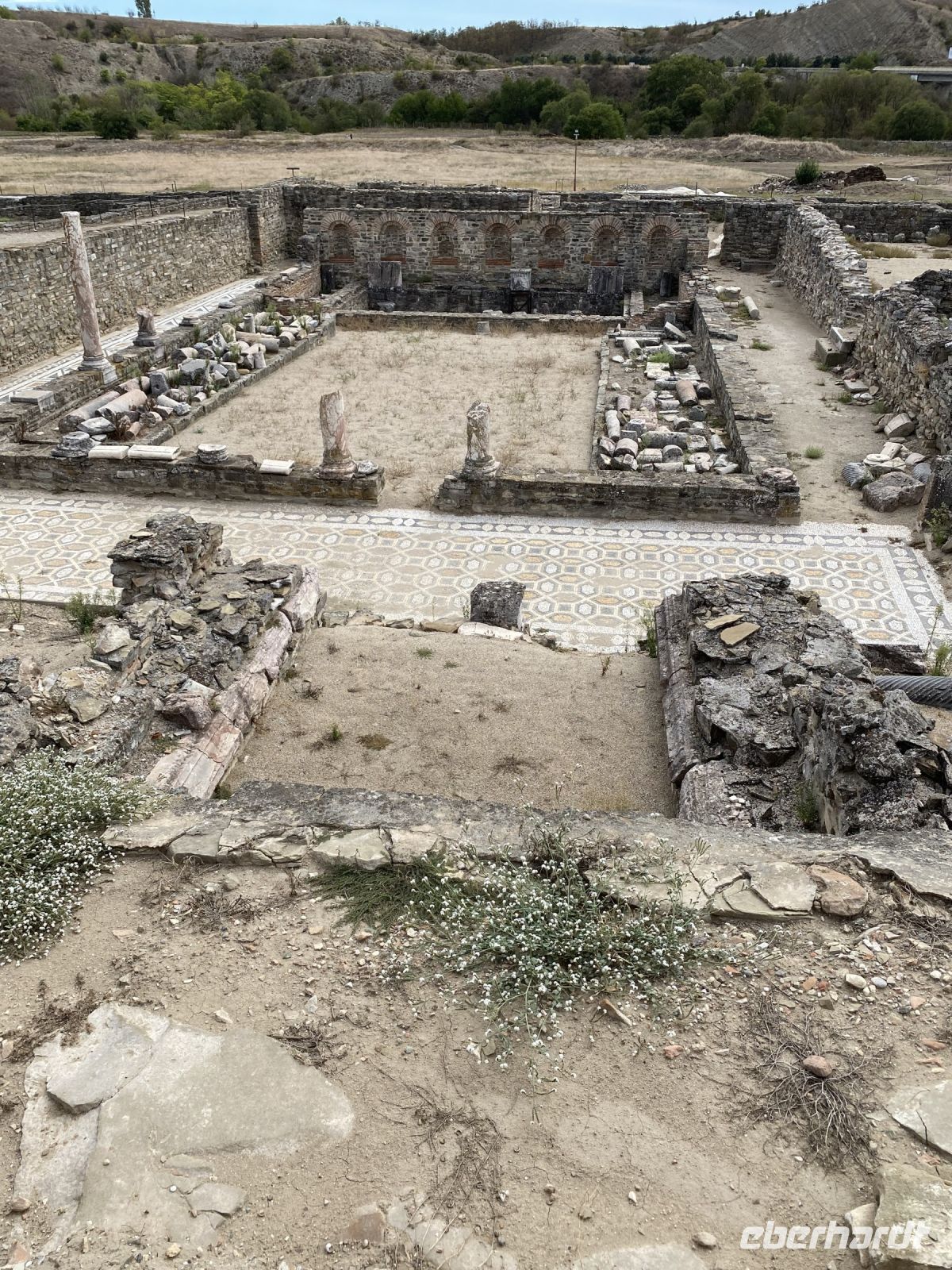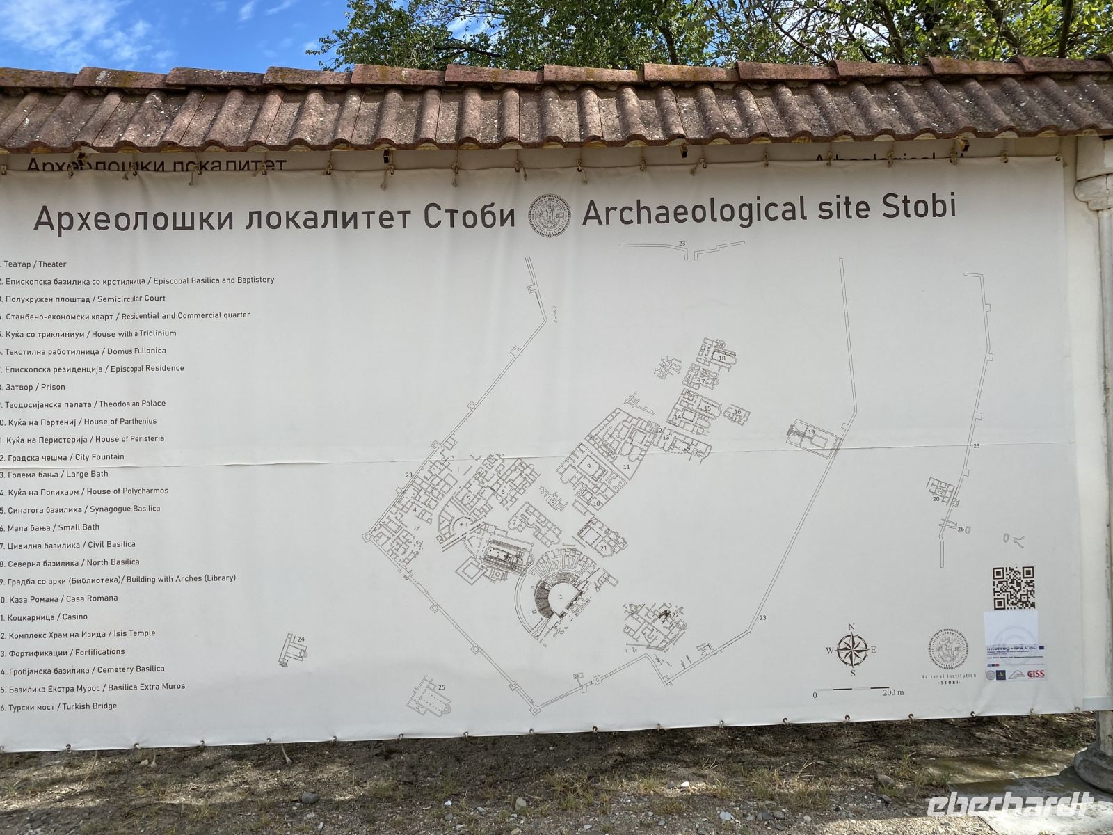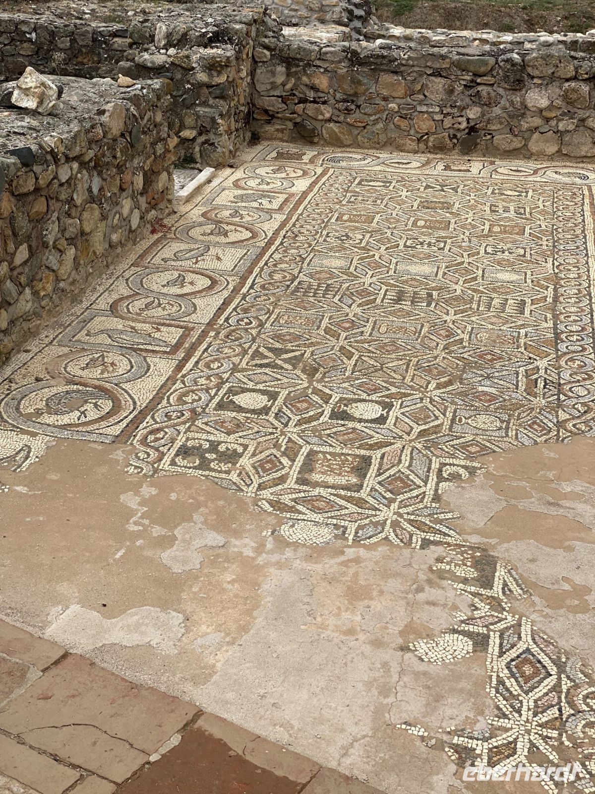 Kurze Zeit später erreichen wir Stobi, die zweite große Ausgrabungsstätte in Nordmazedonien. Auf 27 ha wurden die Reste einer römischen Stadt ausgegraben, man kann allerdings davon ausgehen, dass sie noch wesentlich größer war und sich noch viele Reste unter der Erde befinden. Wir sehen Teile der Stadtmauer, eine große Bischofsbasilika, Häuser reicher Bürger, ein Amphitheater, eine Taufkapelle mit wunderschönen Mosaiken.