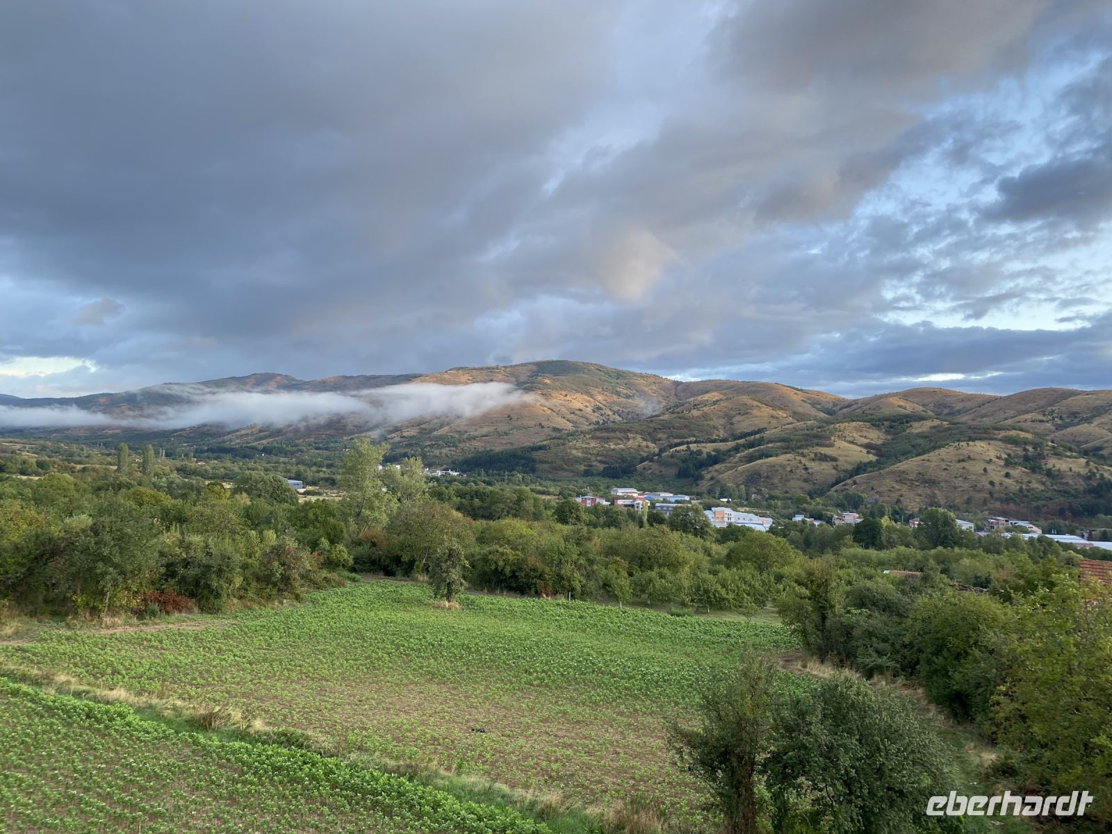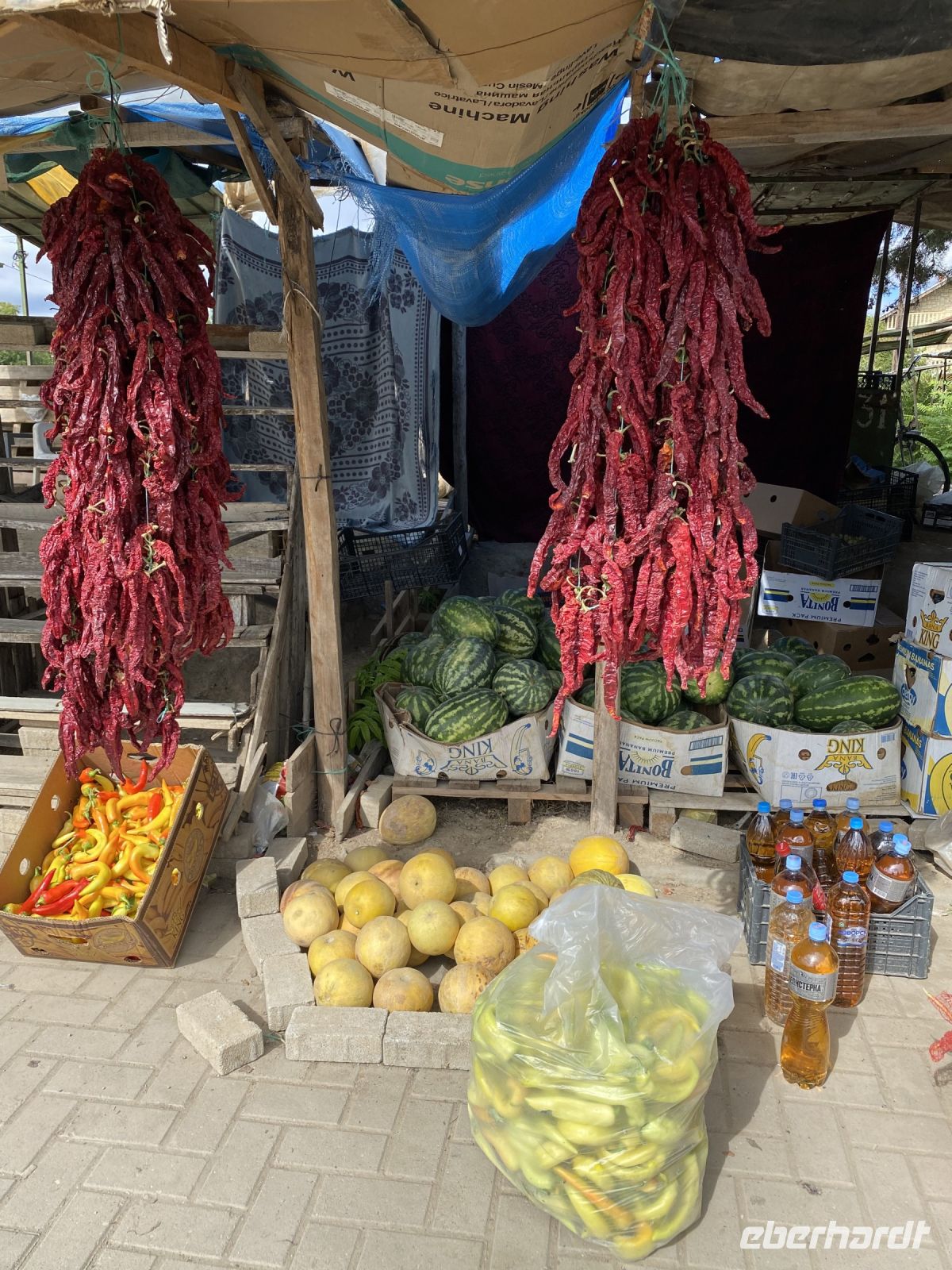 Zunächst fahren wir durch eine wichtige Tabakanbauregion um die Stadt Prilep, man sieht die Trockengestelle mit den Tabakblättern und die abgeernteten Felder. Auf ca. 900 m Höhe wird der Pass überquert, in Rosoman halten wir an den Gemüseständen an der Straße kurz an, es gibt viel Paprika, Bohnen und Äpfel.