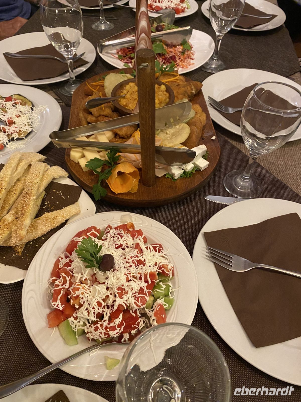 Der letzte Programmpunkt ist die Fahrt nach Skopje, wir beziehen das gleiche Hotel wie bei der Ankunft, haben etwas Zeit zum erfrischen und dann fahren wir mit dem Bus zum letzten gemeinsamen Abendessen. Es ist reichlich und schmackhaft, wir bewältigen es nicht ganz.