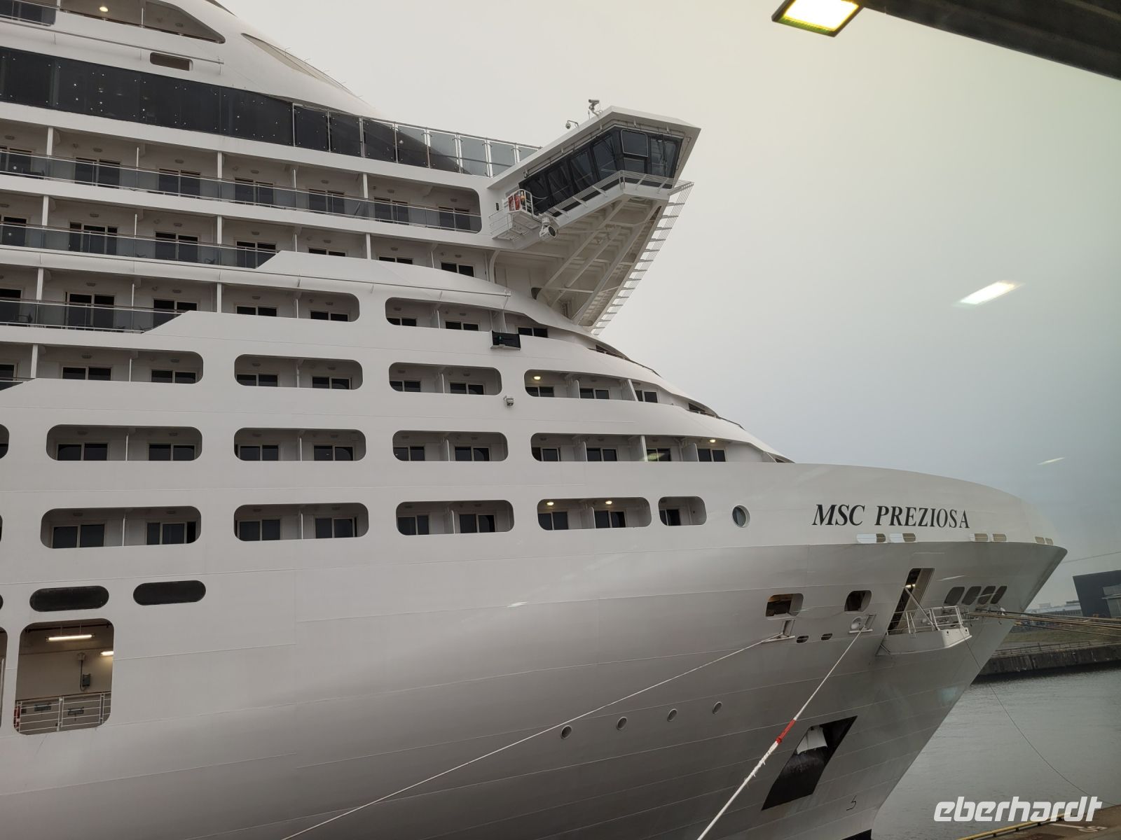 Startend vom Eberhardt Travel Firmensitz in Kesselsdorf, wohin erste Gäste bequem mit behindertenfreundlichen Fahrzeugen transferiert werden geht es Richtung Cruise Terminal Hamburg Steinwerder. Nachdem der Leipziger Flughafen passiert ist, dauert es nicht mehr lange bis die Gruppe komplett ist; sechzehn Gäste mit und ohne Rollstuhl freuen sich auf eine Woche Kreuzfahrt in Nordsee und Ärmelkanal. Ein unkomplizierter check-in und der Bezug der äußerst bequemen und bestens modifizierten Rollikabinen sind schnell absolviert. Beim Abendessen im eleganten Bedienrestaurant trifft sich die Gruppe zum ersten gemeinsamen Abendessen. Anschließend wohnen wir dem Auslaufen am Oberdeck oder auf den Balkonkabinen bei. Entlang der Elbe geht es Richtung Cuxhaven, wo die „MSC Preziosa“ dann die offene See erreicht.