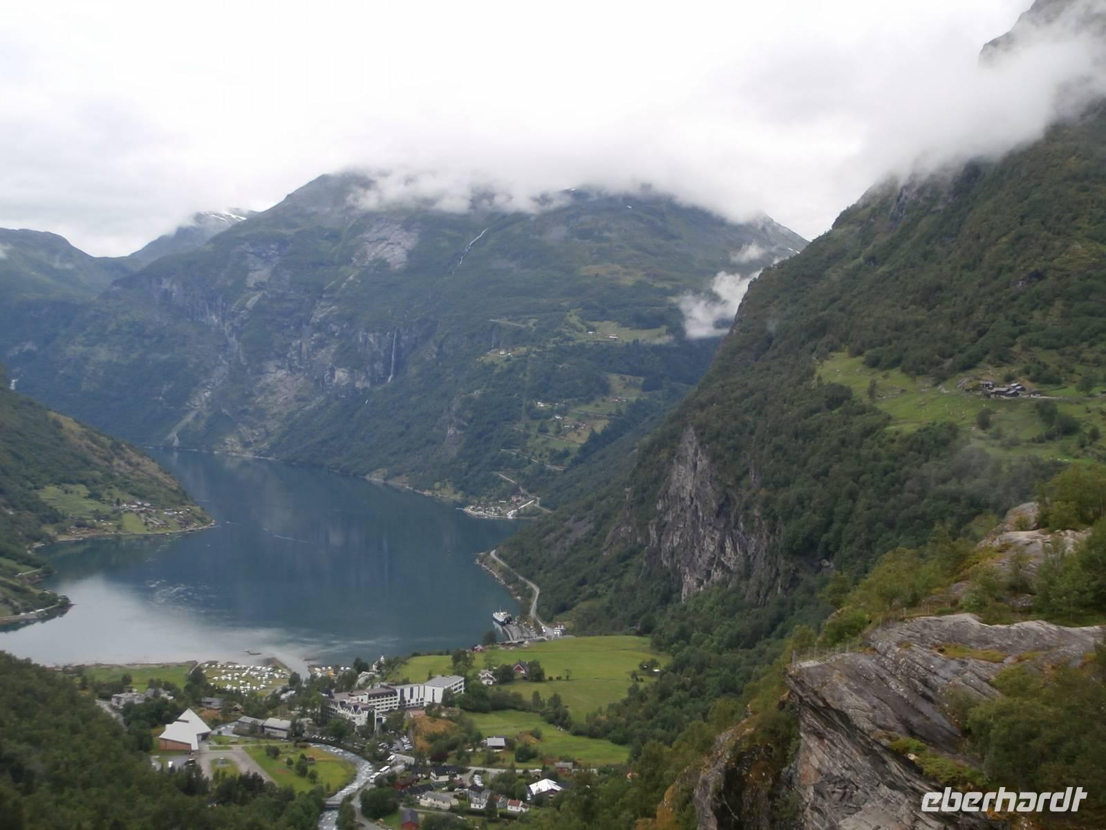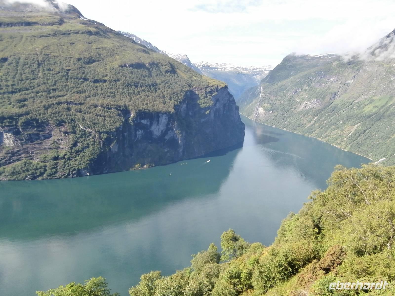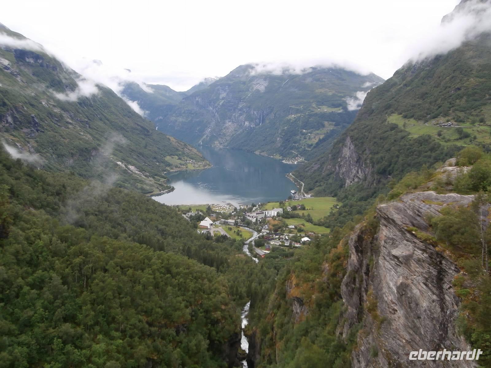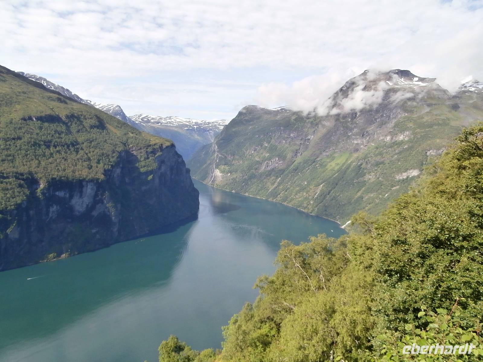 Als Erstes fahren wir von Gjovk wieder nach Hamar, um hier an der Olympiahalle Wikingship ein Foto zu schießen. Erster großer Höhepunkt unserer Reise ist heute der Besuch des Eisenbahnmuseums Norsk Jernbanemuseum in Hamar. Mit unserem fachkundigen Führer, der viele Eisenbahnstationen Deutschlands kennt, erleben wir zwei fantastische Stunden. Der schmalspurige Dampfzug, mit dem wir zu Beginn fahren wollten, war grad entgleist und so wurden wir Zeuge, wie man am Schienenstrang auch großen Schaden auslösen kann. Im Museumspark blicken wir in die Geschichte der Eisenbahn in Norwegen. Hier steht auch die Lok Dovregubben, gebaut von Krupp in Deutschland. In die Stadt der Olympiade 1994, nach Lillehammer, fahren wir im Anschluss. Wir erkunden die Schanzenanlagen und können auch noch Skispringer bei trockenem Wetter in Aktion erleben. Weiter geht es auf der E6 in Richtung Norden durch Norwegens bekanntes Tal, das Gudbrandsdal, es ist Schauplatz vieler alter Legenden, von Kunst und Kultur, hier verläuft auch der Peer Gynt Veggen. In Otta verlassen wir die nordwärts führende E6 und richten unseren Blick gen West, in Lom legen wir einen Fotostopp an der fantastischen Stabkirche ein. Über Dönfoss und das Grotligebirge erreichen wir am Abend Geiranger und heute nächtigen wir vor der Kulisse des Geirangerfjordes inmitten dieser beeindruckenden Bergwelt.